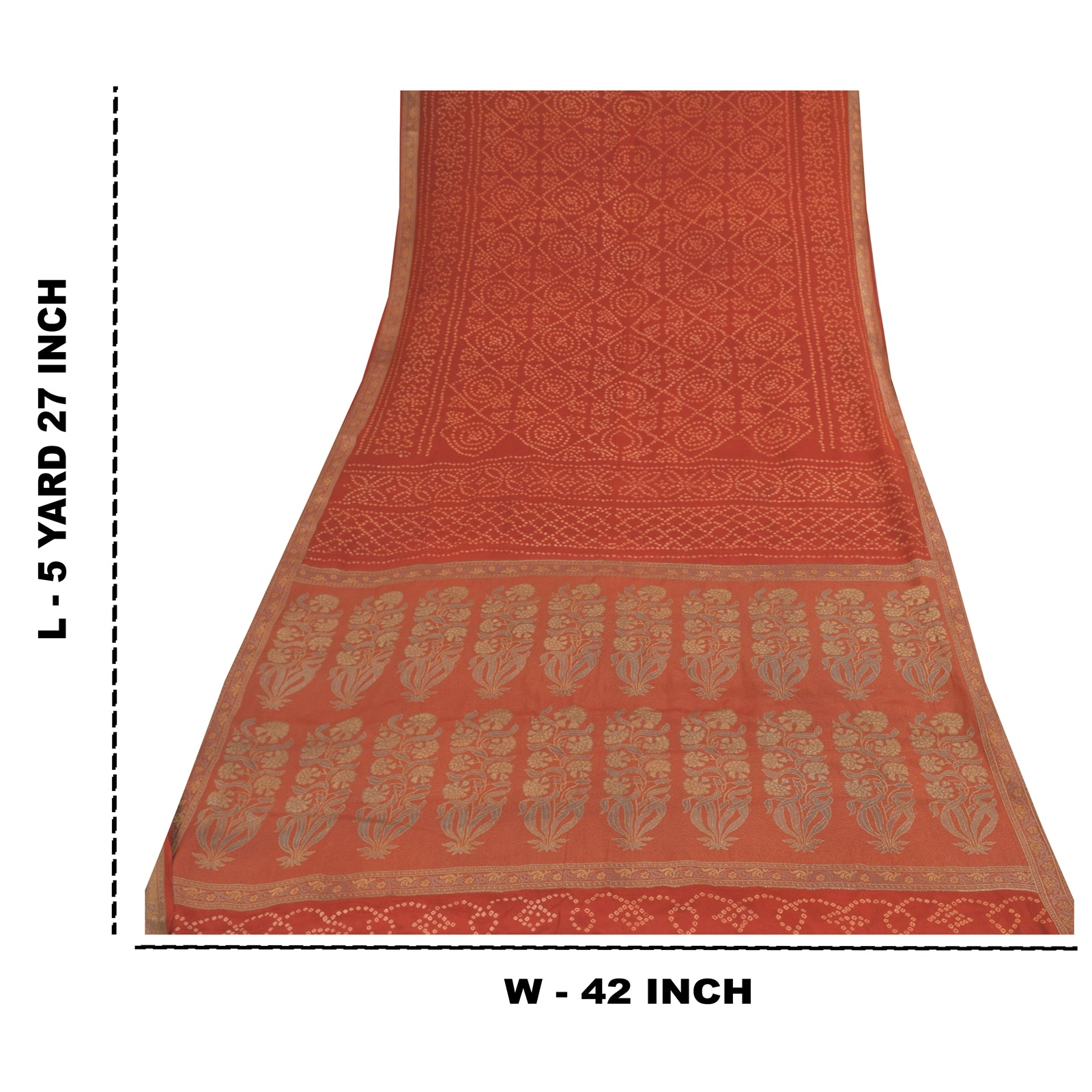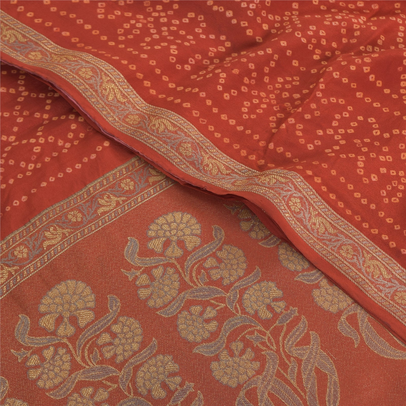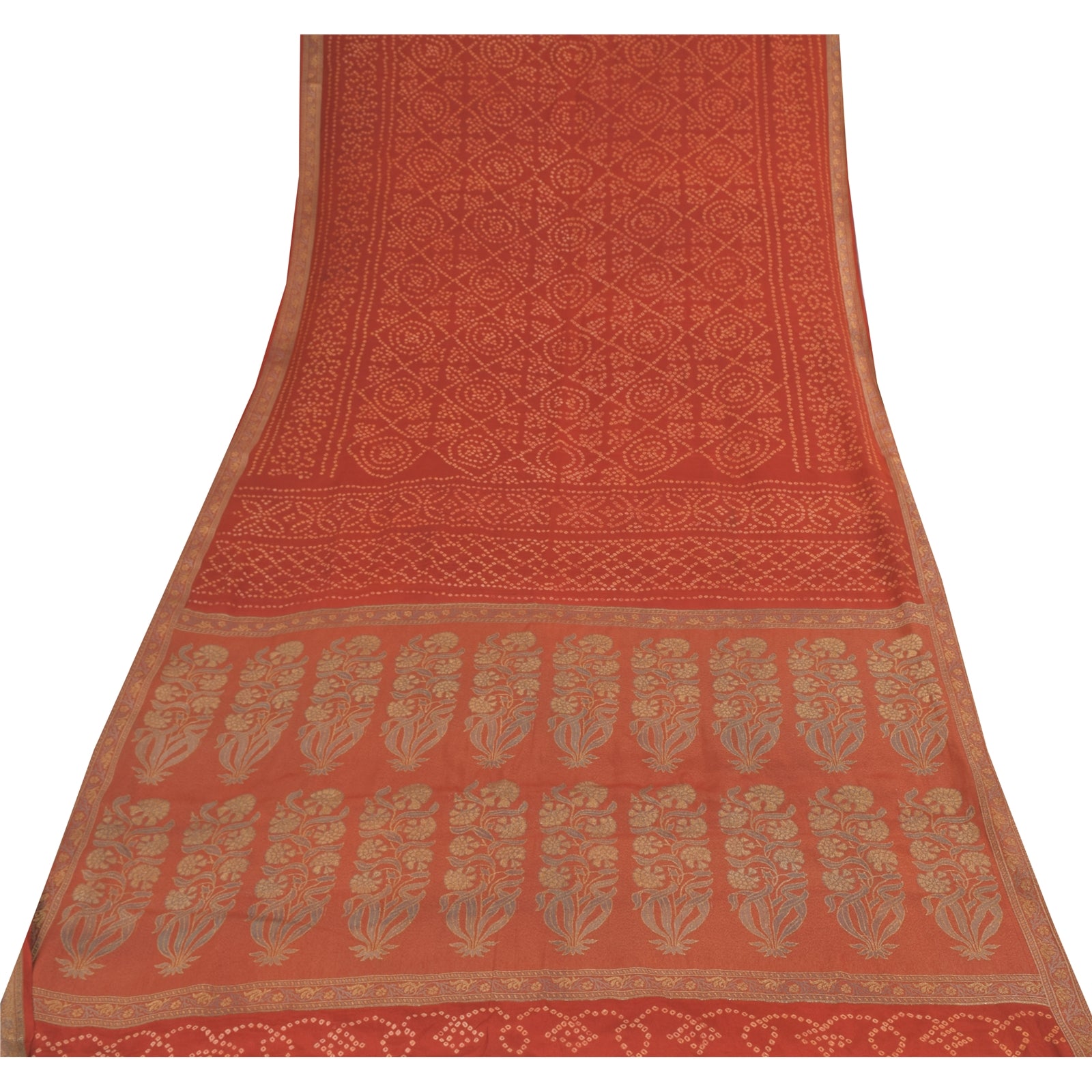 THE ITEM COLOR OR SHADE MAY BE DARKER OR LIGHTER THAN THE PICTURE.' • Beautiful rusty orange colored bandhani printed & woven pure crepe silk saree . • Pallu & Border has floral design with woven work. • Printed floral design with geometric pattern in center part of sari . This unique vintage saree can be used for various crafting ideas even if you don't want to use it as a sari. Design a dress, use it as a as window dressing, upholstery, sarongs, throw, dress making and table linen much more. Let your creative juices flow and use this decorated Sustainable Fabric in multiple fashion. International buyers please note: Import duties, taxes, and charges are not included in the item price or postage cost. These charges are the buyer's responsibility. Please check with your country's customs office to determine what these additional costs will be prior to bidding or buying.Buyer will pay custom duty/tax. It is calculated and charged differently by every country. As a seller I do not have any control over it. VAT or sales tax is calculated by the platform at the time of checkout. Customs charge is payable at the time of delivery.
