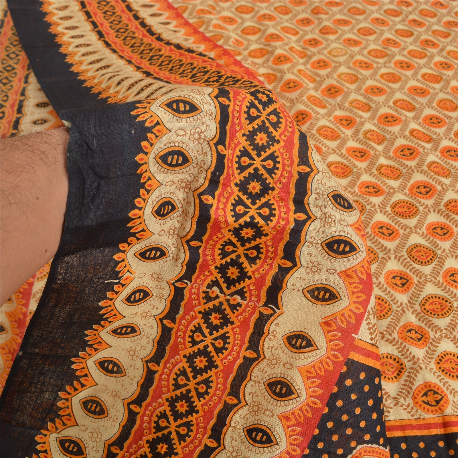 Sanskriti Vintage Sarees Orange Indian Pure Cotton Printed Sari 5yd Craft Sustainable Fabric