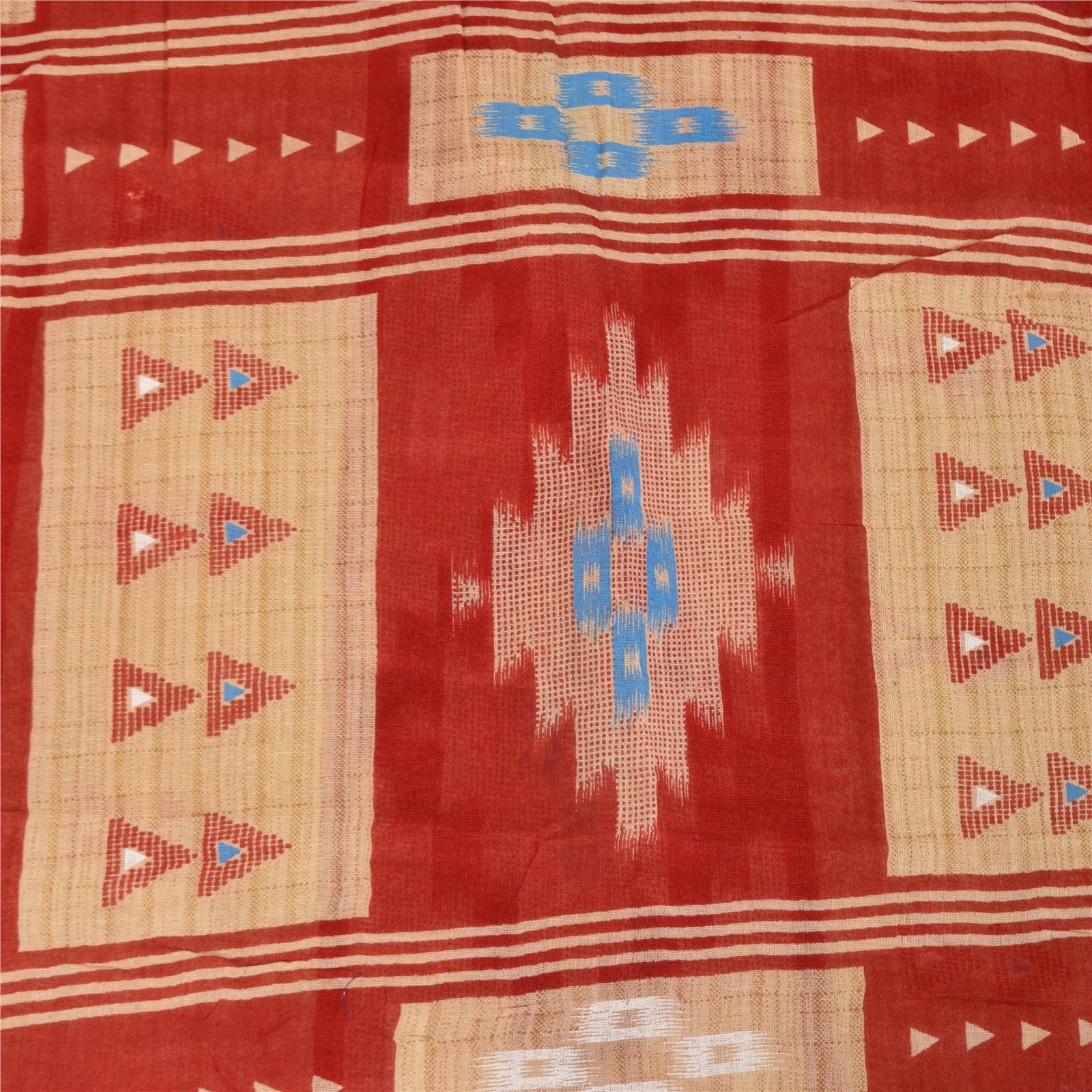 Sanskriti Vintage Sarees Peach/Red Pure Cotton Ikat Printed Sari 5+yd Sustainable Fabric