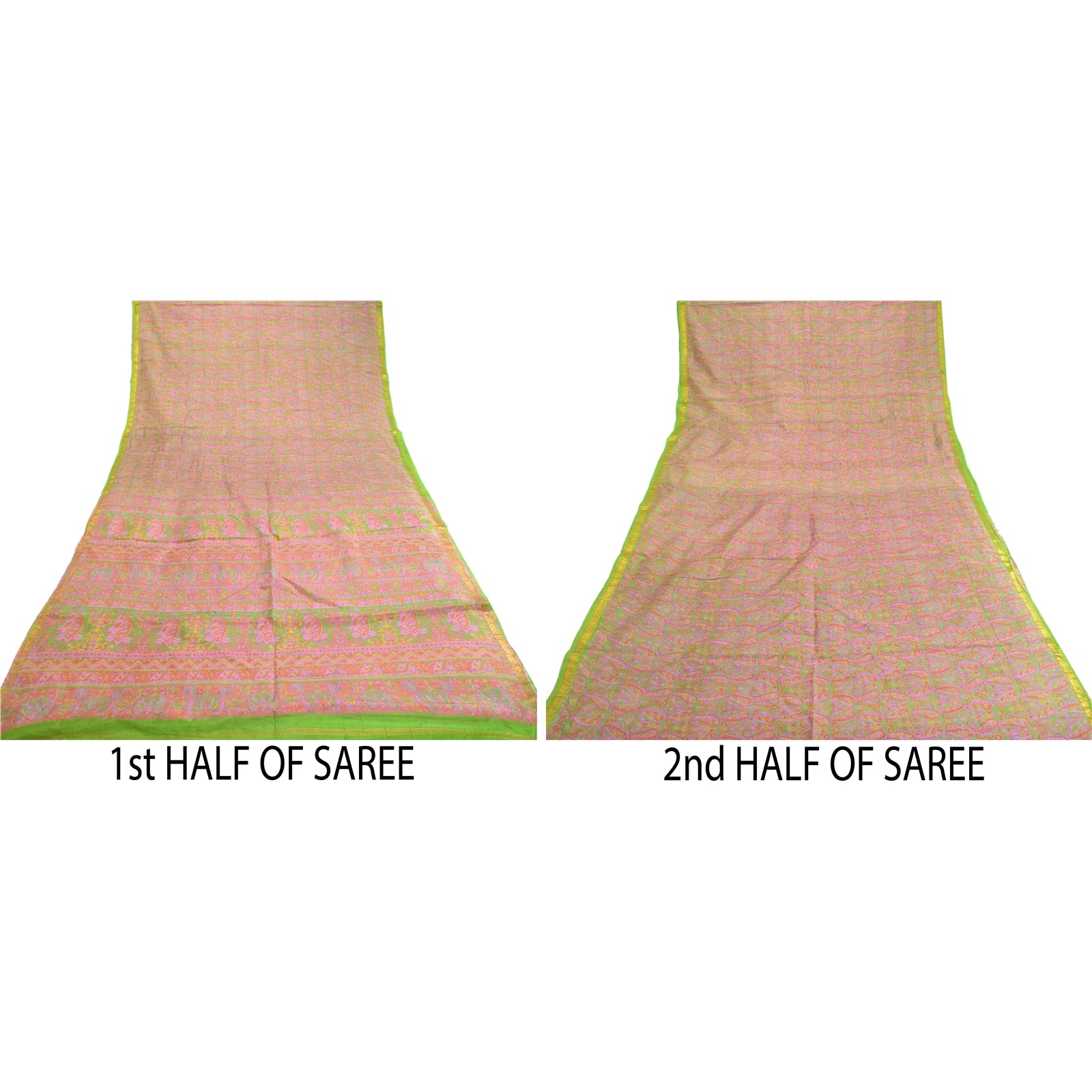 Beautiful pink & green colored pure silk printed saree. Pallu & Border has printed floral design & golden zari woven work. Similar design in center part of saree. What is special about this saree? Fabulous design is really enhancing the beauty of the saree.This unique vintage saree can be used for various crafting ideas even if you don't want to use it as a sari. Design a dress, use it as window,dressing, upholstery, sarongs, throw, dress making and table linen much more. Let your creative juices flow and use this decorated Sustainable Fabric in multiple fashion. It feels soft against the skin, Sustainable Fabric is a stiff