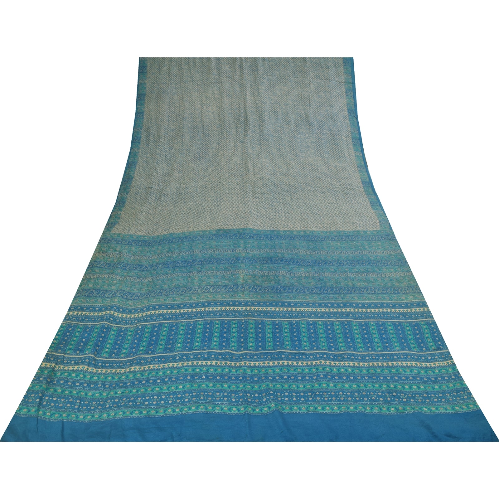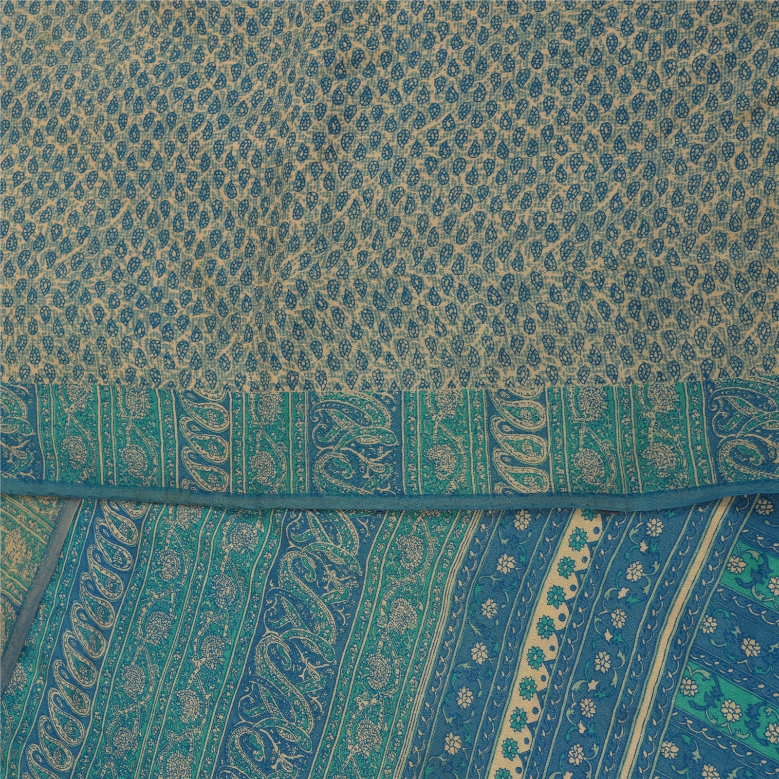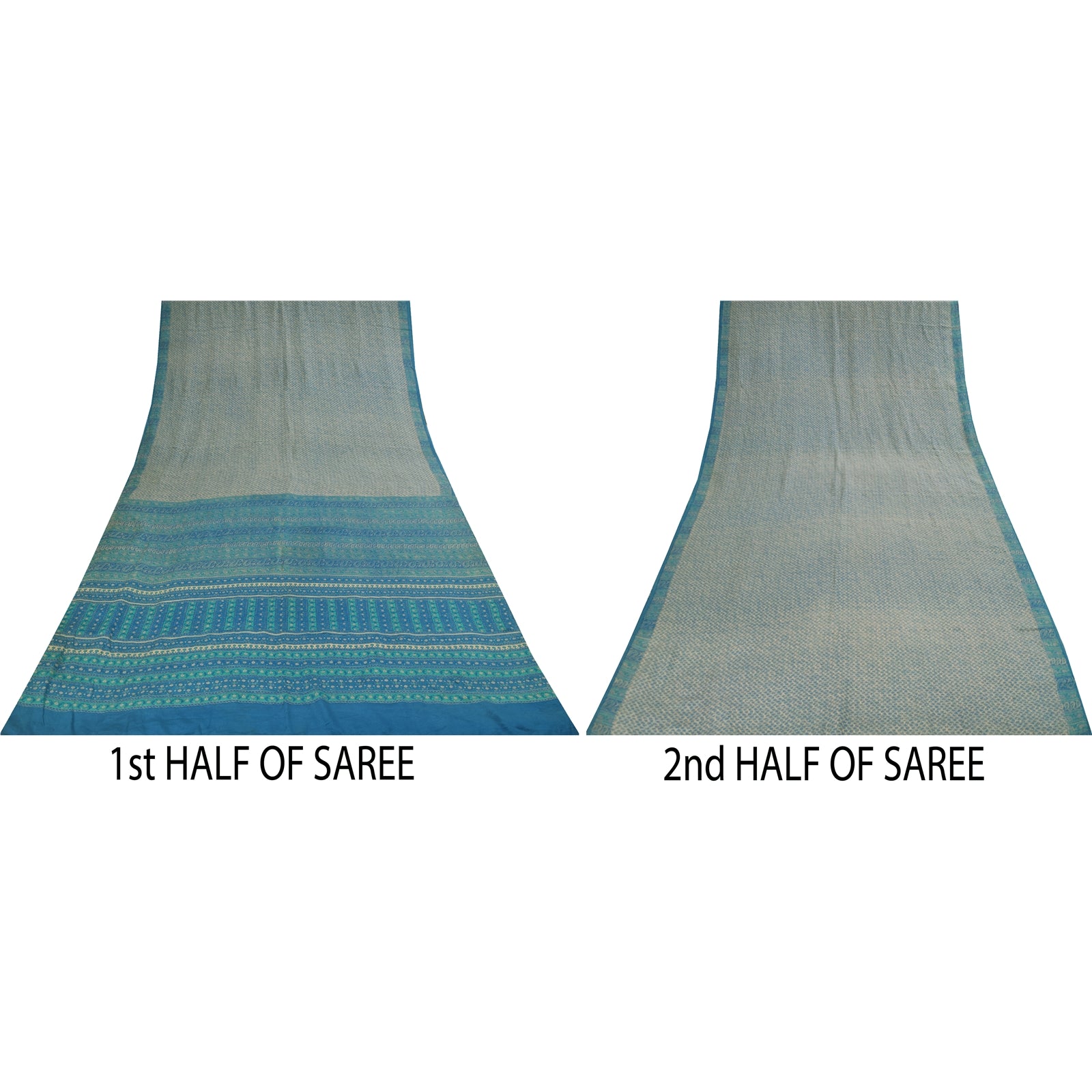 Sanskriti Vintage Sarees Pure Crepe Ivory & Blue Printed Sari 5+yd Craft Fabric