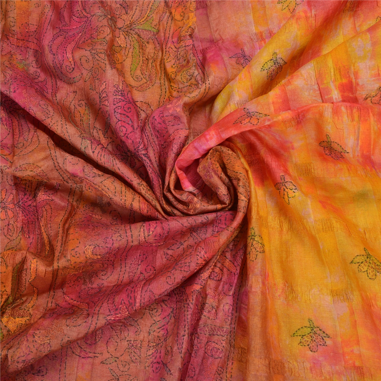 Beautiful Multi Color Colored 100% Pure Silk Hand Embroidered Kantha & Tie-Dye Sari. Pallu & Border features traditional kantha embroidery running stitches with floral & paisley design. You can see similar thread work & tie-dye work in center portion of the saree. What is special about this saree? KANTHA:Kantha is a hand embroidery style traditionally practiced by rural womenfolk in state of West Bengal. Kantha embroidery is recognized by running stitches. The usual Kantha stitch is done in straight or horizontal lines but artistic Kantha styles emerged over time where floral or religious symbols were also depicted in Kantha embroidery. Kantha is mostly practiced on pure silk, Crepe or Cotton Saris. A single Kantha sari can take as many as 4-5 days of work for 5-6 women of a house working together. For USA buyers - Single item ships via registered air mail, buy 1 more to get FedEx.