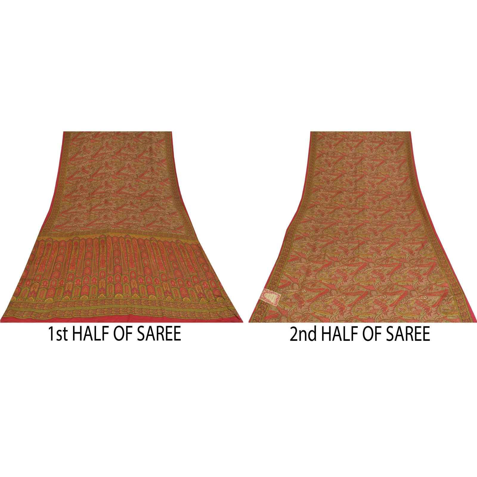 Sanskriti Vintage Sarees Red 100% Pure Crepe Silk Printed Sari 5+yd Craft Sustainable Fabric