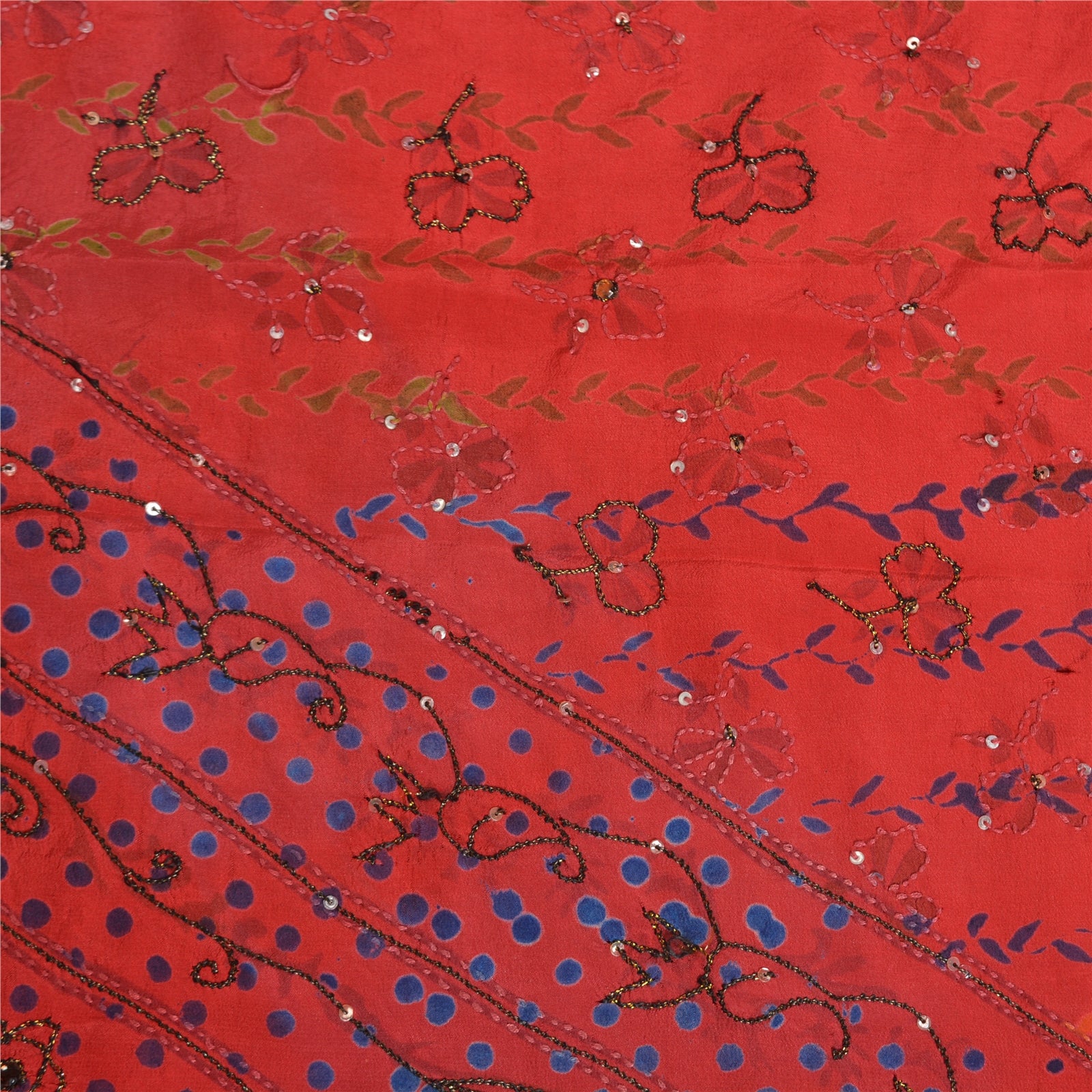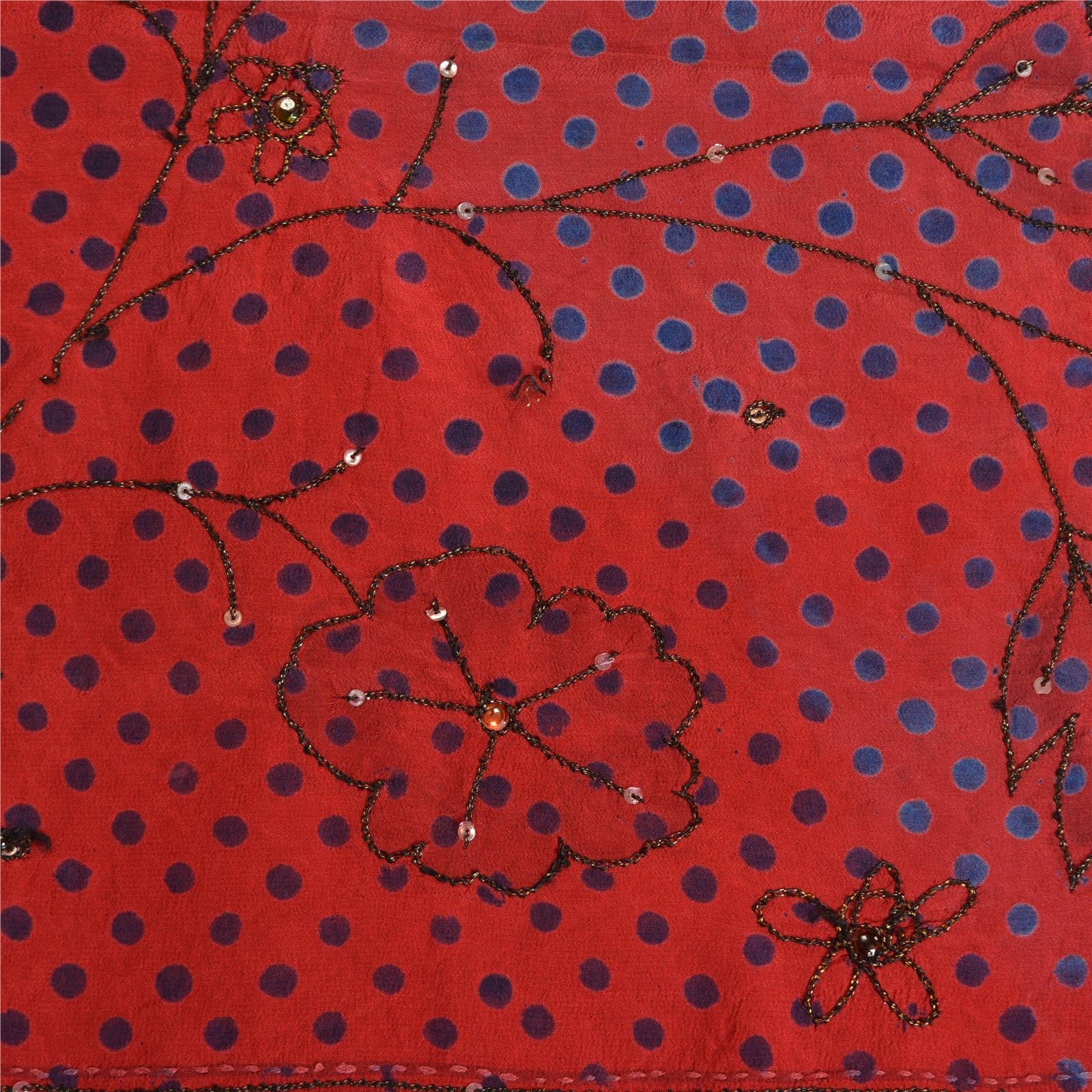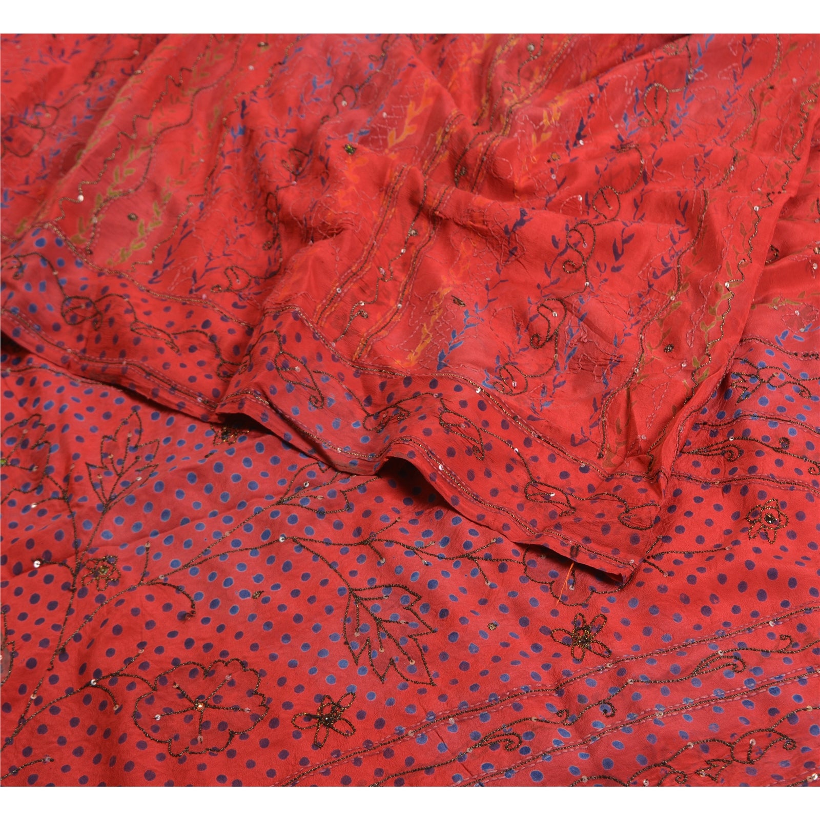 Sanskriti Vintage Sarees Red Hand Beaded Pure Crepe Silk Print Sari Craft Sustainable Fabric