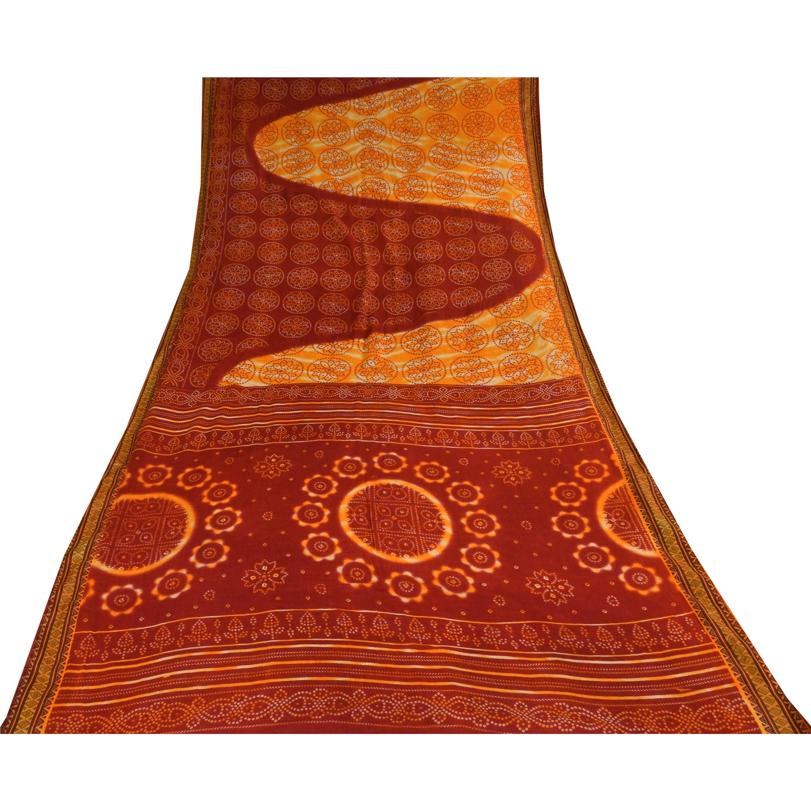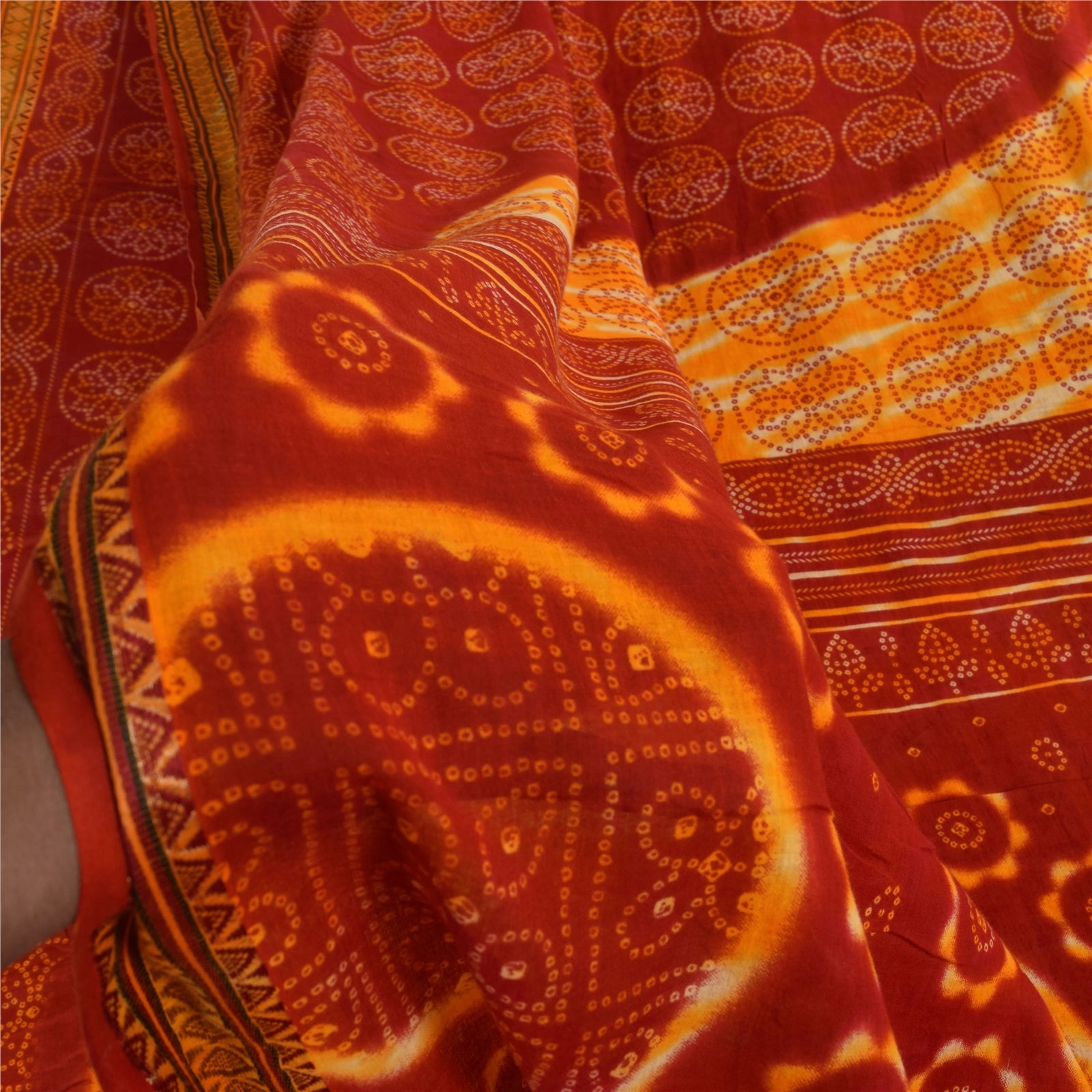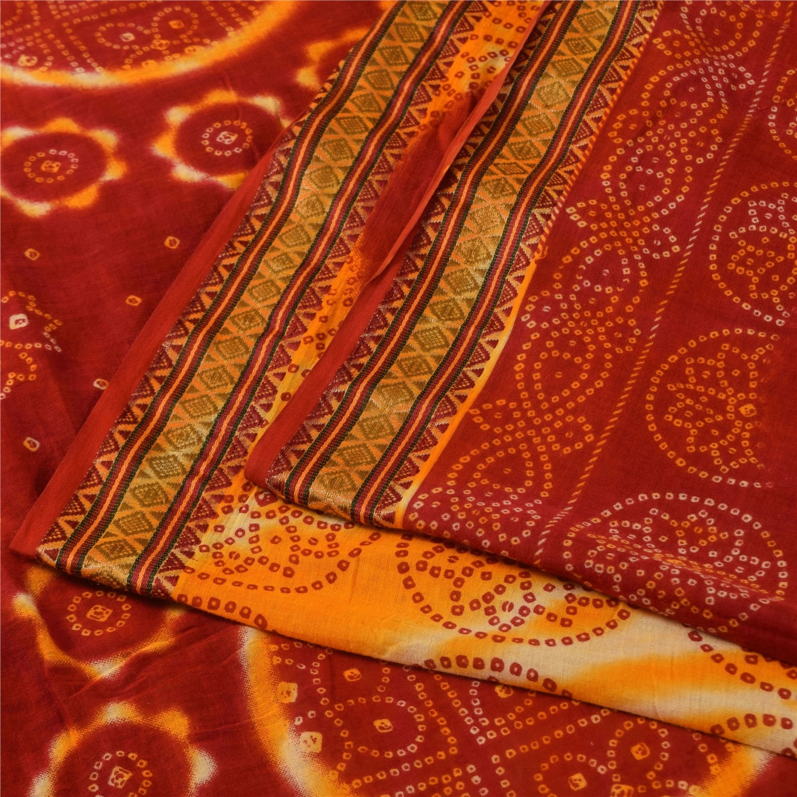 THE ITEM COLOR OR SHADE MAY BE DARKER OR LIGHTER THAN THE PICTURE. Attractive red & yellow colored pure cotton bandhani printed sari. Pallu & Border has printed floral design with geometric pattern . Similar design in center part of saree.. This unique vintage saree can be used for various crafting ideas even if you don't want to use it as a sari. Design a dress, use it as a as window dressing, upholstery, sarongs, throw, dress making and table linen much more. Let your creative juices flow and use this decorated Sustainable Fabric in multiple fashion. Shipping Note: 'International buyers please note: Import duties, taxes, and charges are not included in the item price or postage cost. These charges are the buyer's responsibility. Please check with your country's customs office to determine what these additional costs will be prior to bidding or buying. Buyer will pay custom duty/tax. It is calculated and charged differently by every country. As a seller I do not have any control over it. VAT or sales tax is calculated by the platform at the time of checkout. Customs charge is payable at the time of delivery.' PCS-6423