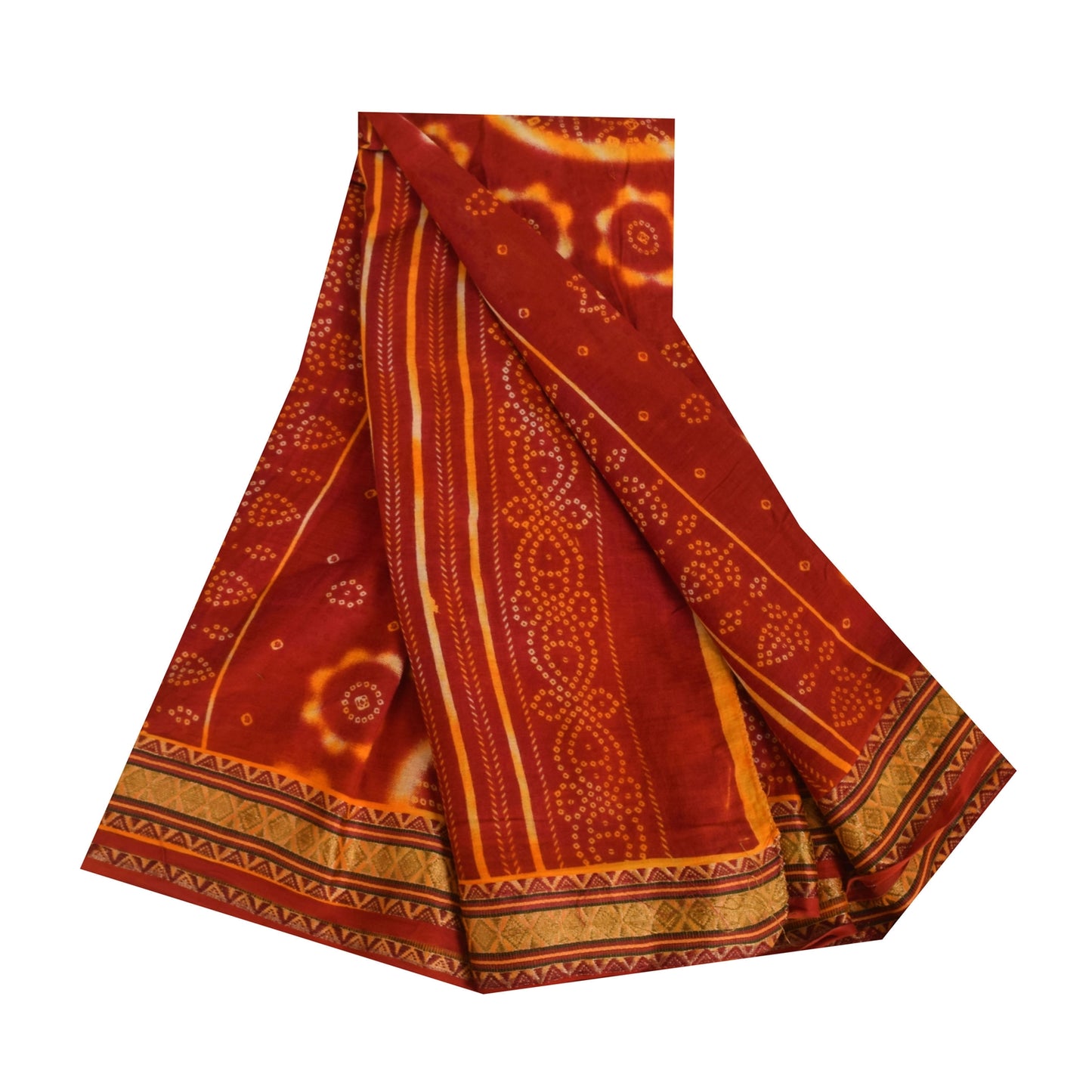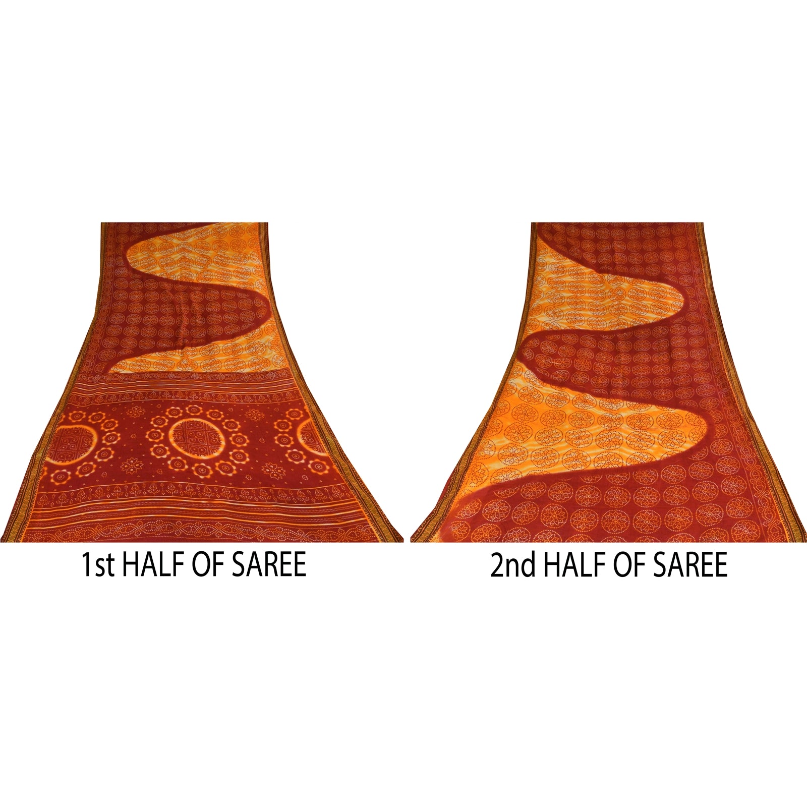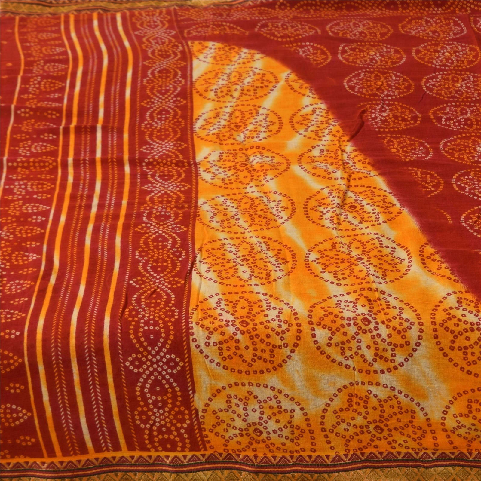 THE ITEM COLOR OR SHADE MAY BE DARKER OR LIGHTER THAN THE PICTURE. Attractive red & yellow colored pure cotton bandhani printed sari. Pallu & Border has printed floral design with geometric pattern . Similar design in center part of saree.. This unique vintage saree can be used for various crafting ideas even if you don't want to use it as a sari. Design a dress, use it as a as window dressing, upholstery, sarongs, throw, dress making and table linen much more. Let your creative juices flow and use this decorated Sustainable Fabric in multiple fashion. Shipping Note: 'International buyers please note: Import duties, taxes, and charges are not included in the item price or postage cost. These charges are the buyer's responsibility. Please check with your country's customs office to determine what these additional costs will be prior to bidding or buying. Buyer will pay custom duty/tax. It is calculated and charged differently by every country. As a seller I do not have any control over it. VAT or sales tax is calculated by the platform at the time of checkout. Customs charge is payable at the time of delivery.' PCS-6423