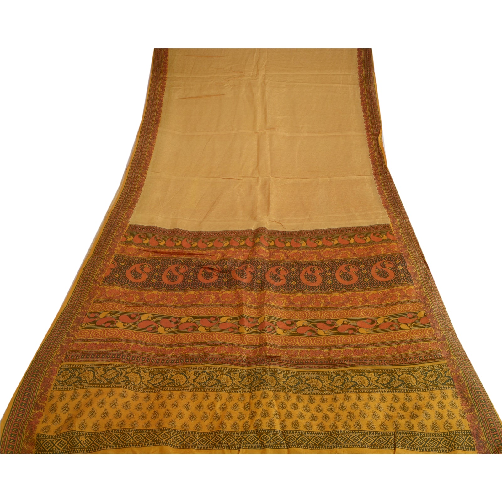 Sanskriti Vintage Sarees Saffron Woven/Printed Pure Silk Sari 5yd Craft Sustainable Fabric