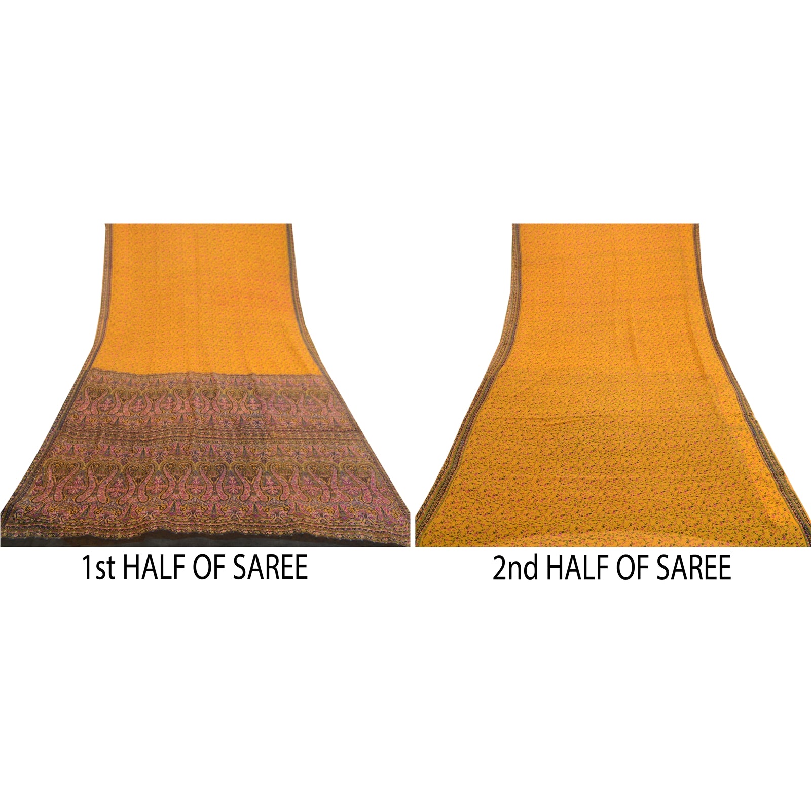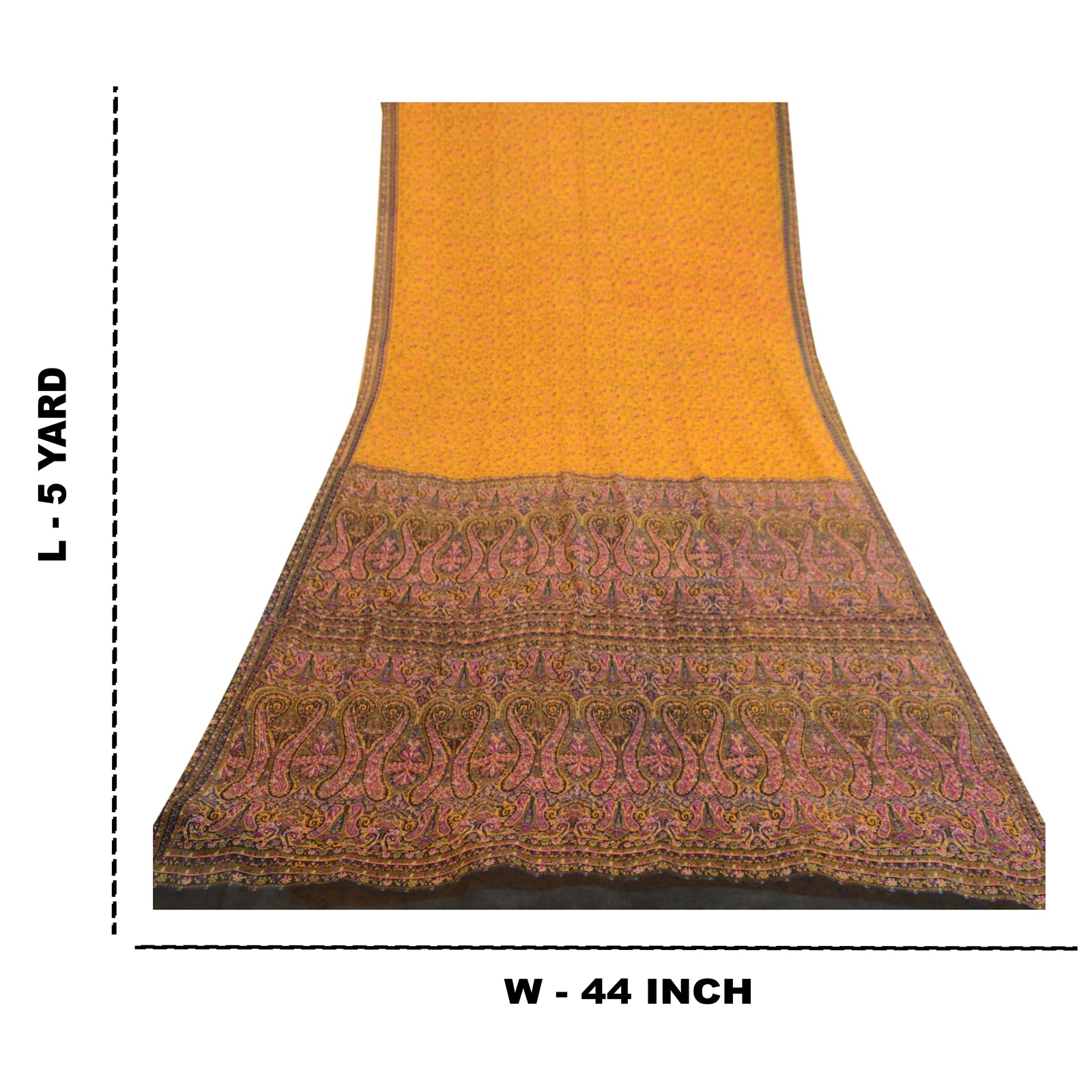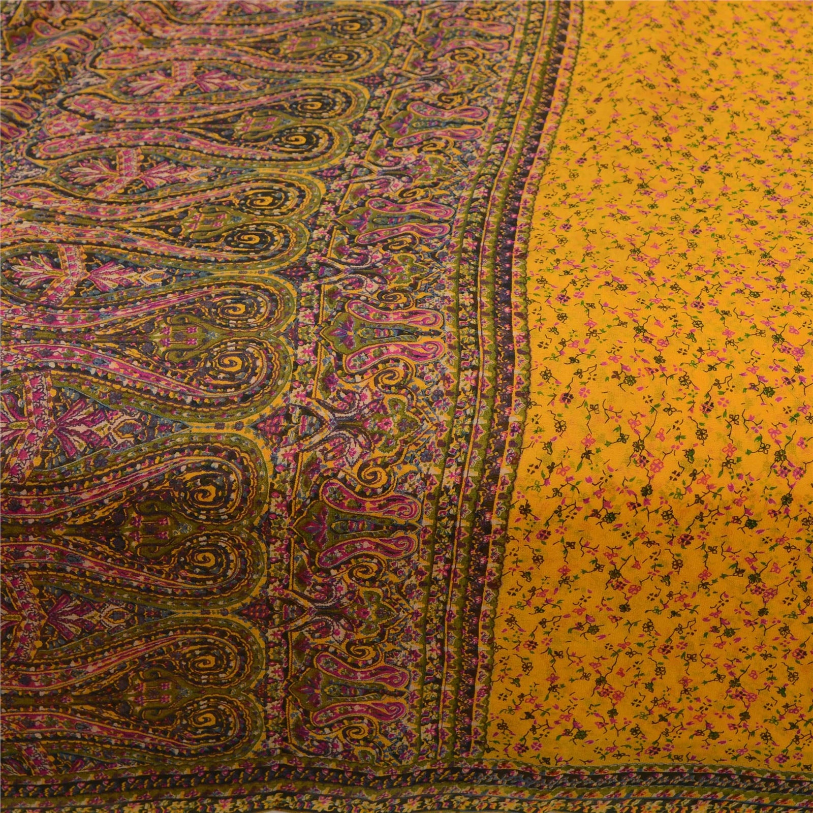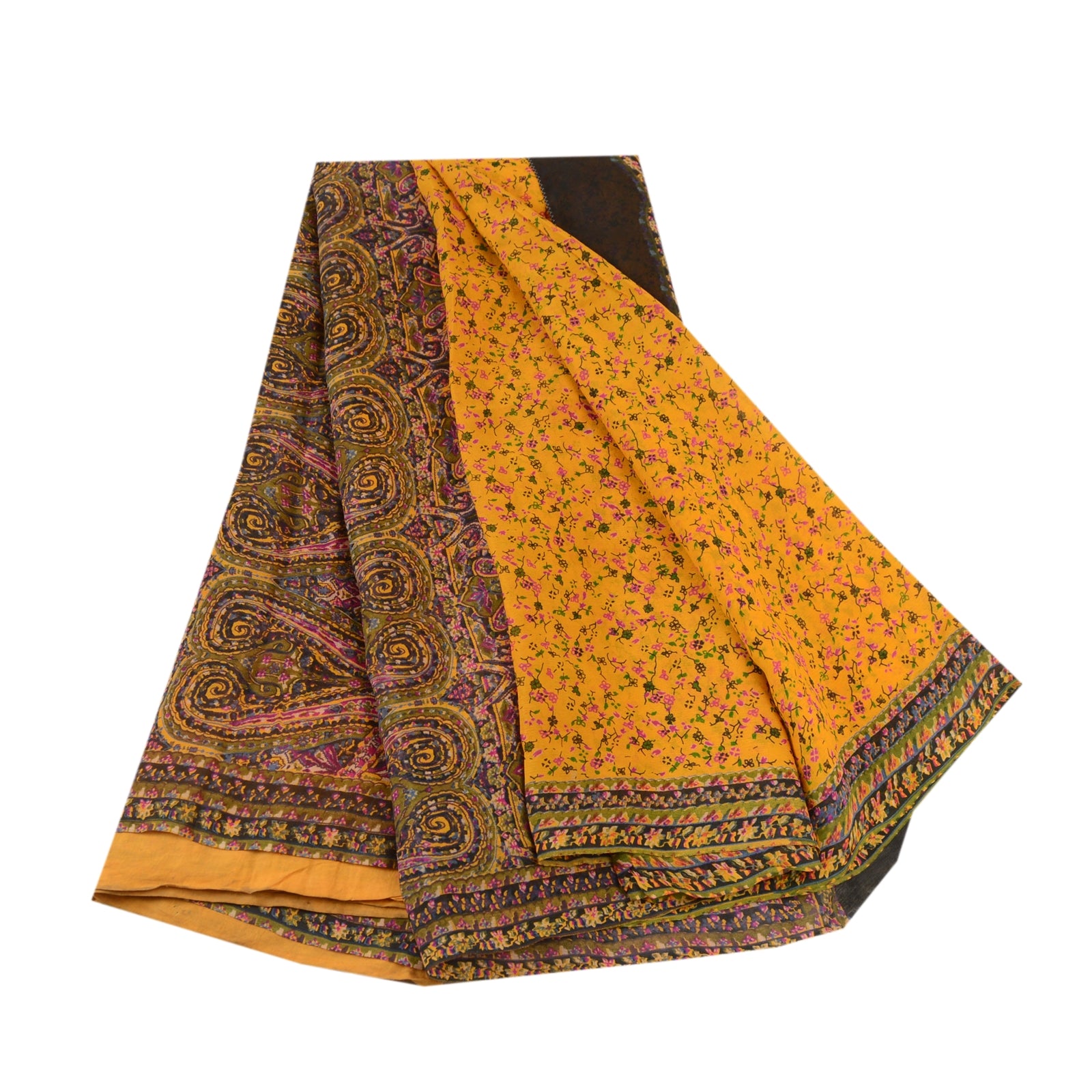 Sanskriti Vintage Sarees Yellow Pure Silk Printed Sari 5YD Floral Craft Sustainable Fabric