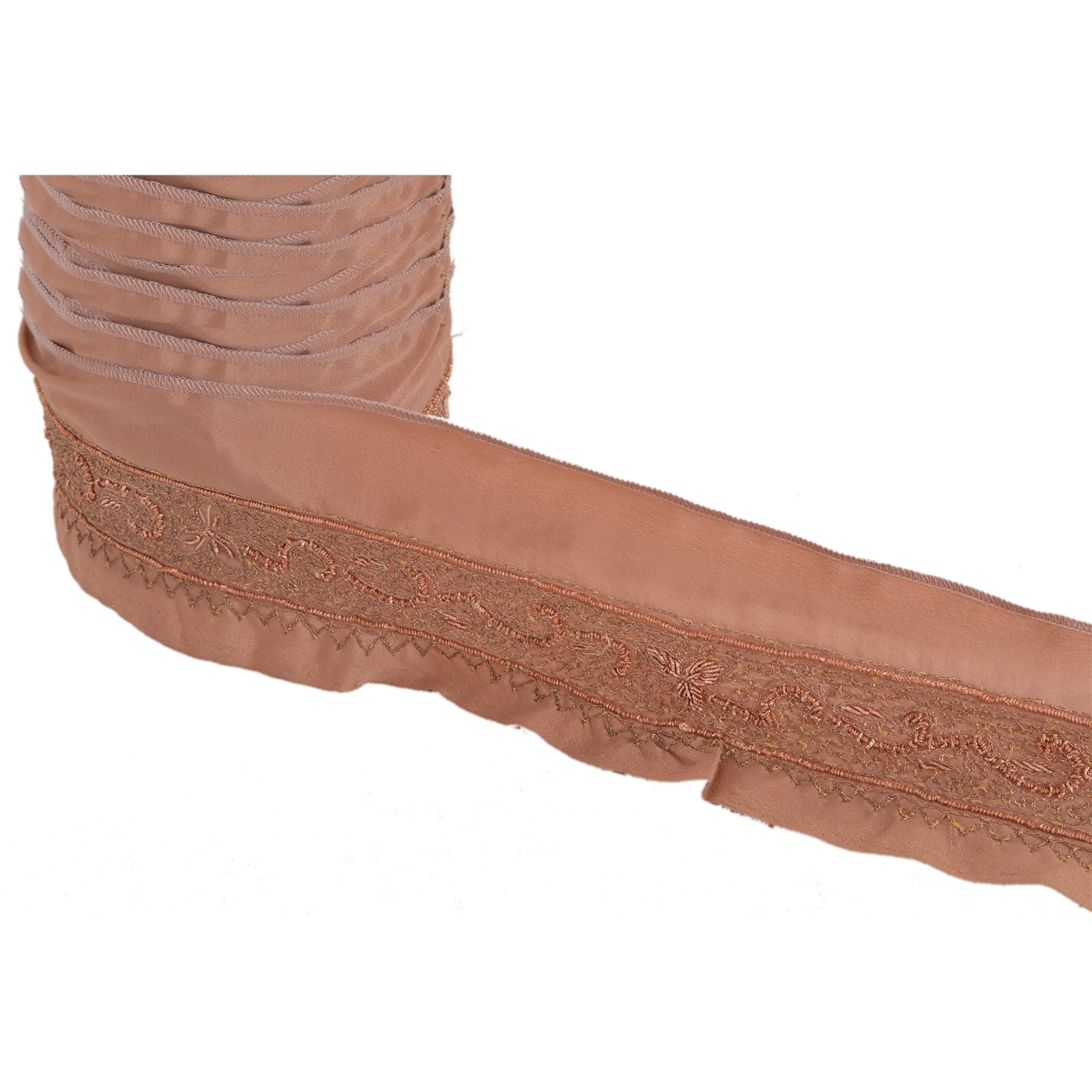 Beautiful crepe silk hand embroidered sari border in peach color highlighting zardozi work. Border has beautiful floral patterns painstakingly hand embroidered with gold zari work, copper color zardozi/dabka work WOW!! an awesome one of a kind versatile border. 1 Quantity = 1 Yard