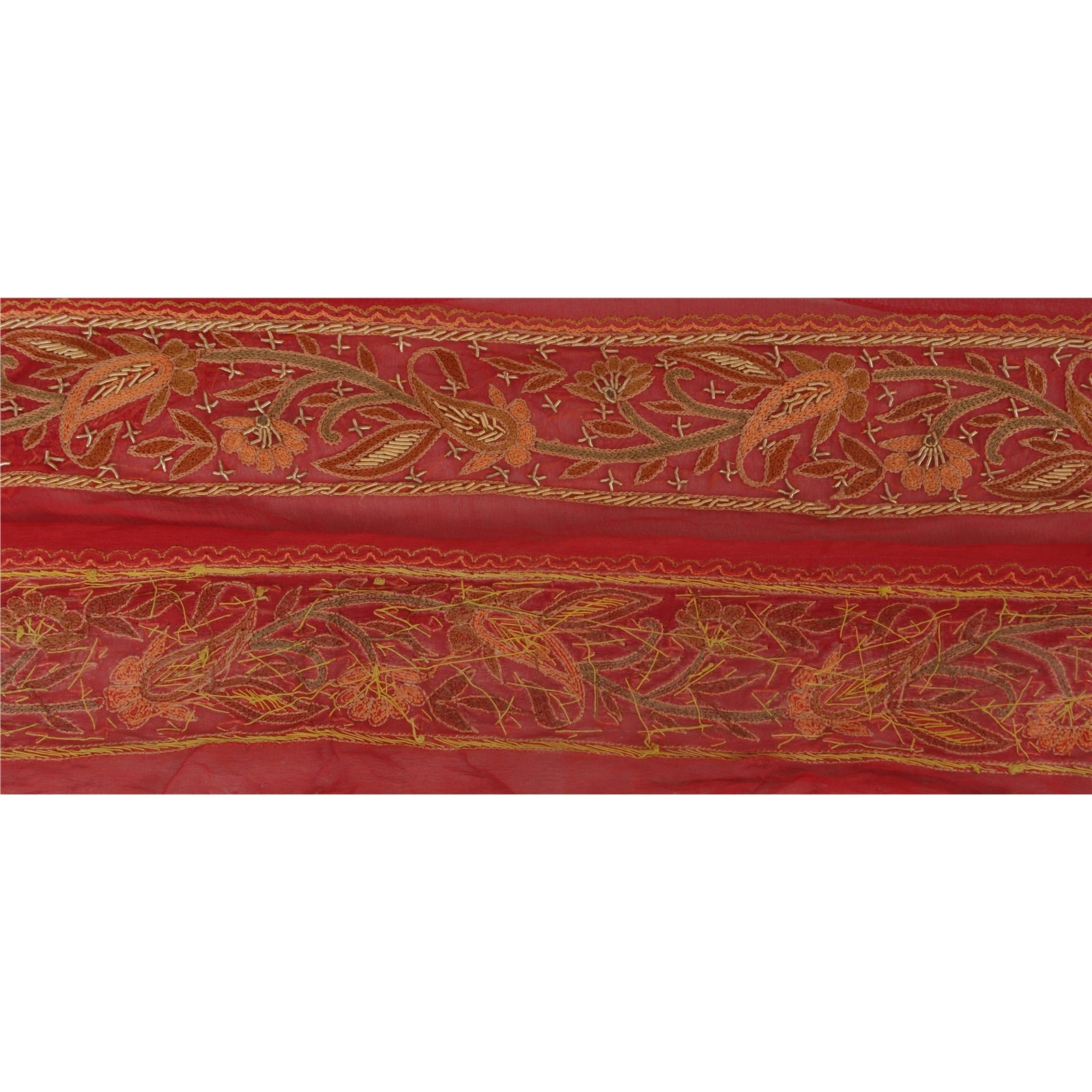 Amazing blend georgette hand embroidered sari border in red color highlighting zardozi work. Border has beautiful floral & paisley patterns painstakingly hand embroidered with brown, cream, peach thread work. golden zardozi work . WOW!! an awesome one of a kind versatile border. 1 Quantity = 1 Yard