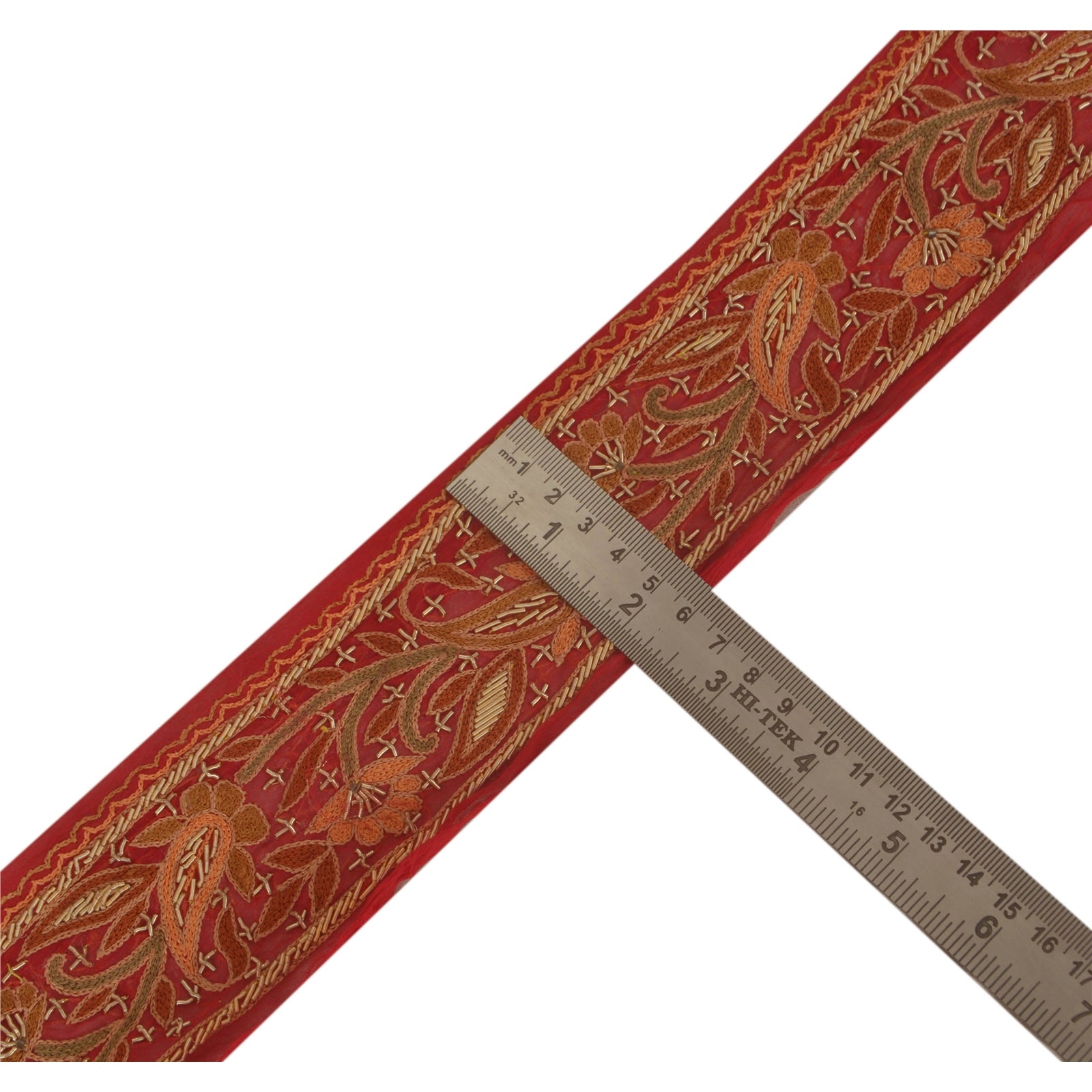 Sanskriti Vintage Sari Border Craft Red Trim Hand Embroidered 1 Yd Zardozi Lace