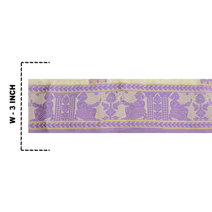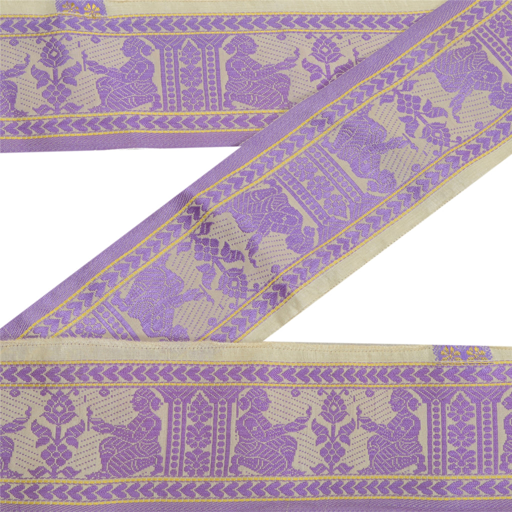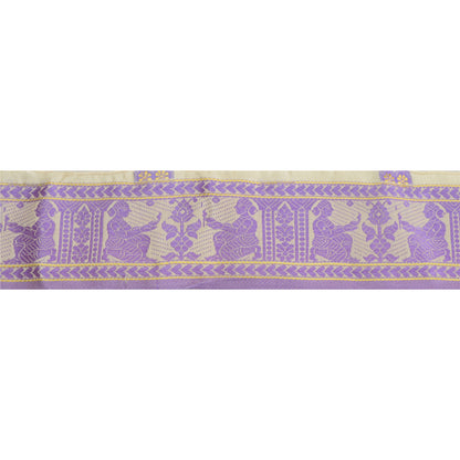 Beautiful pure silk embroidered woven sari border. Further embellished by purple weaving work along with floral & lady design on cream base Sustainable Fabric. 1 Quantity = 1 Yard