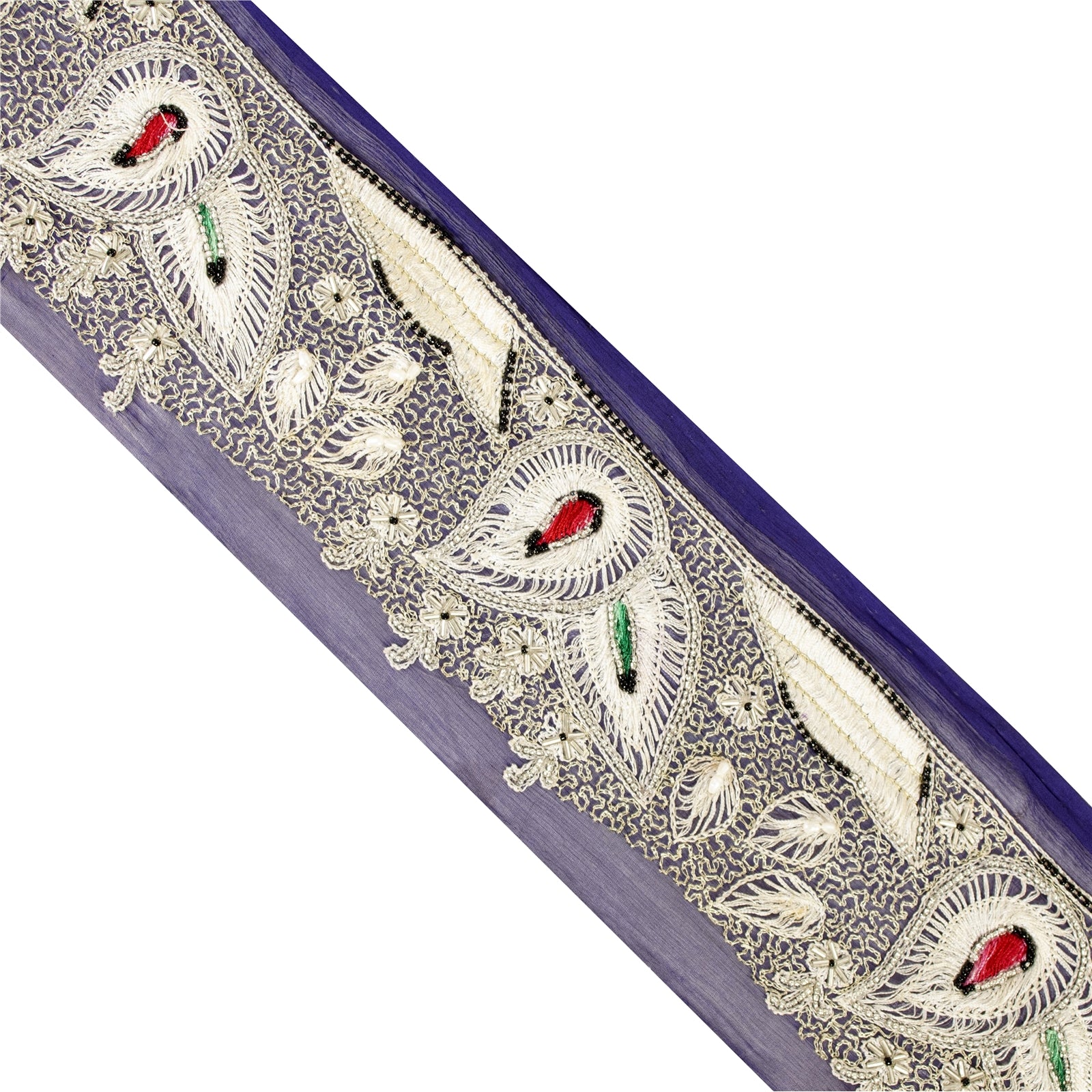 Beautiful pure chiffon silk hand embroidered sari border. Further embellished by cream/pink/green thread work, silver zari work. Also you can white/black pearl like beads, white glass beads, along with floral design on blue base fabric 1 Quantity = 1 Yard. B-6260