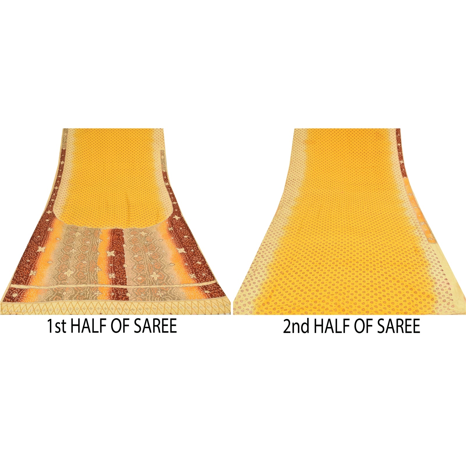 Sanskriti Vintage Yellow Sarees Pure Crepe Hand Beaded Bandhani Sari 5+yd Sustainable Fabric