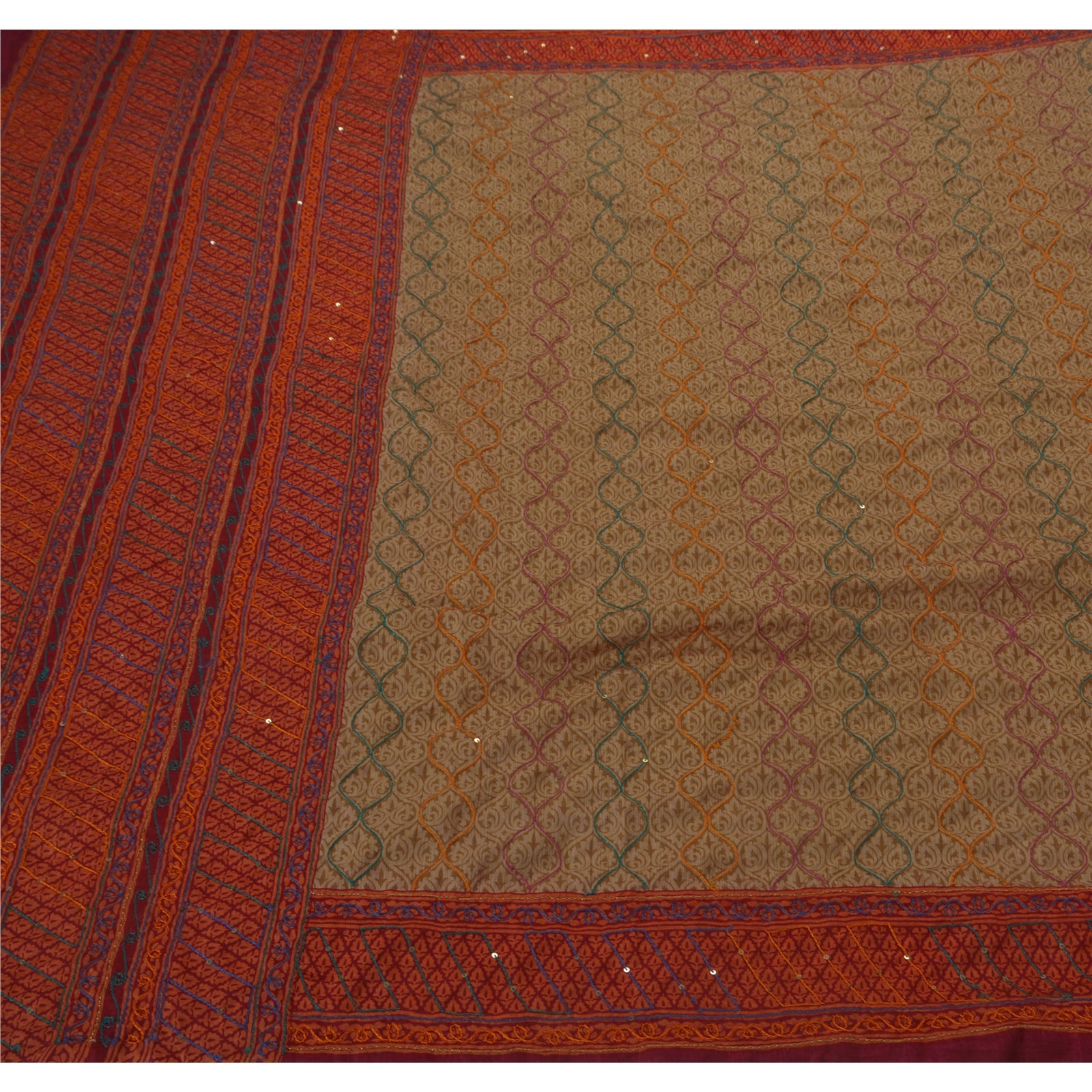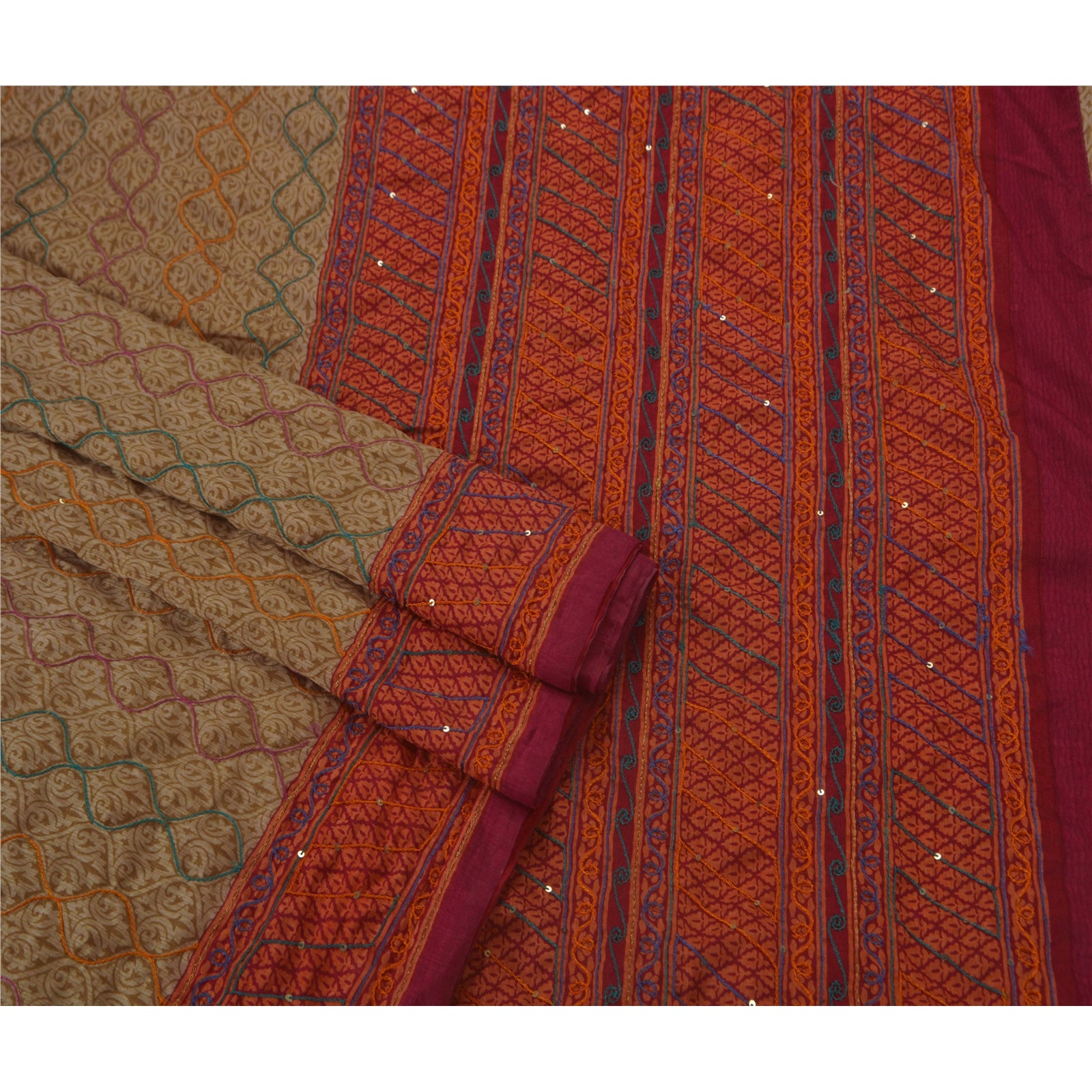 • Beautiful cream & dark red colored hand embroidered printed art silk sari • Pallu & Border features floral design embellished with multi color thread work and gold sequins work. • There are floral motifs with similar work in center part of sari. • This saree has a artificial silk Sustainable Fabric. What is special about this saree? Vibrant multi color thread work with floral design on cream & dark red color base Sustainable Fabric is really enhancing the beauty of the saree. This unique vintage saree can be used for various crafting ideas even if you don't want to use it as a sari. Design a dress, use it as a throw, as window dressing, upholstery, sarongs, table linen and much more. Let your creative juices flow and use this decorated Sustainable Fabric in multiple fashion.