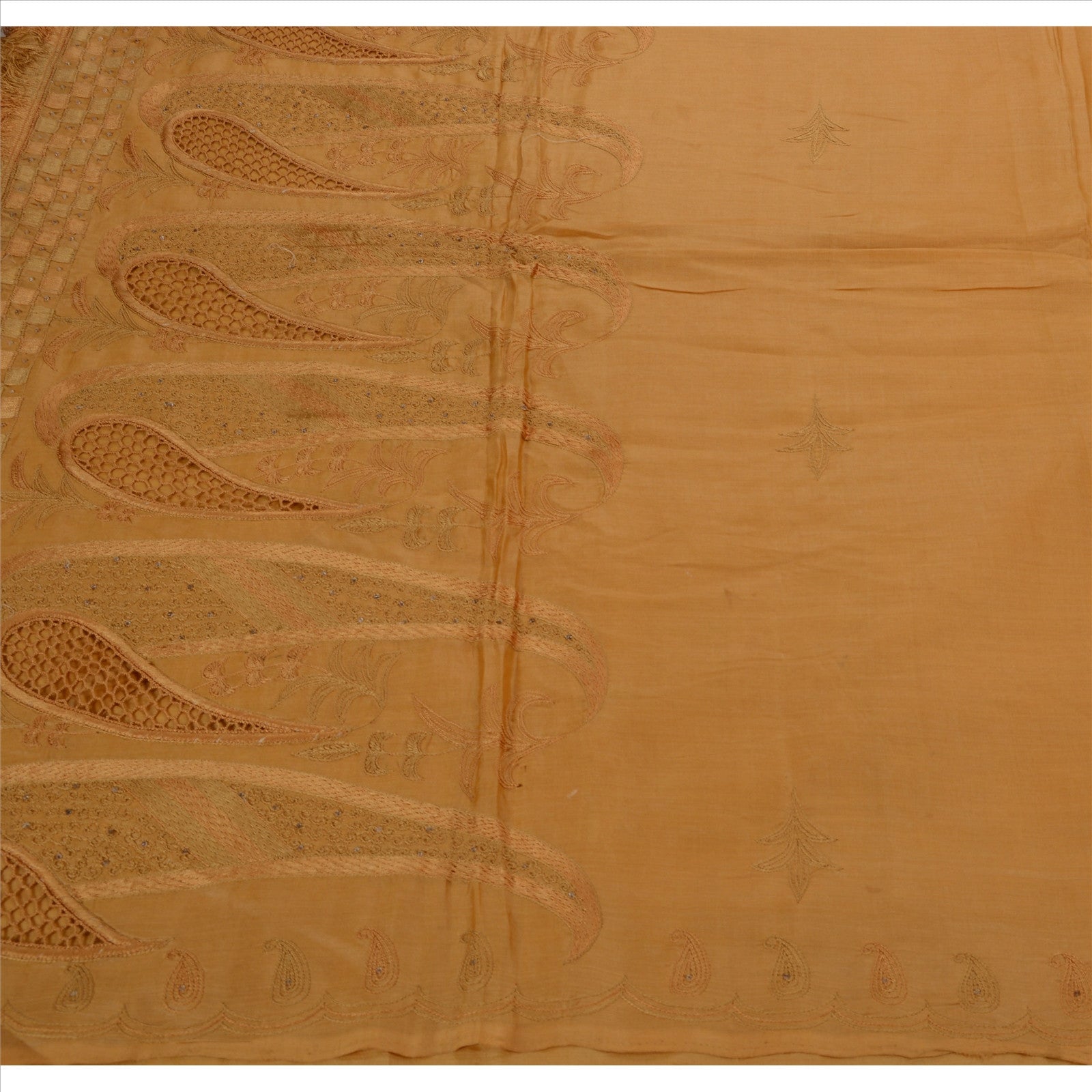 The cut work design with paisley design on saffron color base Sustainable Fabric is really enhancing the beauty of the saree.