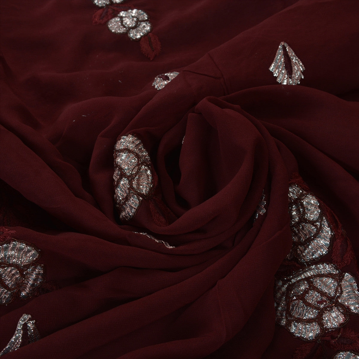 Shimmering silver gota patti work with floral design on brown color base Sustainable Fabric is really enhancing the beauty of the saree.