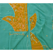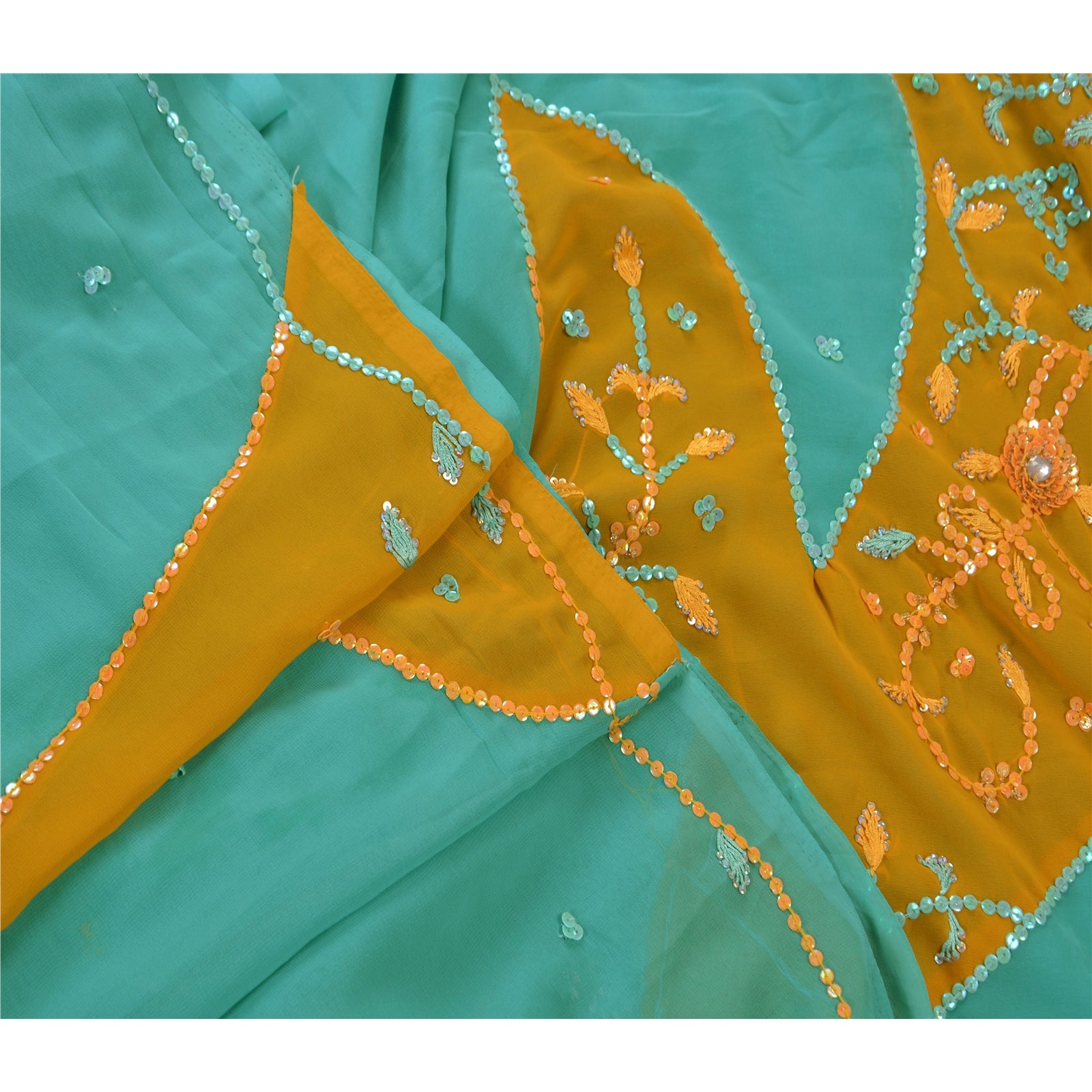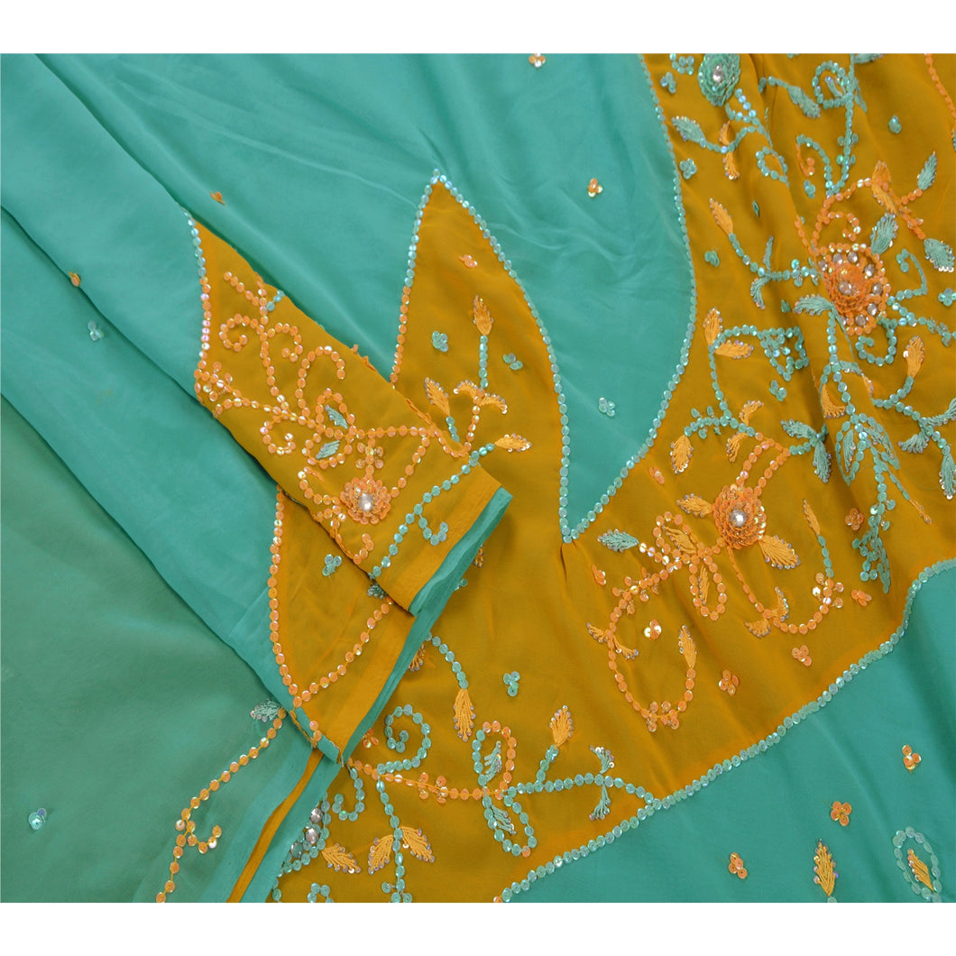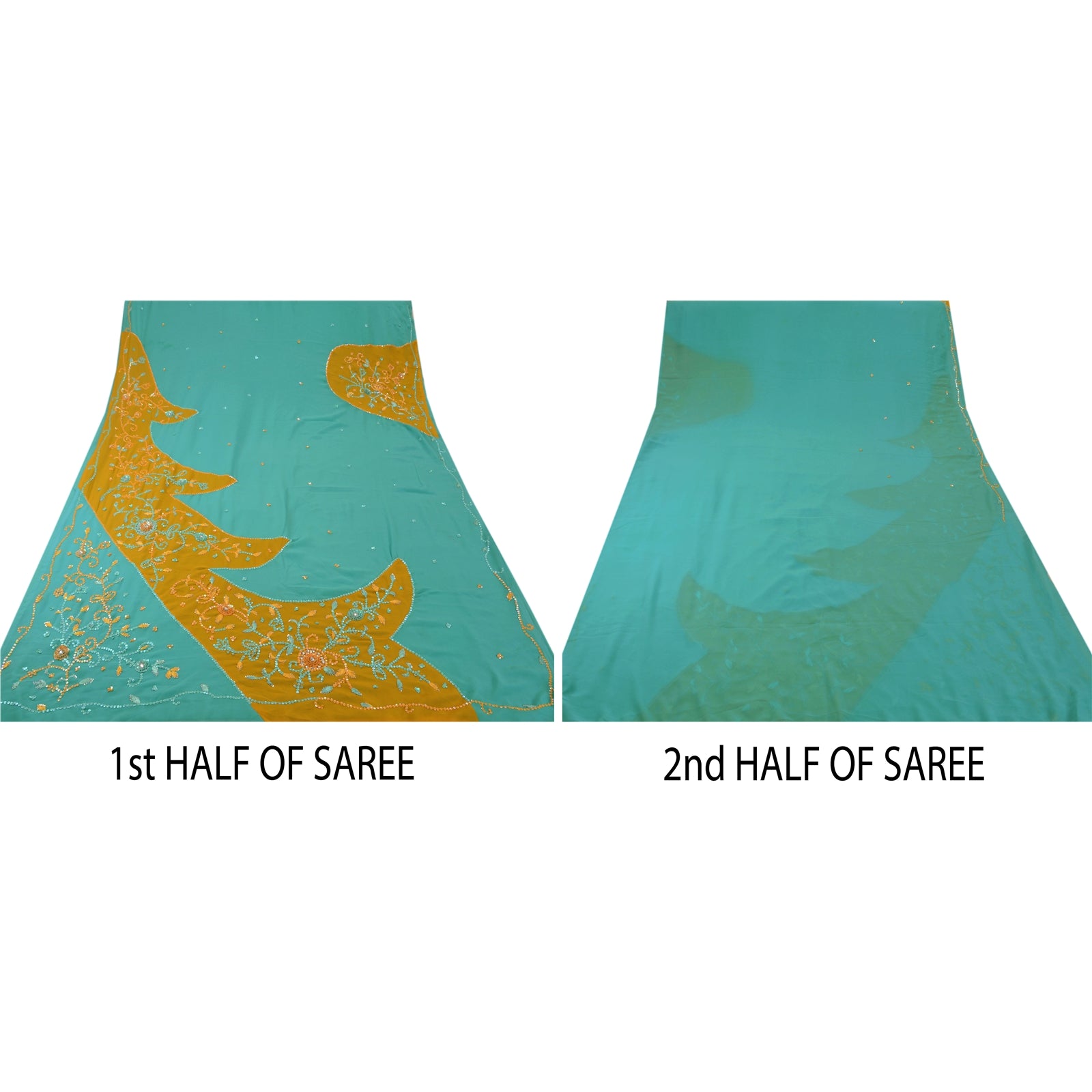 ? Beautiful blue & green colored hand embroidered georgette sari ? All over sari features floral design embellished with blue/cream and blue/peach & silver sequins work. Glittering white rhinestone work further enhances the beauty of the saree. What is special about this saree? Sparkling blue & peach sequins work with floral design on blue & green color base Sustainable Fabric is really enhancing the beauty of the saree. This unique vintage saree can be used for various crafting ideas even if you don't want to use it as a sari. Design a dress, use it as a throw, as window dressing, upholstery, sarongs, table linen and much more. Let your creative juices flow and use this decorated Sustainable Fabric in multiple fashion.