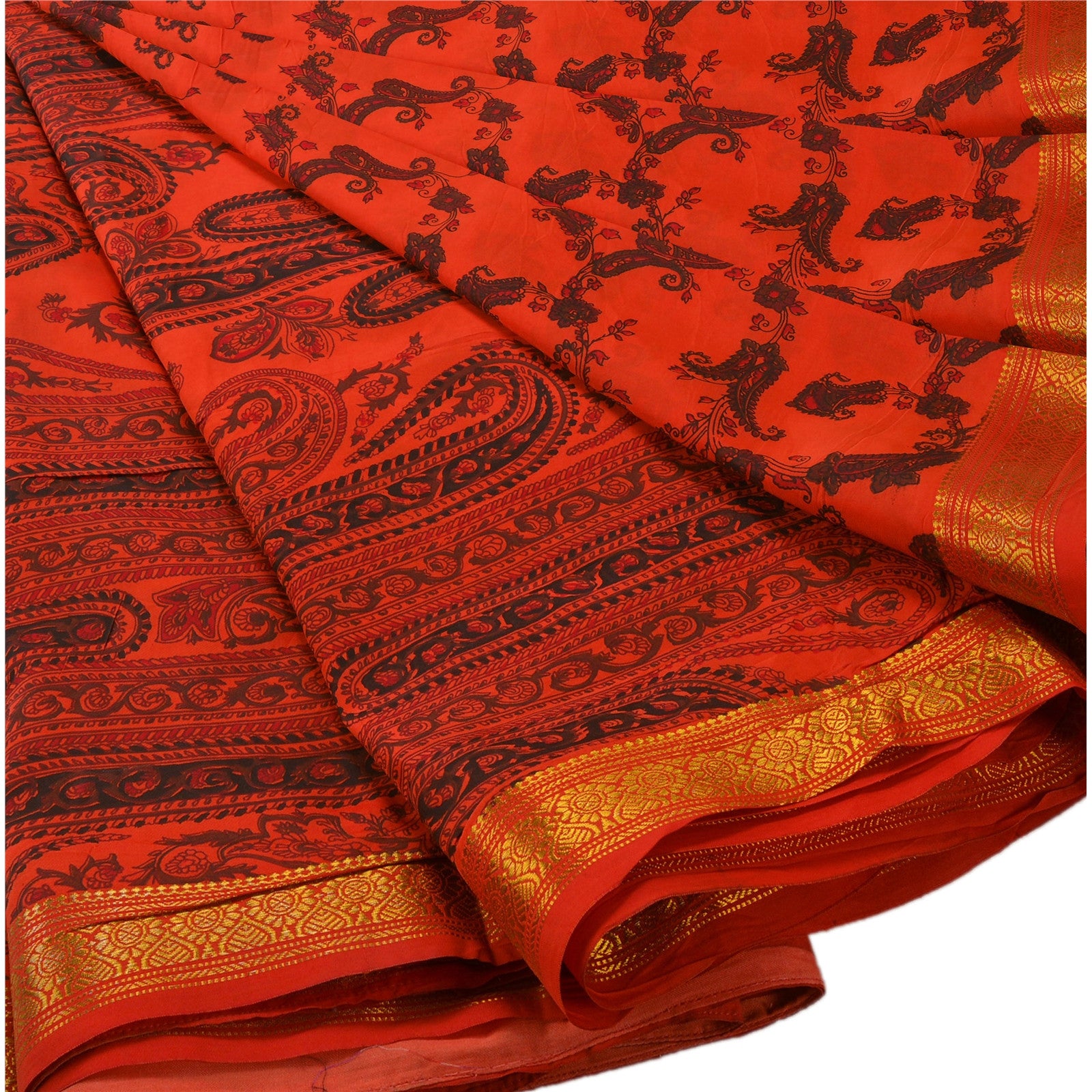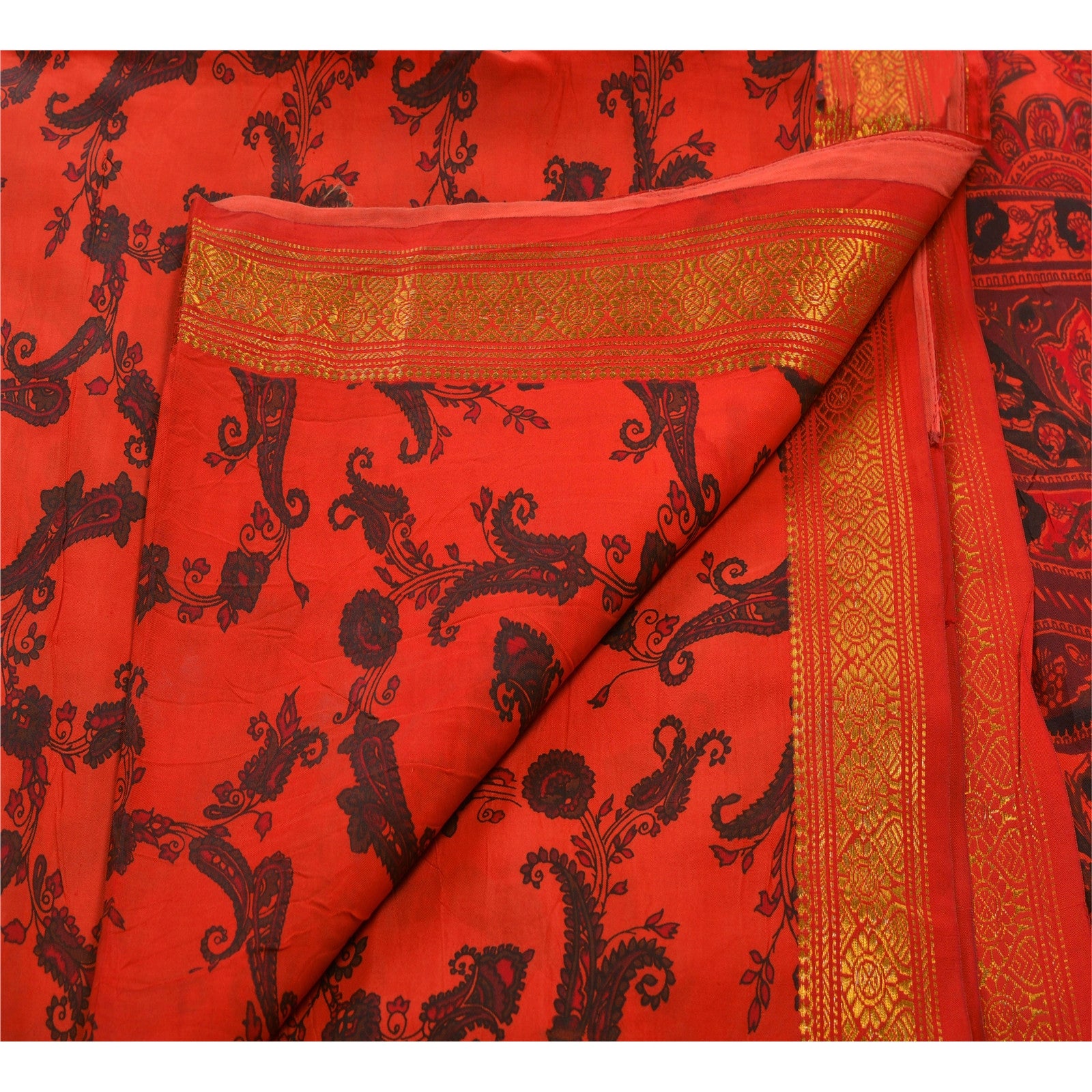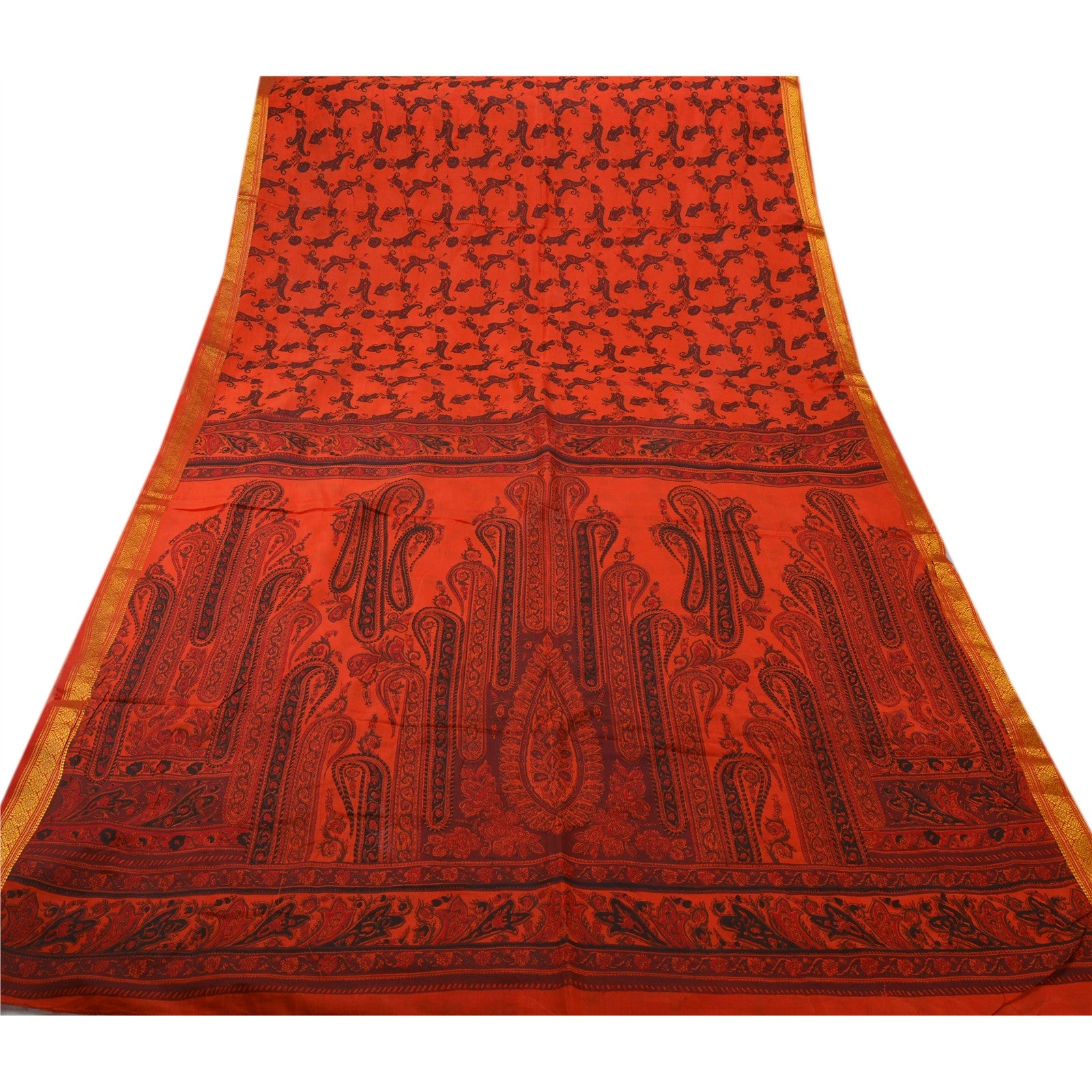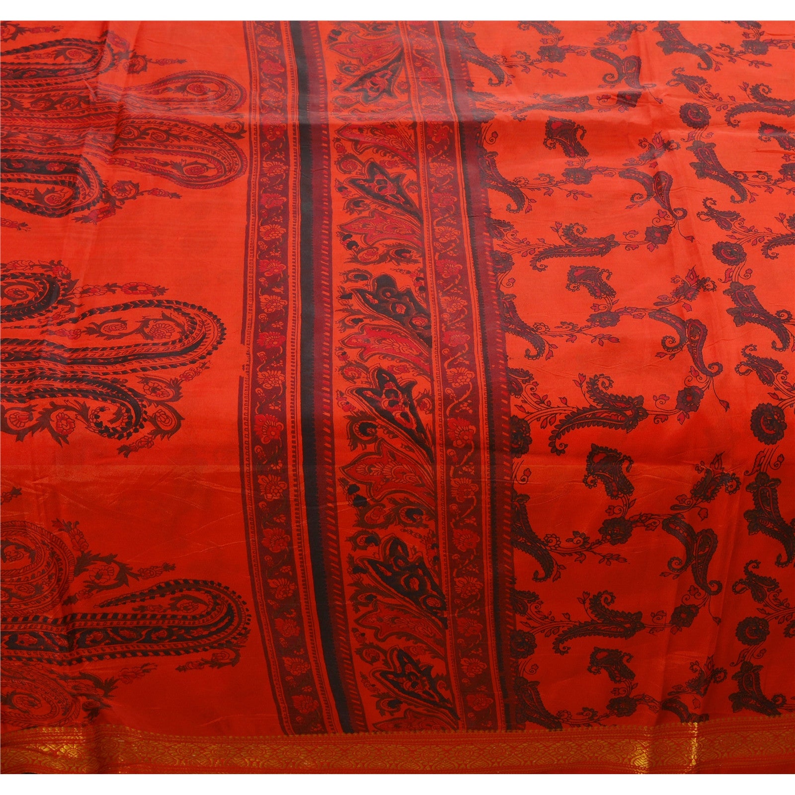 ? Beautiful orange colored printed art silk saree . ? Pallu has printed floral & paisley design . ? Floral & paisley design in center part of sari . ? Sari has golden zari weaving work on borders . What is special about this saree? Marvelous golden border with gorgeous orange color on art silk base Sustainable Fabric is really enhancing the beauty of the saree. This unique vintage saree can be used for various crafting ideas even if you don't want to use it as a sari. Design a dress, use it as a throw, as window dressing, upholstery, sarongs, table linen and much more. Let your creative juices flow and use this decorated Sustainable Fabric in multiple fashion.