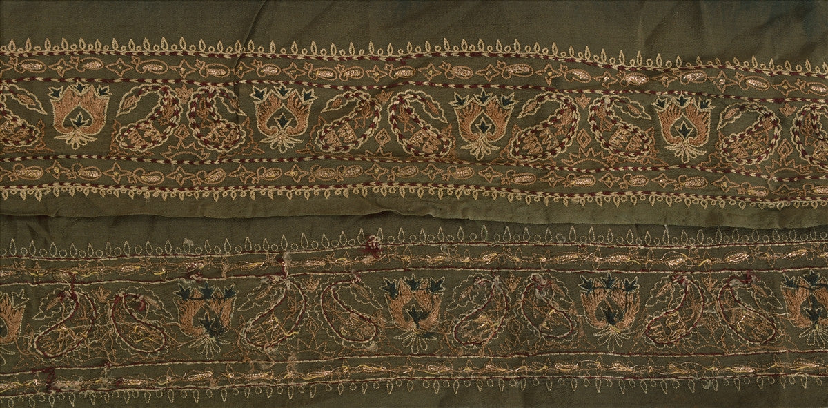 Further embellished by green/brown thread work, gold zari work along with floral & paisley design on green base Sustainable Fabric.