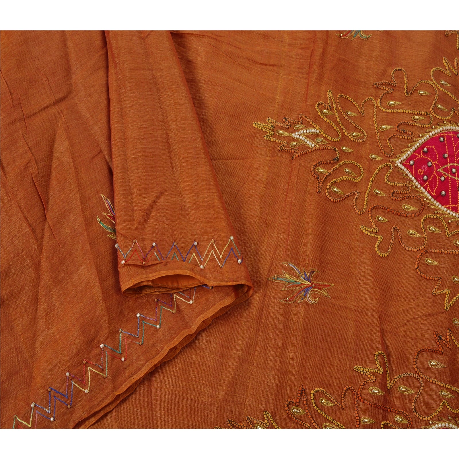 Sanskriti Vintage Brown Saree Blend Cotton Hand Beaded Craft 5 Yd Sustainable Fabric Sari