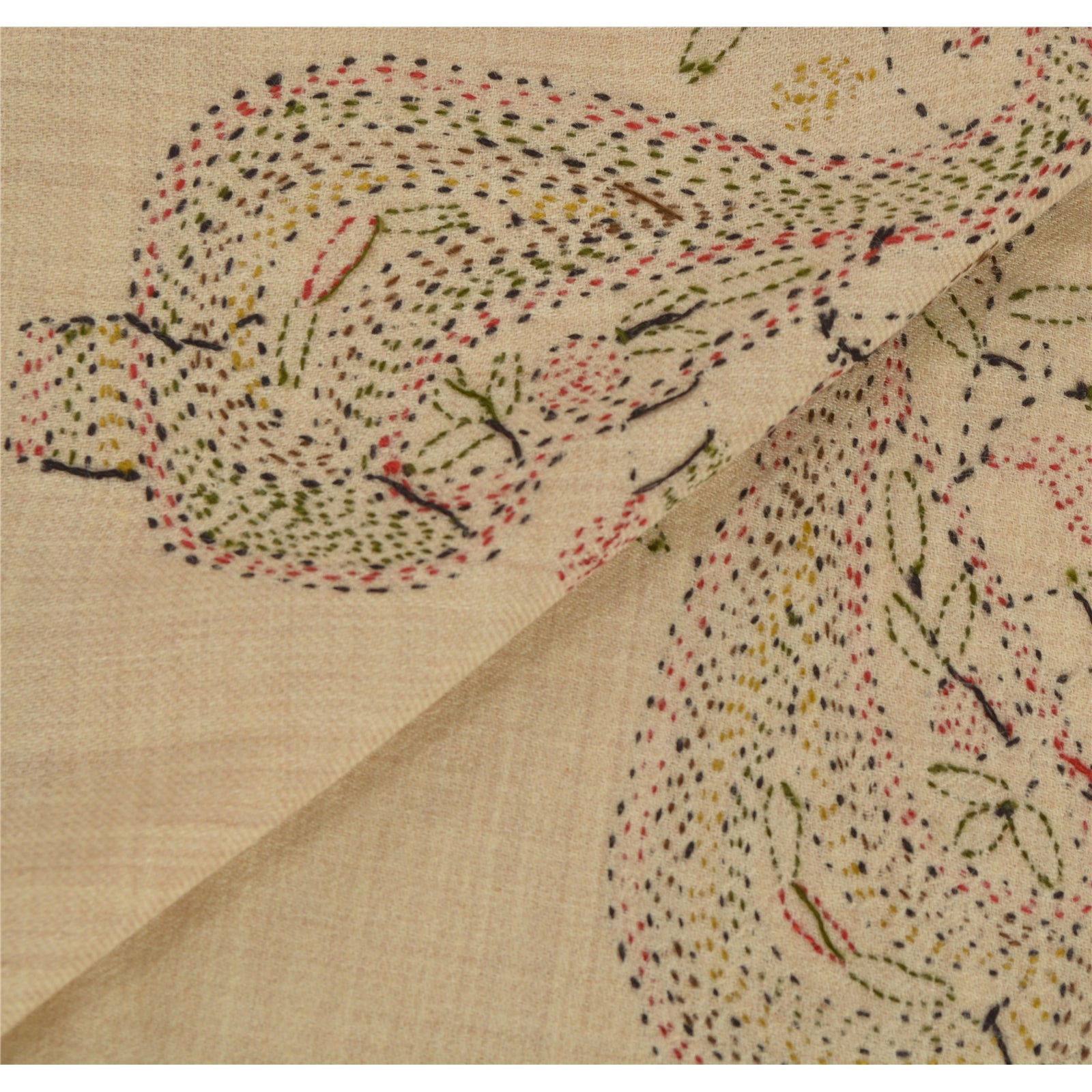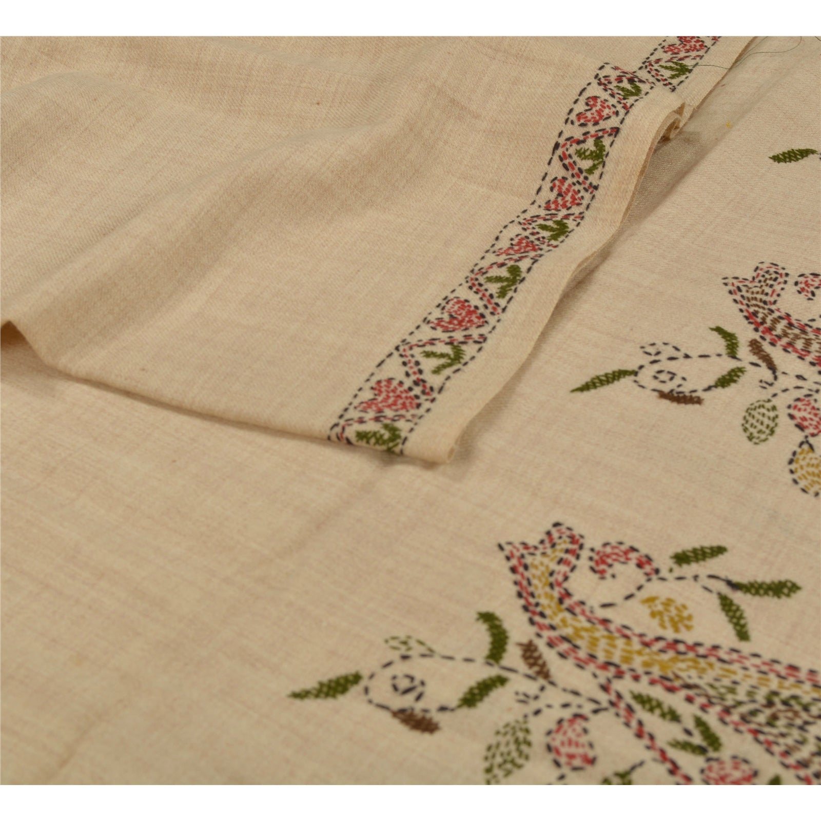 We are offering you a vintage cream woolen stole which adorns hand embroidered Kantha work. Kantha is a type of embroidery typically found in South--Eastern Asia where it is practiced by rural women. The traditional form of Kantha was done on soft sarees with a simple running stitch along the edges. The shawl or stole features floral design with multicolor threads. This cozy, warm and fuzzy stole is soft against skin due to the mellow woolen Sustainable Fabric. A truly gorgeous piece which will also make an admirable gift.