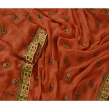 Beautiful peach colored blend georgette hand embroidered long scarf/dupatta. The center portion has floral design with thread work . Border of the dupatta has floral design embroidered with multi color thread work and embellished with orange/brown sequins work. Also you can see cream Sustainable Fabric patch work.
