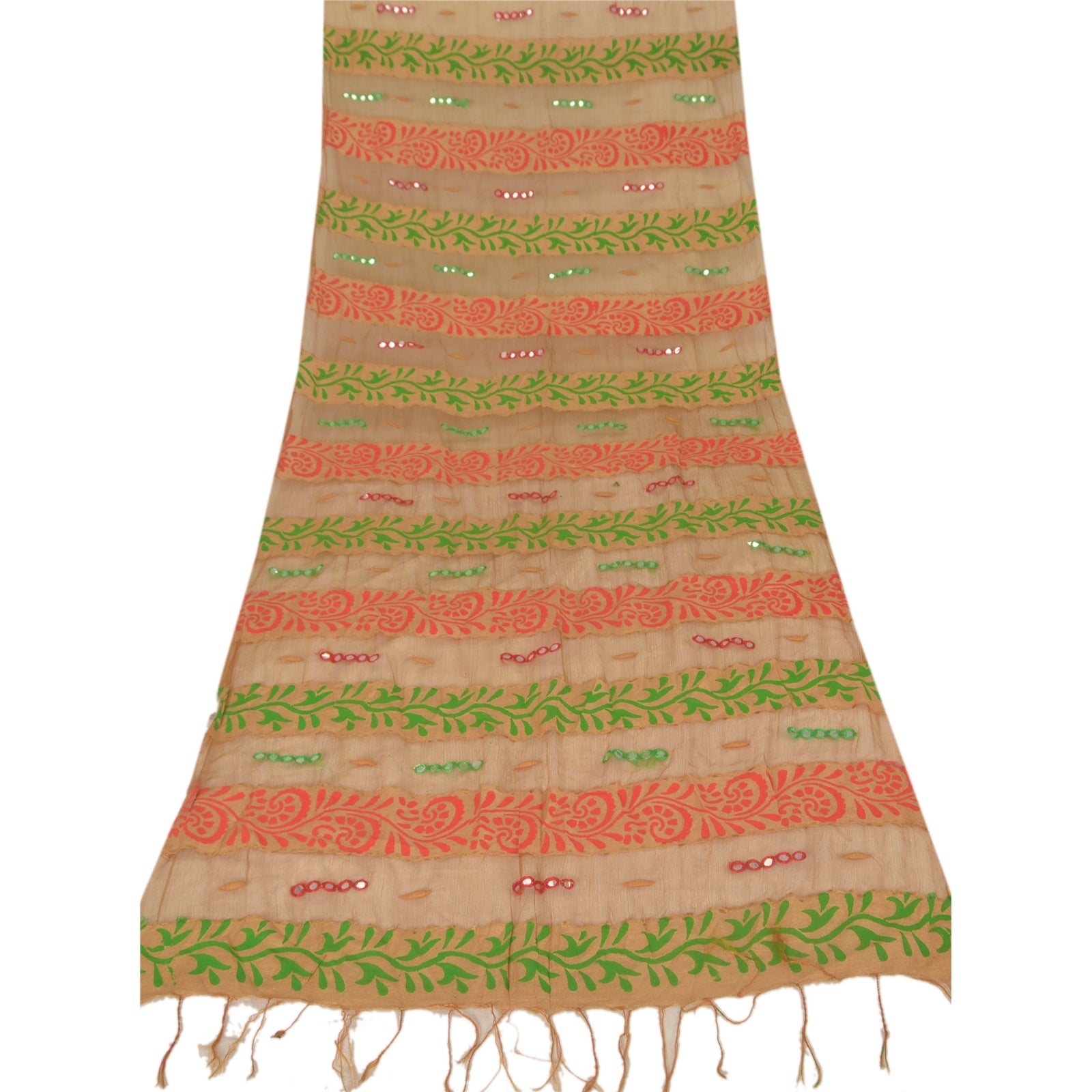 Elegant cream & brown colored organza & cotton embroidered long scarf/dupatta. All over dupatta has painted floral pattern with red/green threads work, mirror work . Dupatta has brown fringes on both ends of borders .
