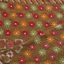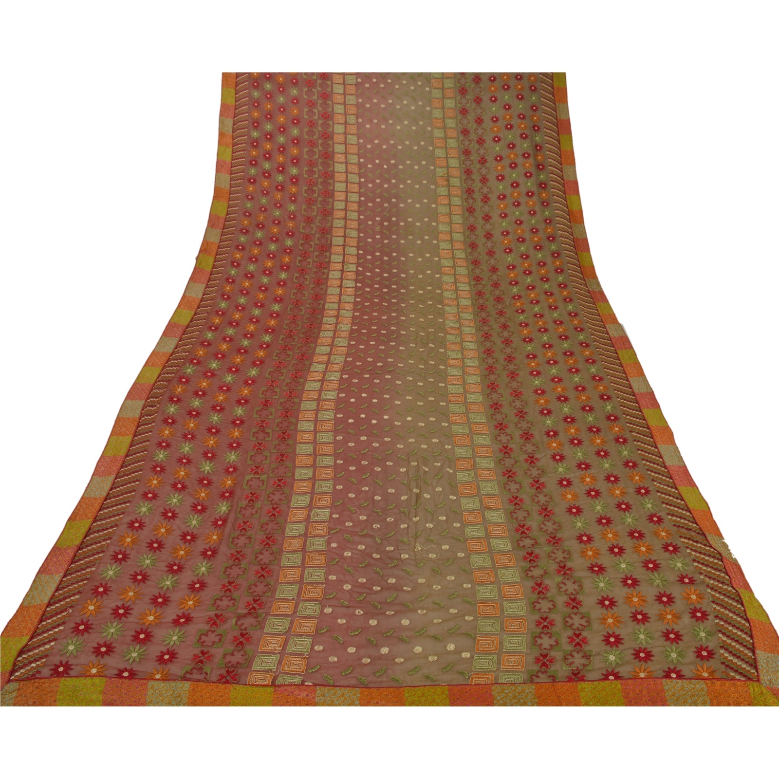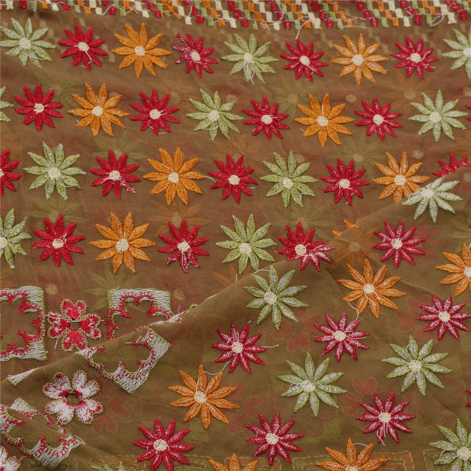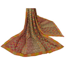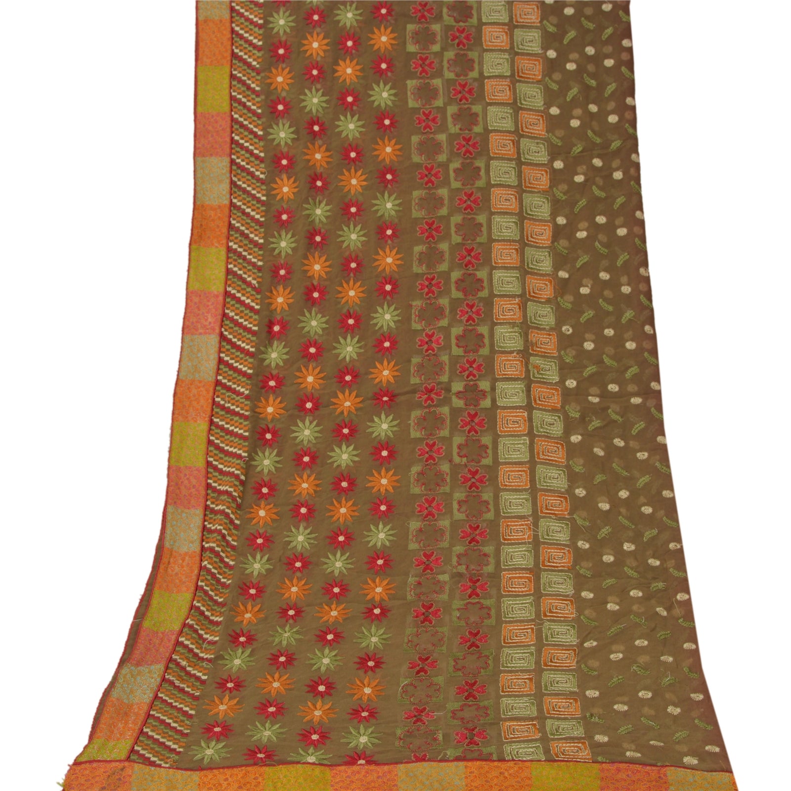 Superb purple & green colored pure georgette silk embroidered long scarf/dupatta. The center portion has floral & geometric design with multicolor thread work & cut work. Border of the dupatta has paisley design with multicolor woven work on orange Sustainable Fabric patch work. This item's Beauty Factor Awesome thread work with lovely floral design on purple & green color base Sustainable Fabric is really enhancing the beauty of the dupatta