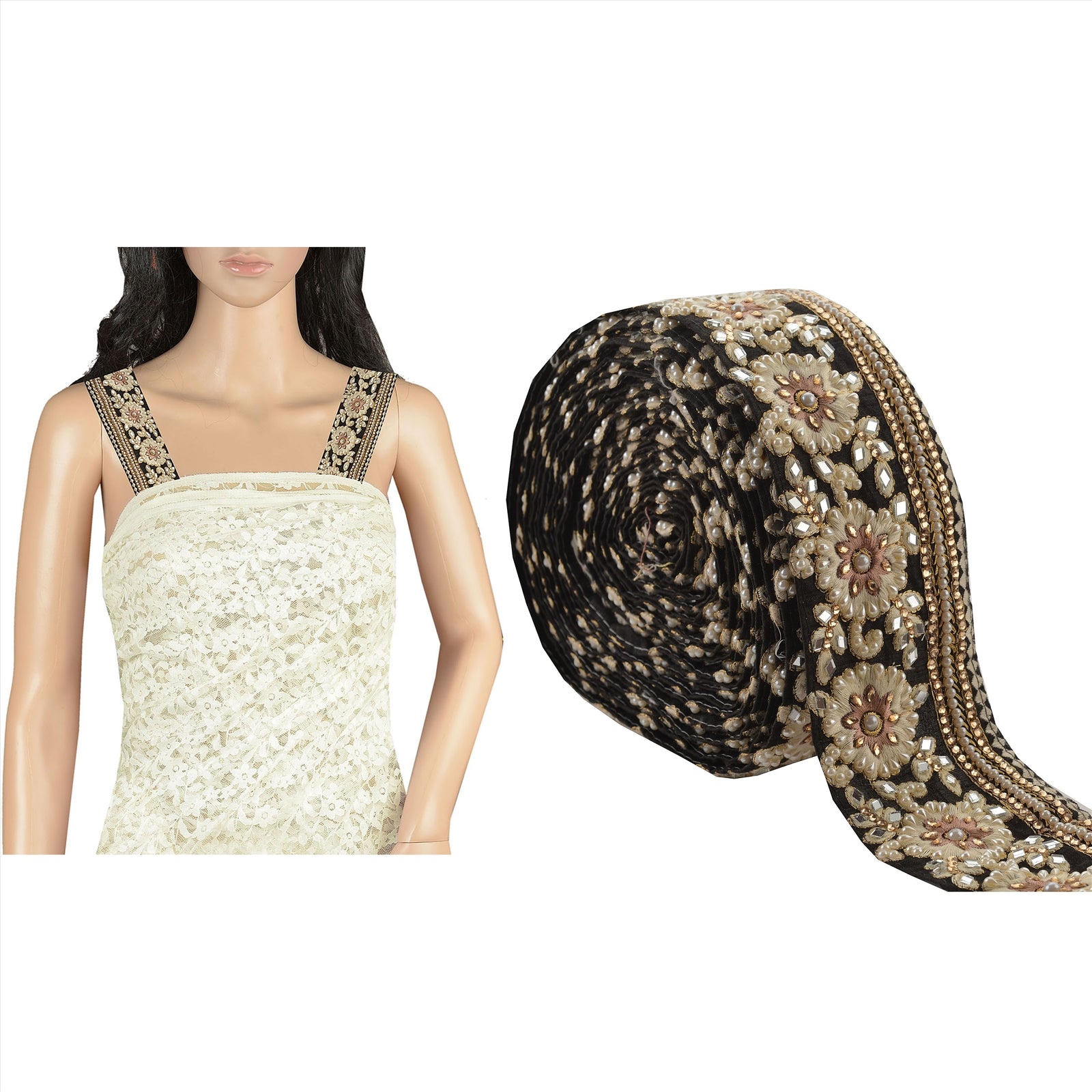 Sanskriti introduces beautiful trims for designing prom dresses, party wear dresses and much more. Visit our store to view our collection of new trims. Gorgeous designer black colored hand beaded trim with floral design adorned with sparkling mirrors and peach rhinestones. This is a unique handmade one of a kind item and definitely among one of the best that has graced our store. Cream, golden and peach thread work along with artistically arranged pearl like beads is really looking awesome Perfect for dress designing, crafting projects & decor. 1 quantity = 1 Yard