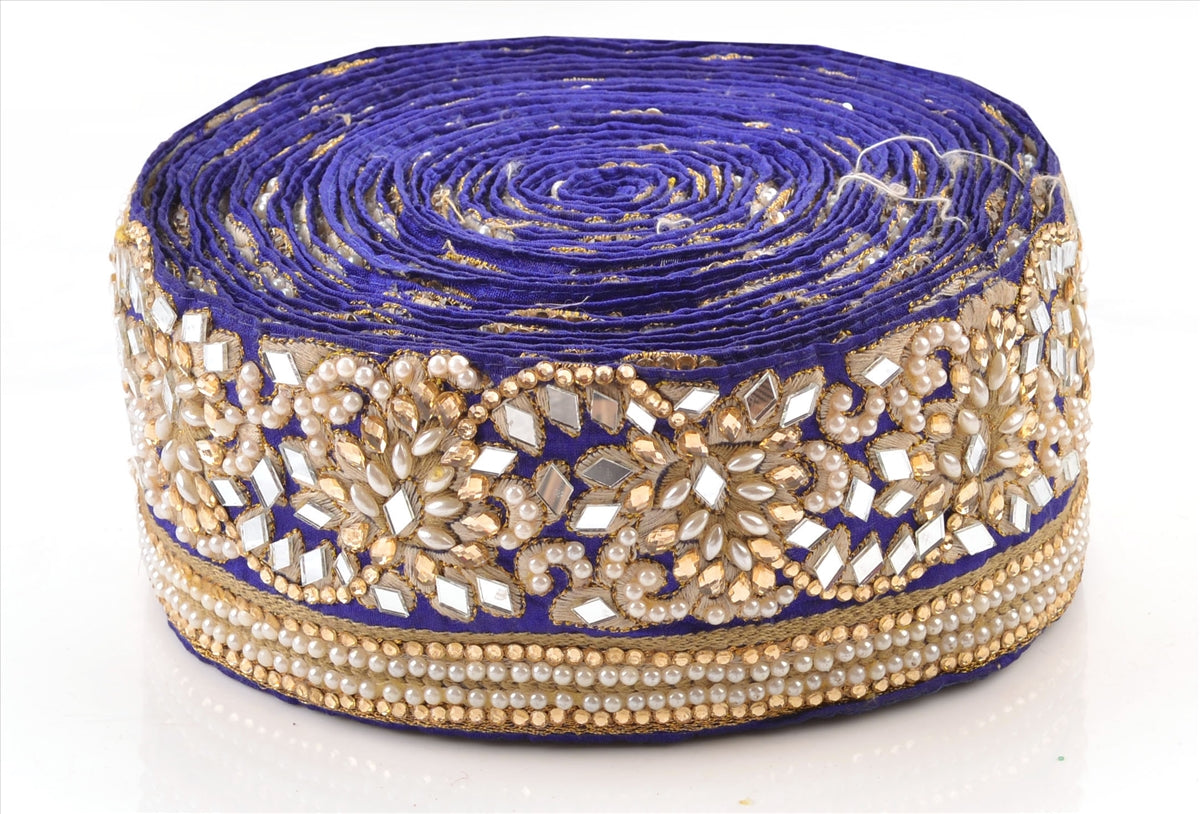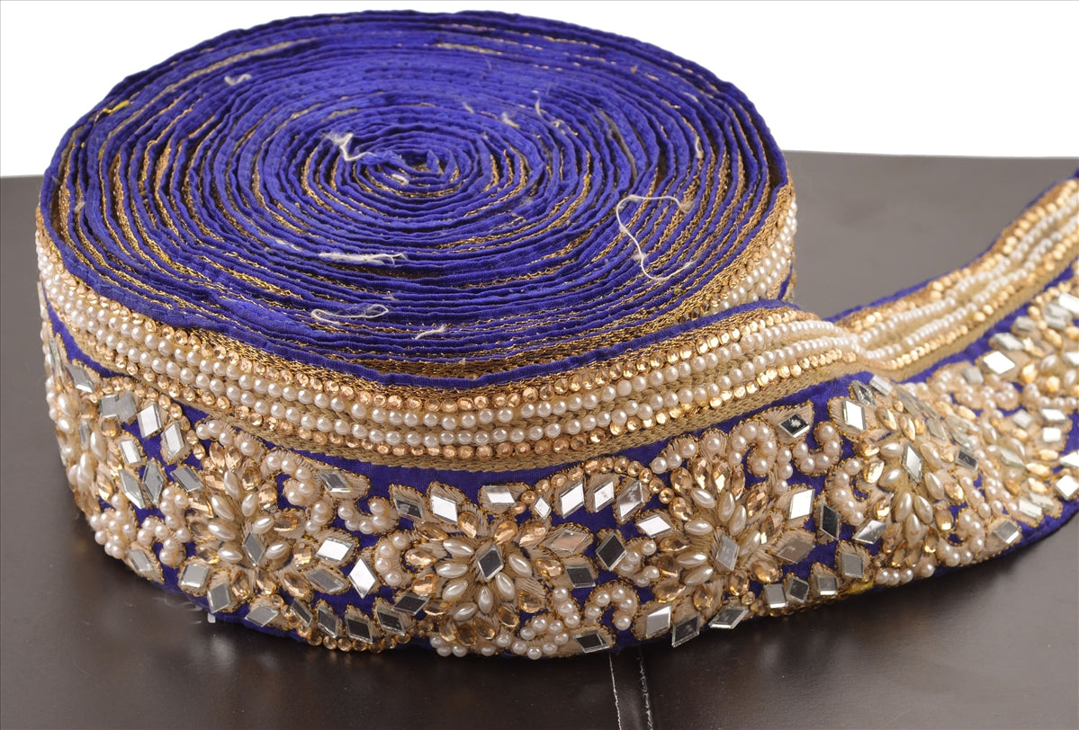Sanskriti Hand Beaded Prom Dress Border 1 YD Trim Blue Craft Lace Mirror Work Pearl Beads