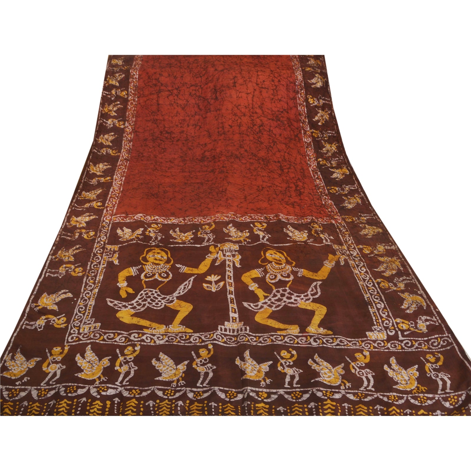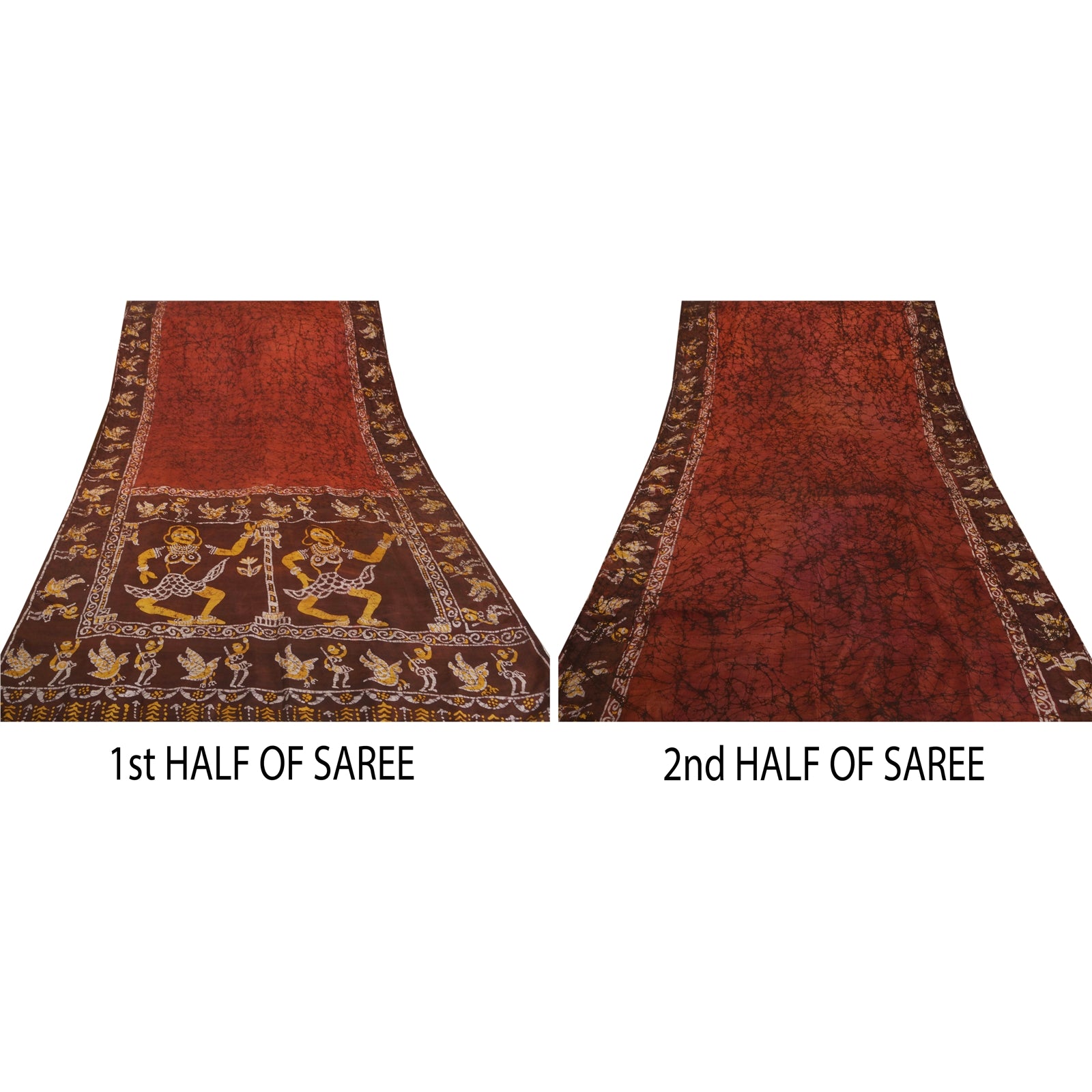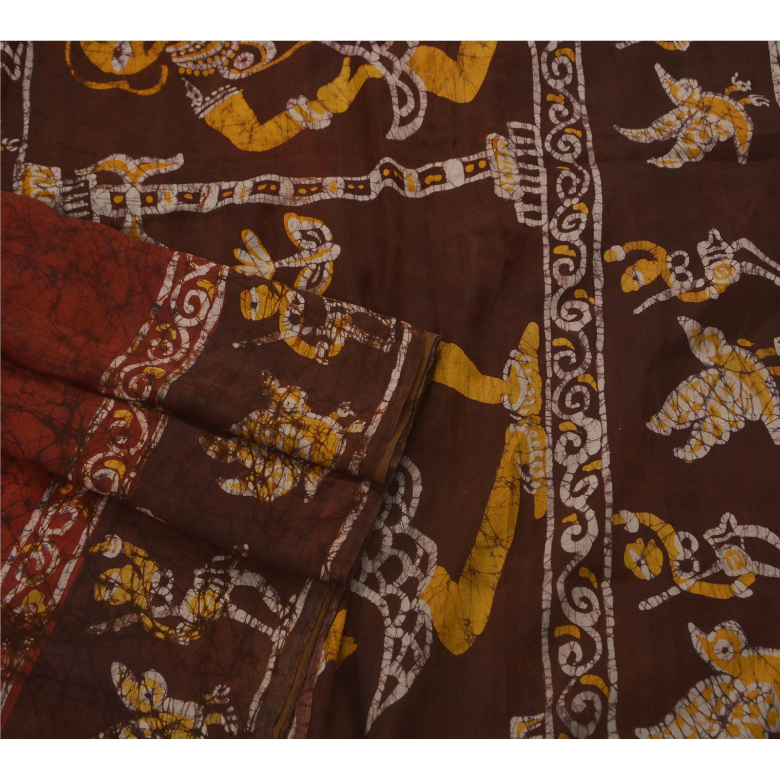 Sanskriti Vintage Heavy Saree 100% Pure Silk Batik Work Brown Craft Sari