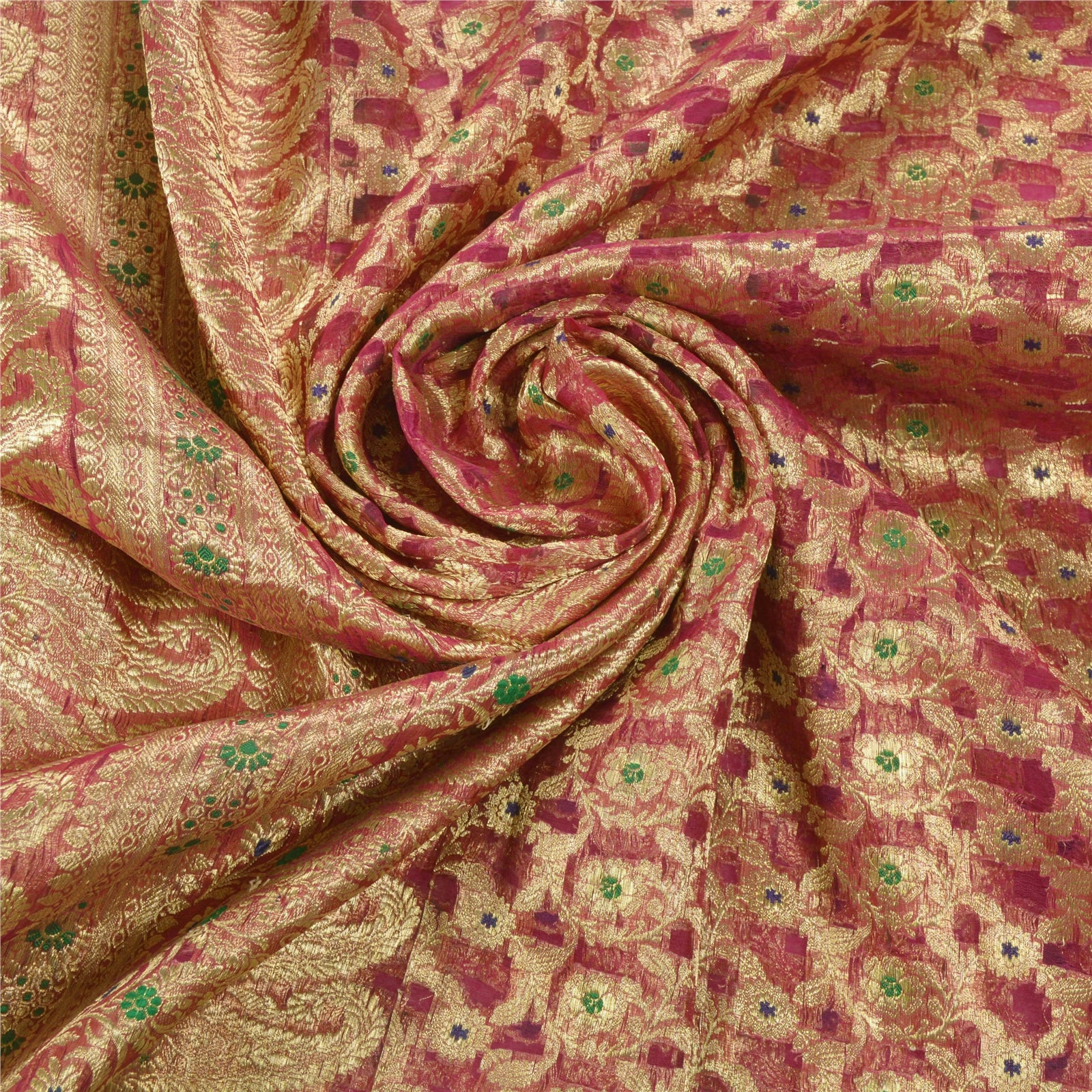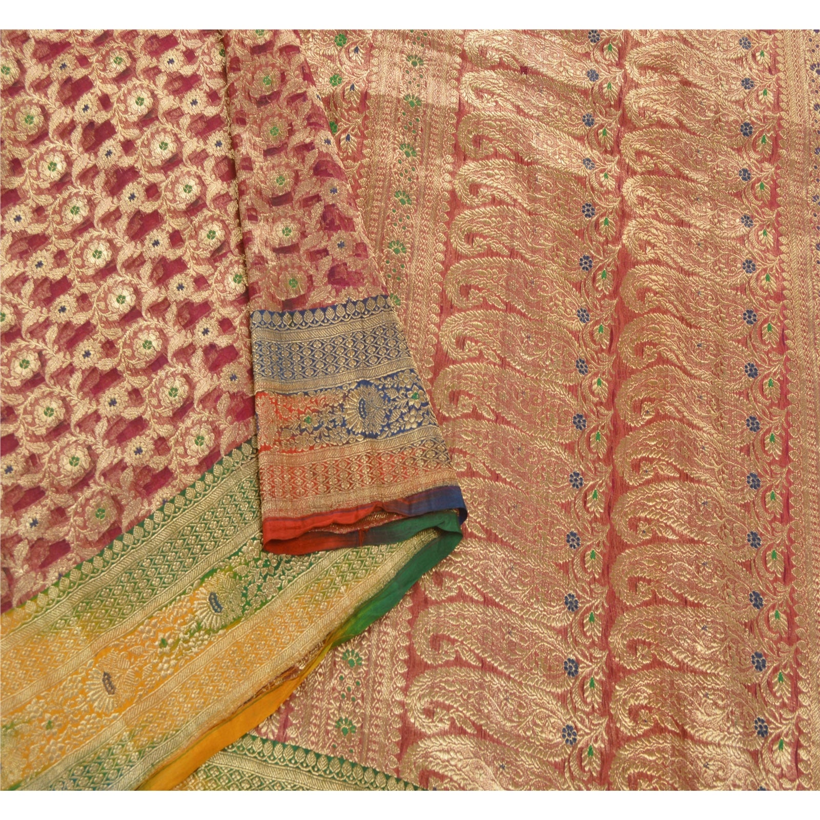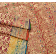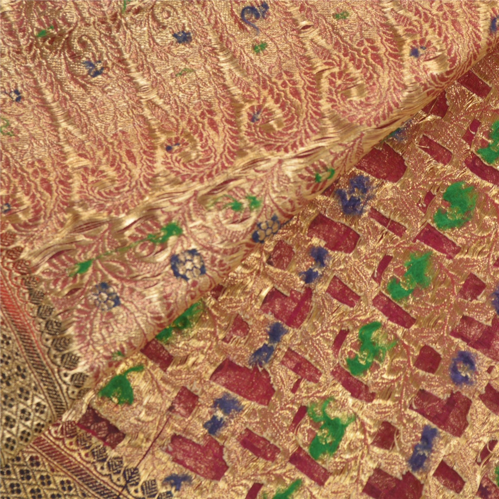 Sanskriti offers this vintage pink banarasi brocade saree which is crafted with 100% Pure Organza Silk. The pallu & border sari features flower and paisley design embellished with pure metallic golden zari work, green/blue woven work. The center part of sari boasts similar floral design with similar work. This heavy saree can be used for various crafting ideas too. Use it for dress designing, as a throw, as window dressing, upholstery, table linen and much more. Let your creative juices flow! The quality of zari work is amazing, its a pure metallic zari. Some zari work gives a antique look.