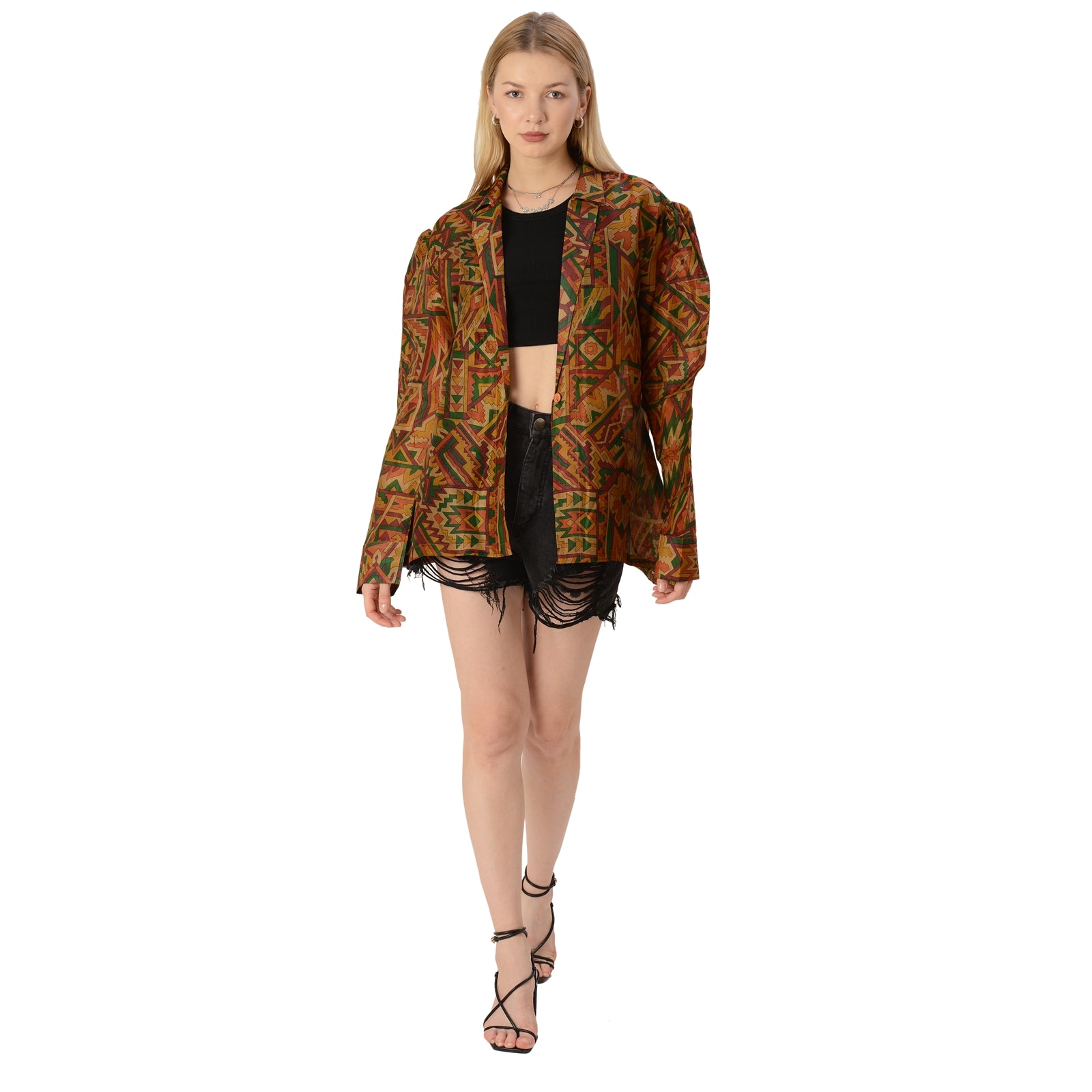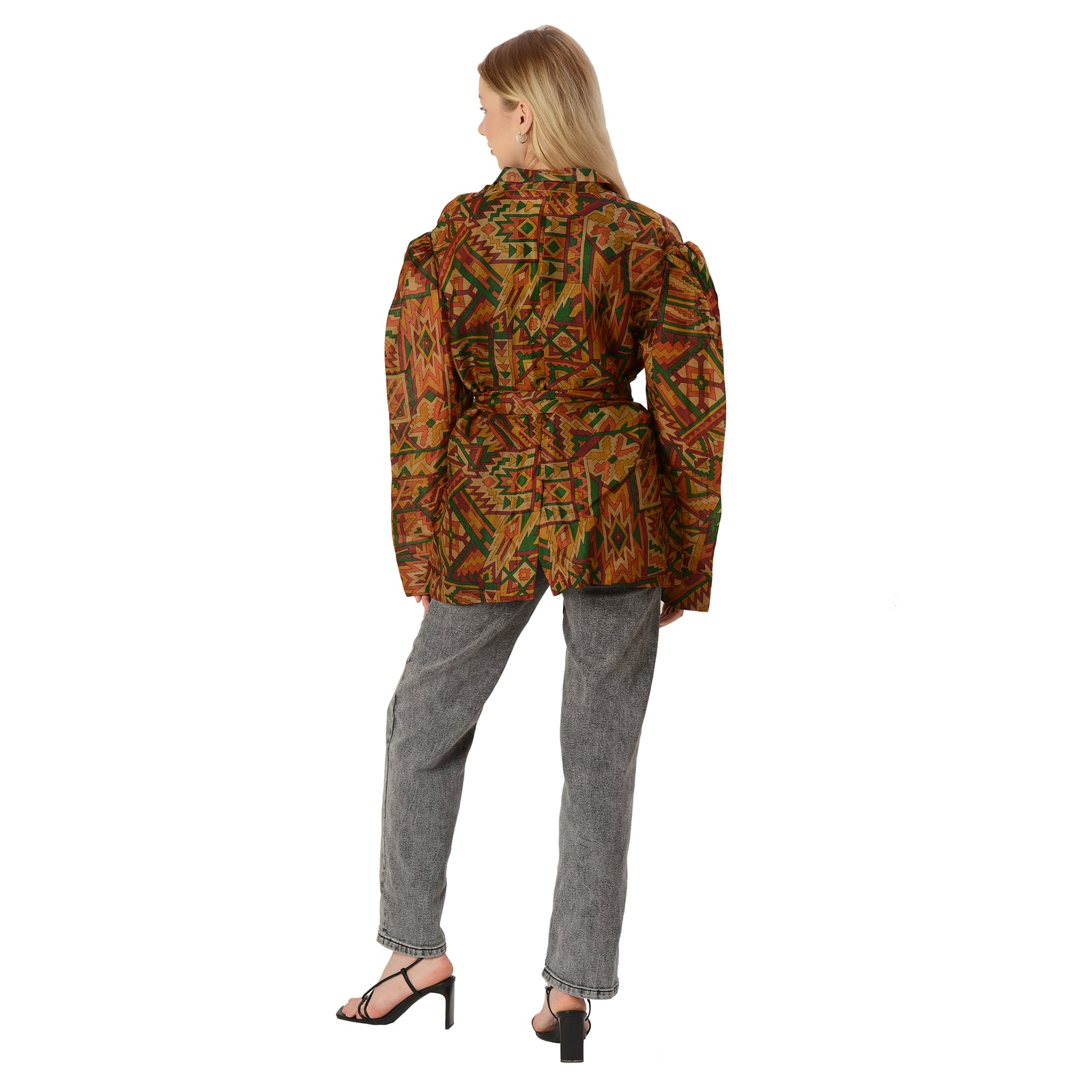 Elevate your wardrobe with our exquisite Puff-Sleeved Blazer, a harmonious blend of elegance and sustainability. Crafted from upcycled 100% pure silk, its khaki base is adorned with captivating multi-color abstract prints, creating a striking contrast. The stiff yet sheer texture, along with the flat notch collar and tie belt, adds a touch of sophistication. This blazer is a timeless piece that embraces modern aesthetics while championing eco-conscious fashion, making a statement at any event.