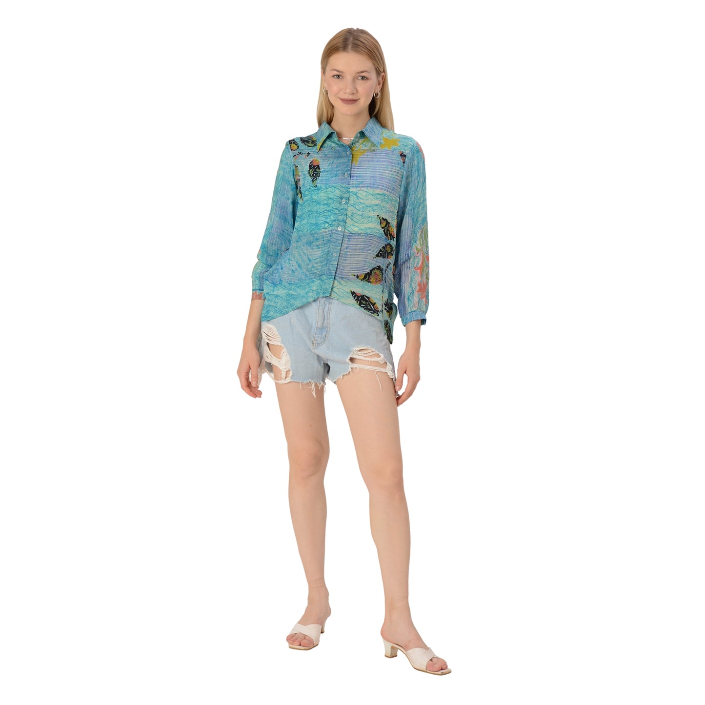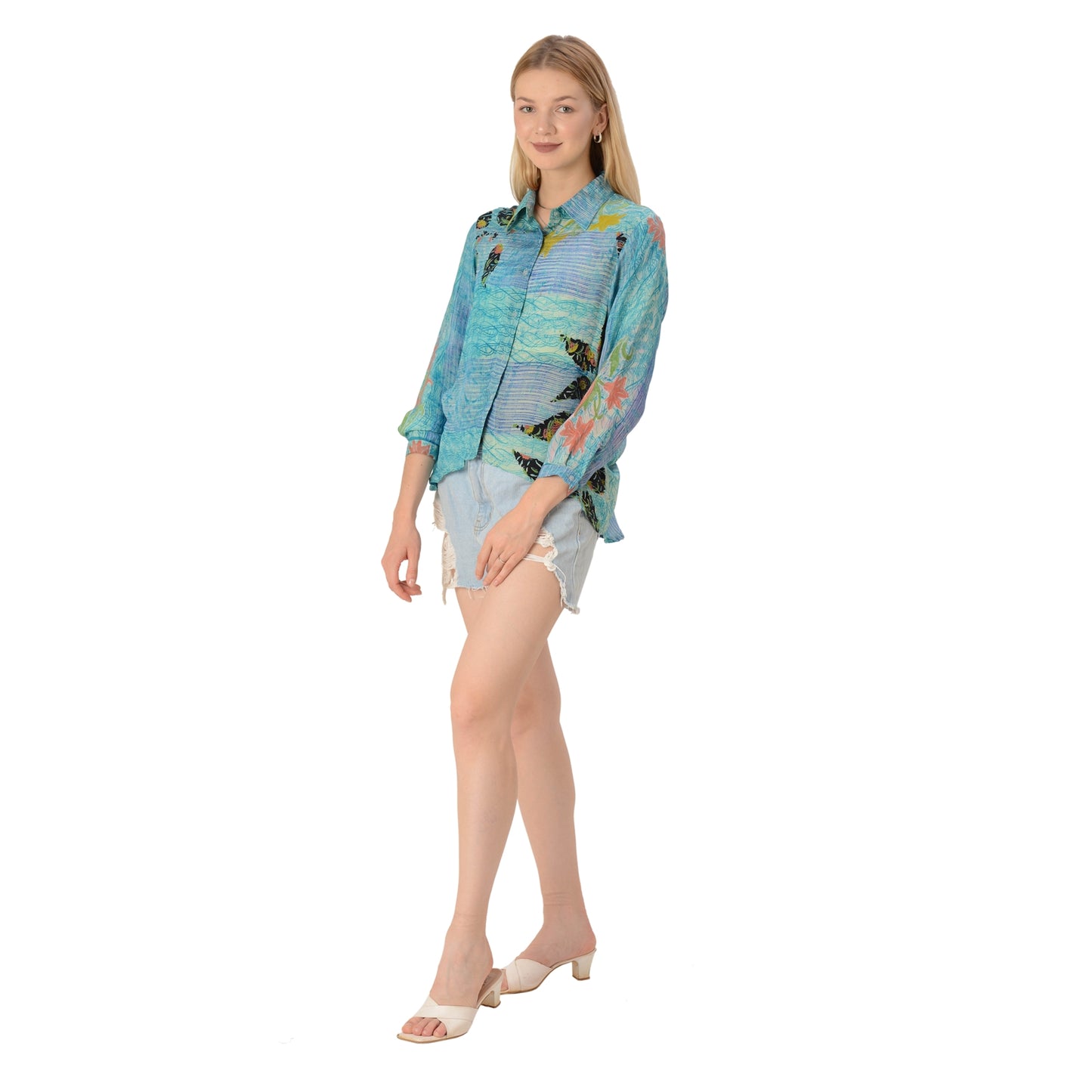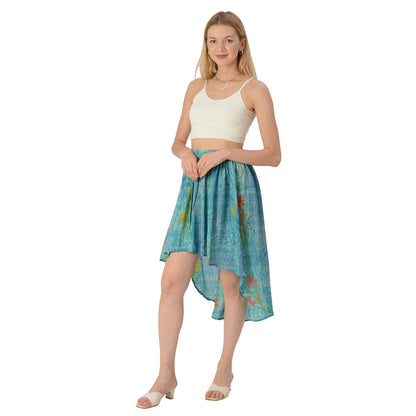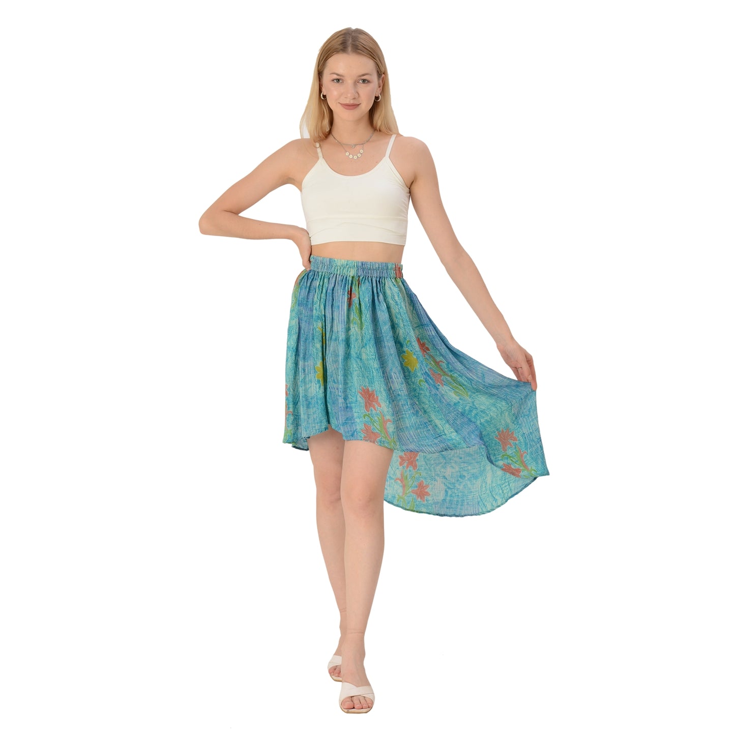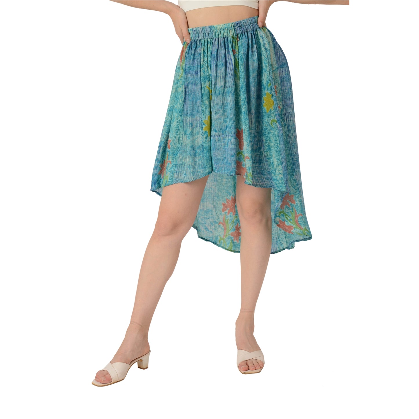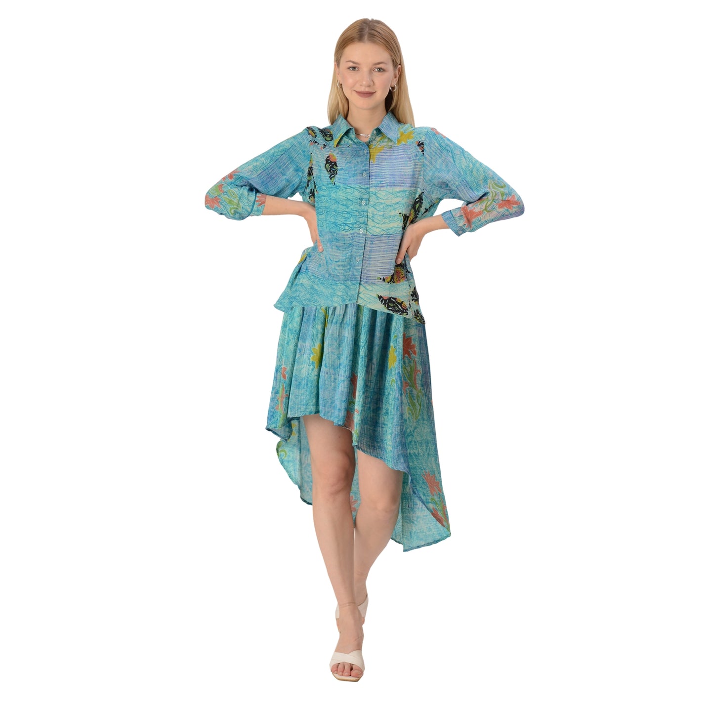 Elevate your style with the ethereal charm of this pure crepe blue floral print shirt and skirt set. Crafted from luxurious crepe Sustainable Fabric, the ensemble embodies grace and sophistication. The deep blue backdrop is adorned with intricate floral patterns, lending a touch of timeless beauty. The shirt features a classic collar and button-down front, while the skirt flows gracefully with an elastic waistband for a comfortable fit. Whether worn together or mixed with other pieces, this ensemble is a versatile and enchanting addition to any wardrobe, perfect for capturing both daytime allure and evening elegance.