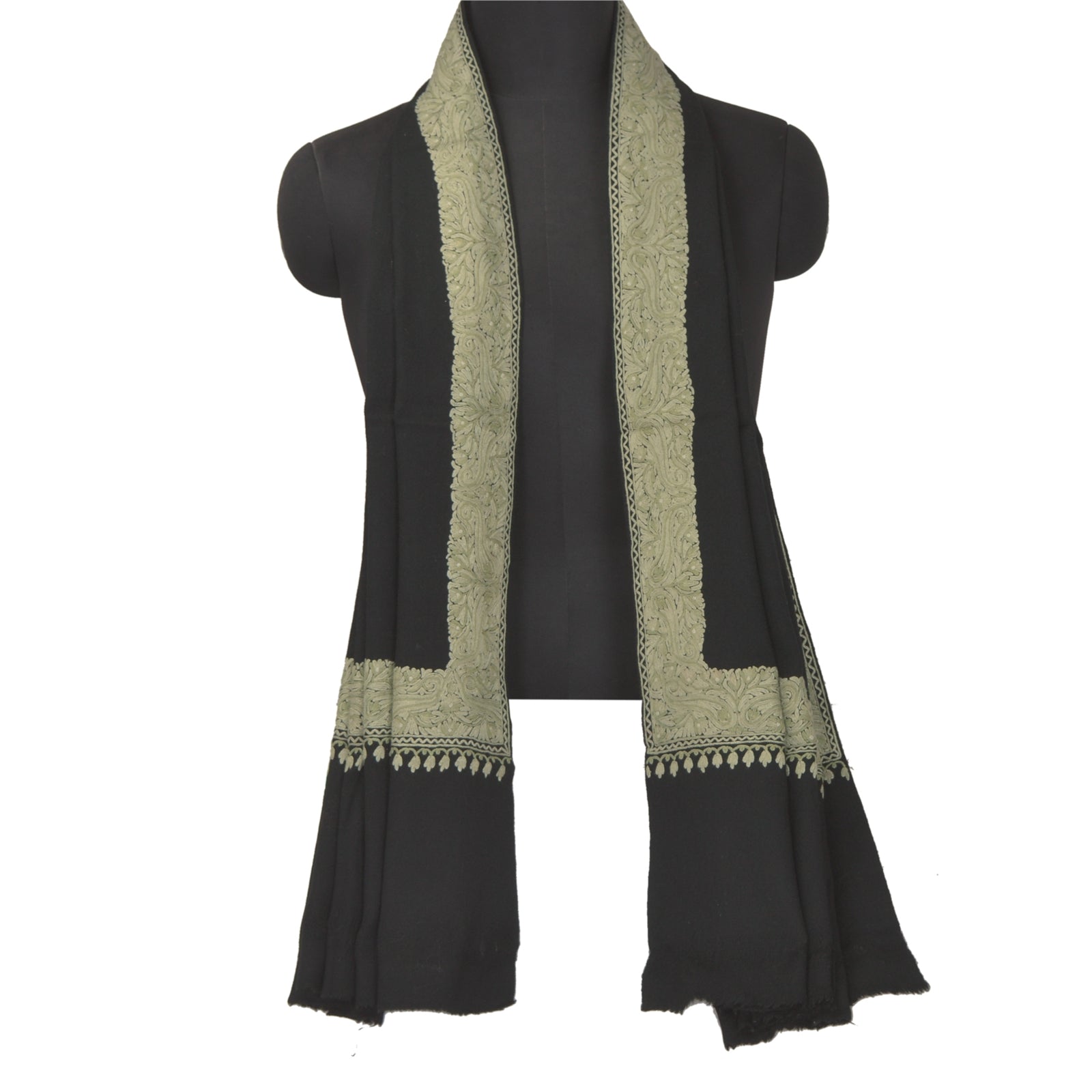 We are offering you a vintage black colored hand embroidered Ari work woolen stole. The center portion of shawl features floral & paisley design with thread work .Border has green/cream thread work.This cozy, warm and fuzzy stole is soft against skin due to the mellow woolen Sustainable Fabric. A truly gorgeous piece which will also make an admirable gift.
