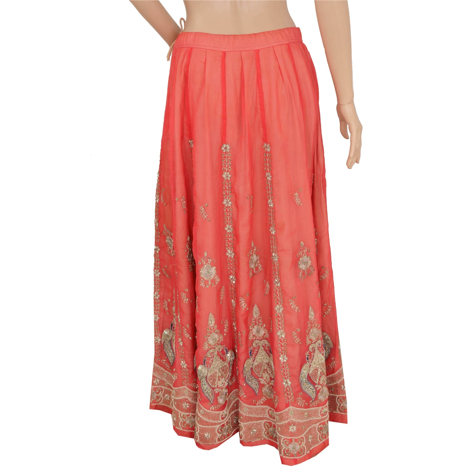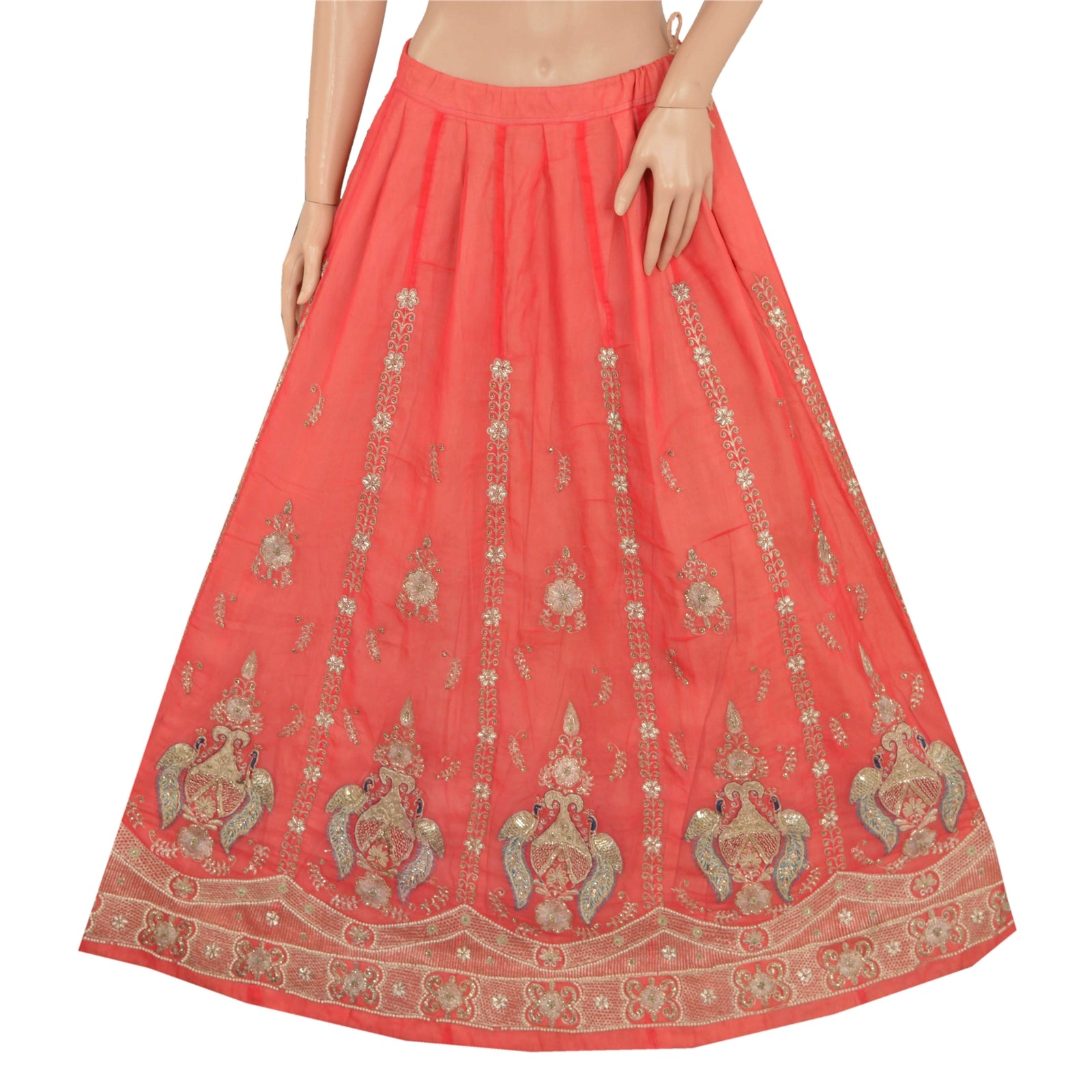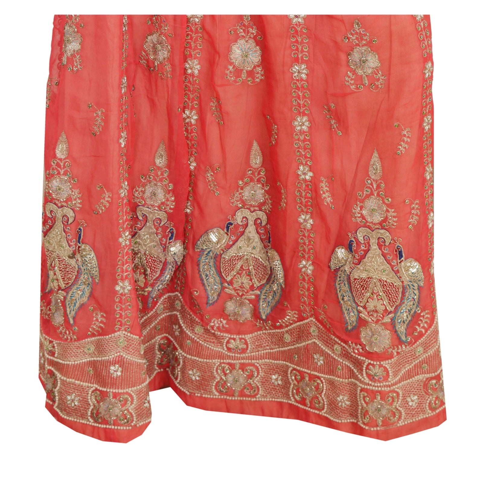 Sanskriti offers this vintage pink long skirt made with American georgette. The skirt has hand beaded Sustainable Fabric patch floral & peacock design embellished with pure metallic golden zari/zardozi/dabka/sequins, multi color glass beads/cream pearl like beads, blue/red threadwork. It is a stitched skirt with a length of 40 inch, hip is 40 inch and flare of the skirt is 159 inch. Flaunt this heavy skirt with ethnic tops, blouses or kurtis at parties, weddings and other occasions. The quality of zari work is amazing, its a pure metallic zari.