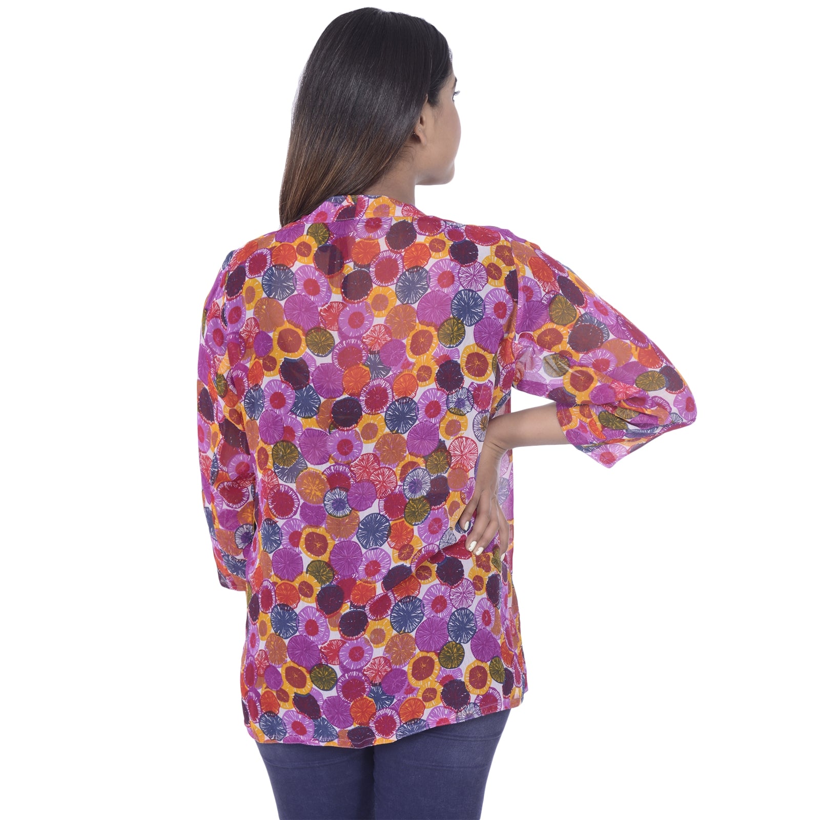 Sanskriti offers this short shrug in 100% pure georgette Sustainable Fabric. This shrug has circular print with bright colors like pink, red & yellow. Featuring short length with three-fourth sleeves and finished with half inch hemline. 0.2 SIZE:- Free Size