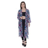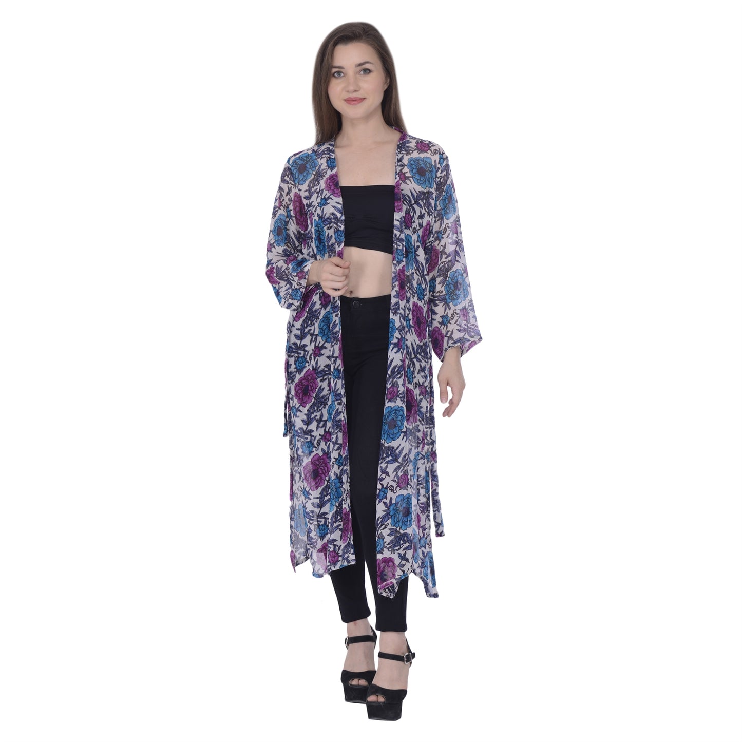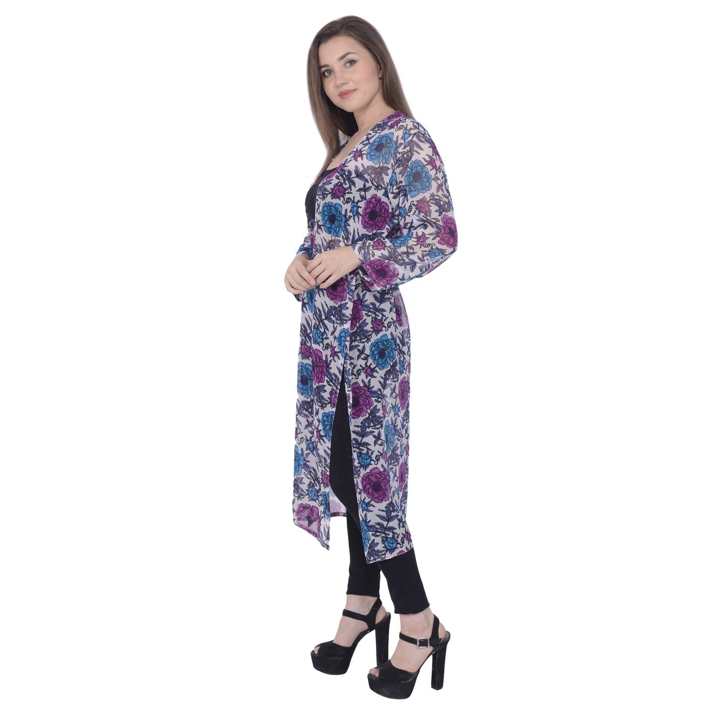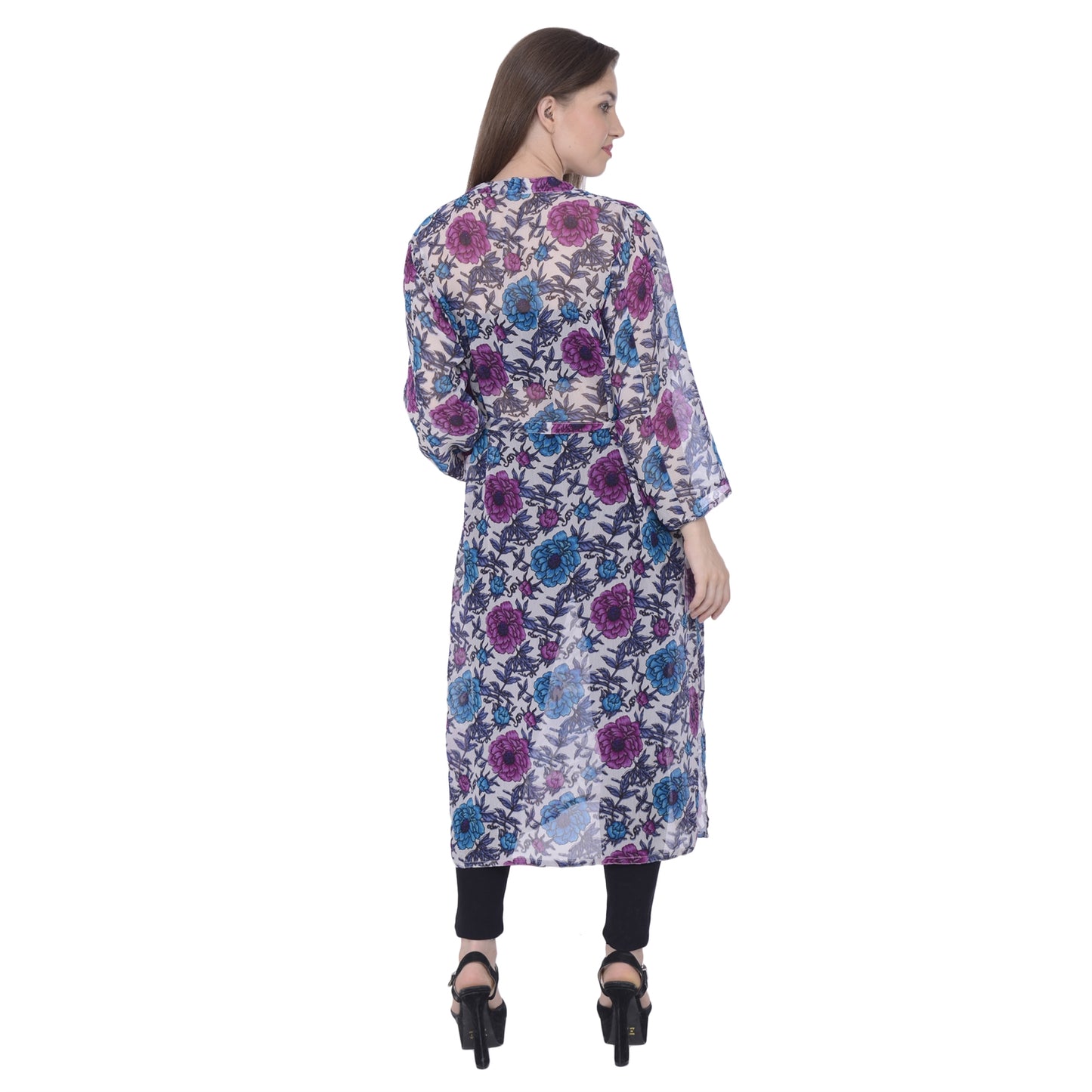 Sanskriti offers this straight shrug made up from 100% pure georgette Sustainable Fabric. This shrug with purple and blue floral print on white base is good for a vacations. Featuring calf length, side slit and a belt. It has full sleeves finished with half inch hemline. 0.2 It is recommended to be kept away from extreme heat, fire and corrosive liquids to avoid any form of damage. SIZE:- Free size. LENGTH:- 44.