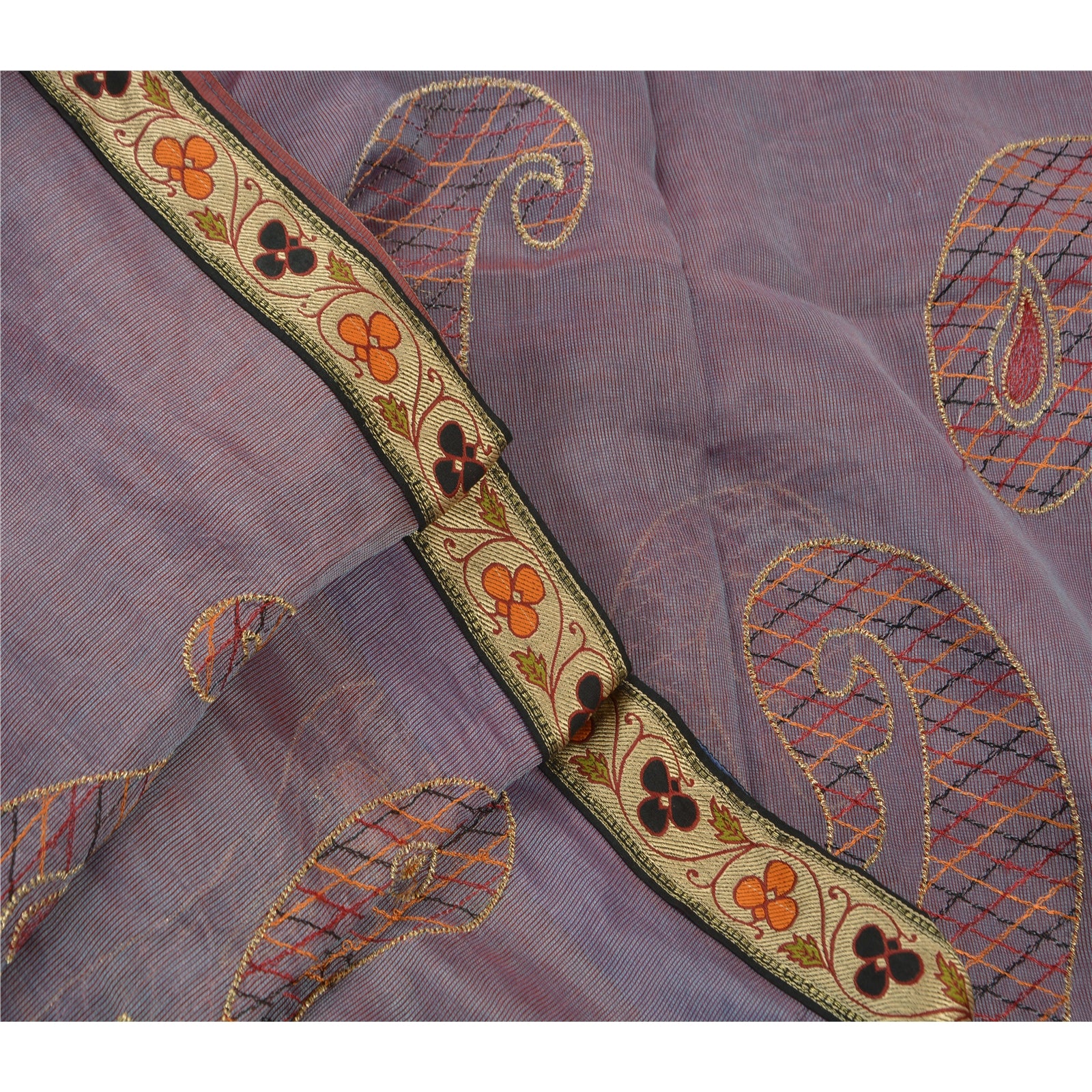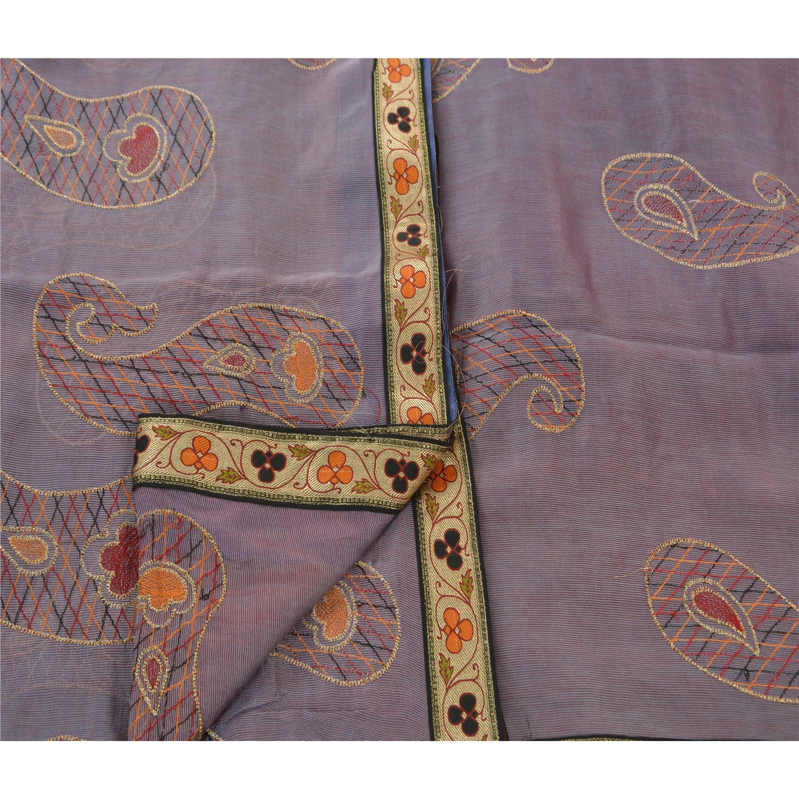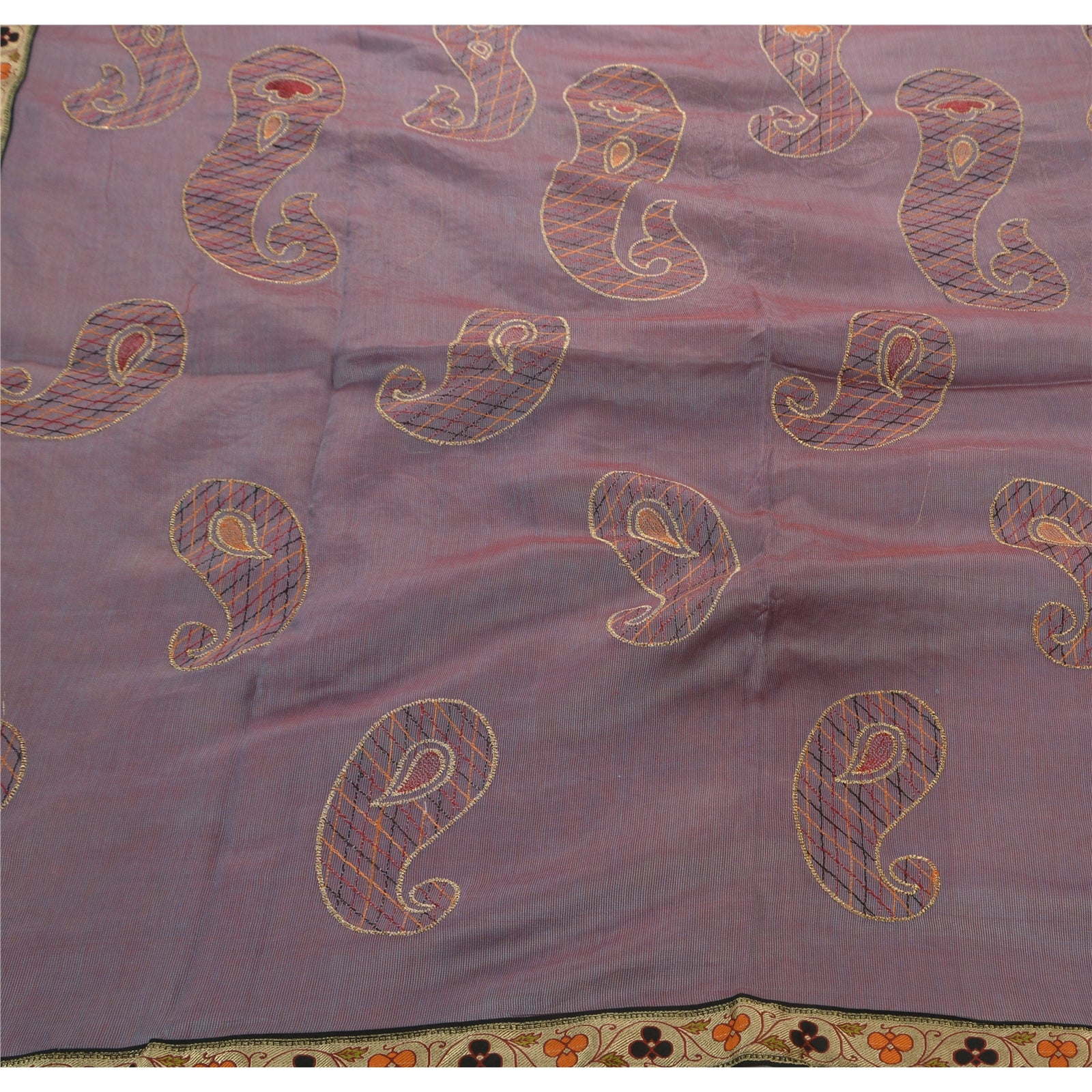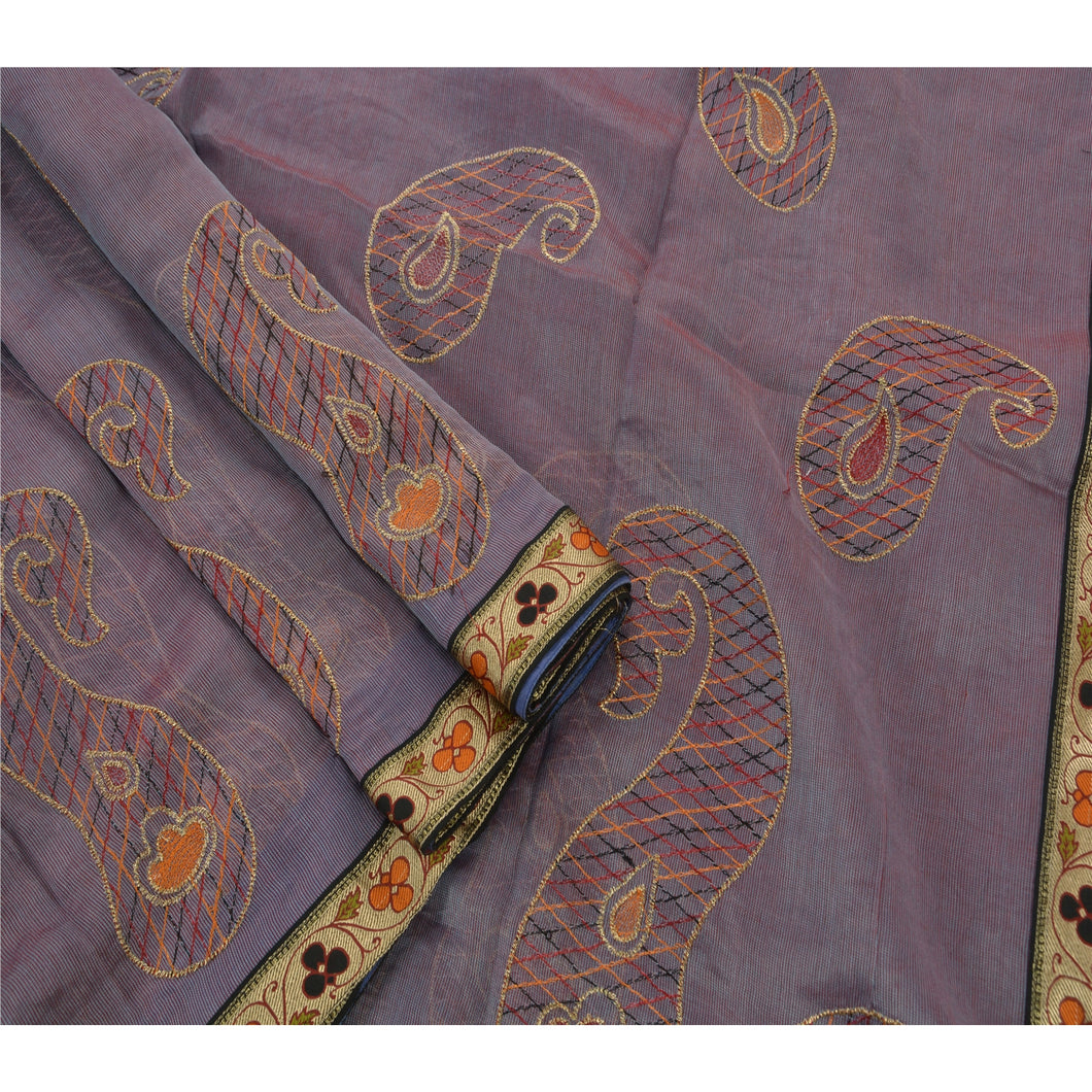 ? Beautiful purple colored embroidered silk blend sari ? All over sari features floral & paisley design embellished with saffron/maroon/gold/black thread work. ? There are woven cream Sustainable Fabric patch work with floral design on both sides of borders. What is special about this saree? Vibrant multi color thread work with paisley design on purple color base Sustainable Fabric is really enhancing the beauty of the saree. This unique vintage saree can be used for various crafting ideas even if you don't want to use it as a sari. Design a dress, use it as a throw, as window dressing, upholstery, sarongs, table linen and much more. Let your creative juices flow and use this decorated Sustainable Fabric in multiple fashion.