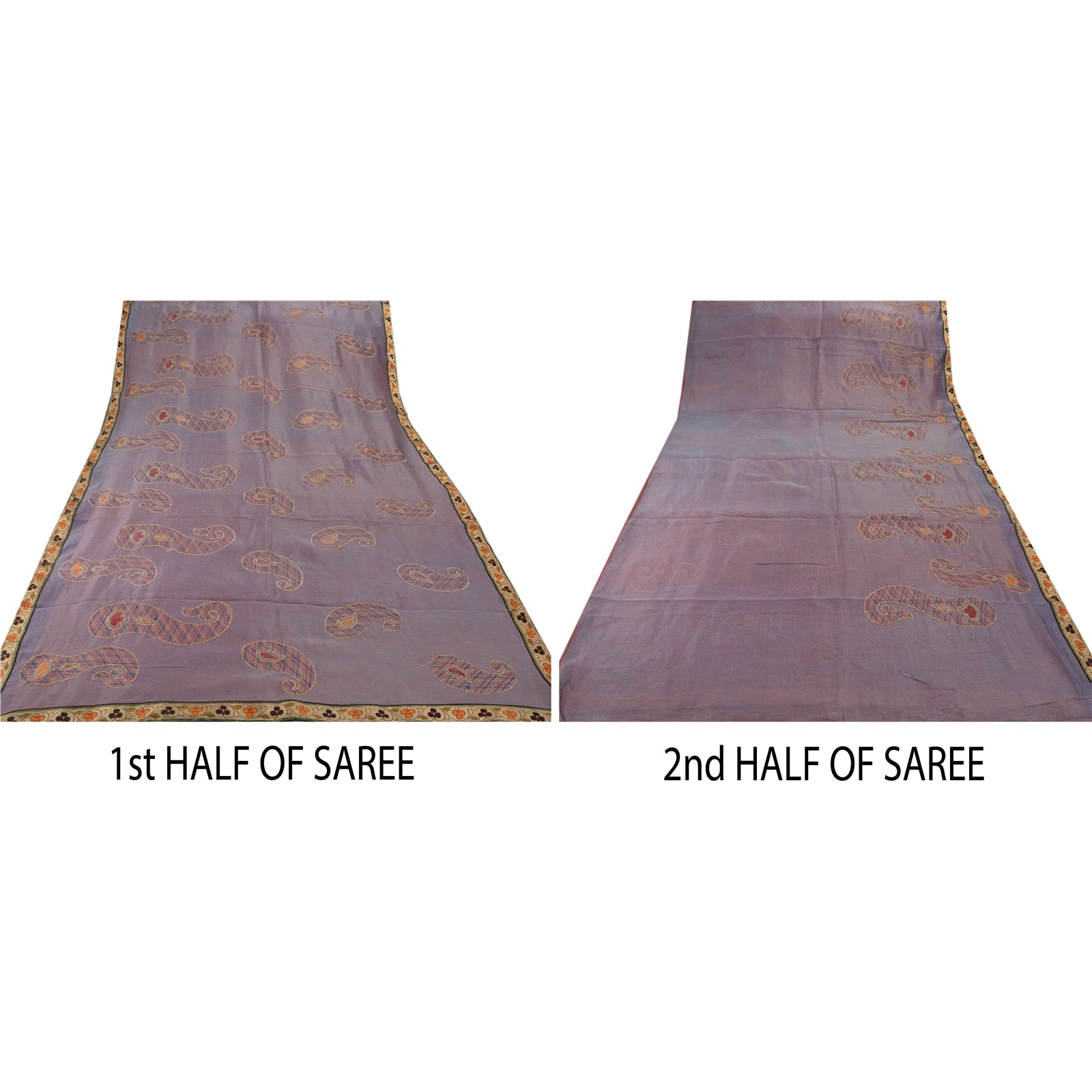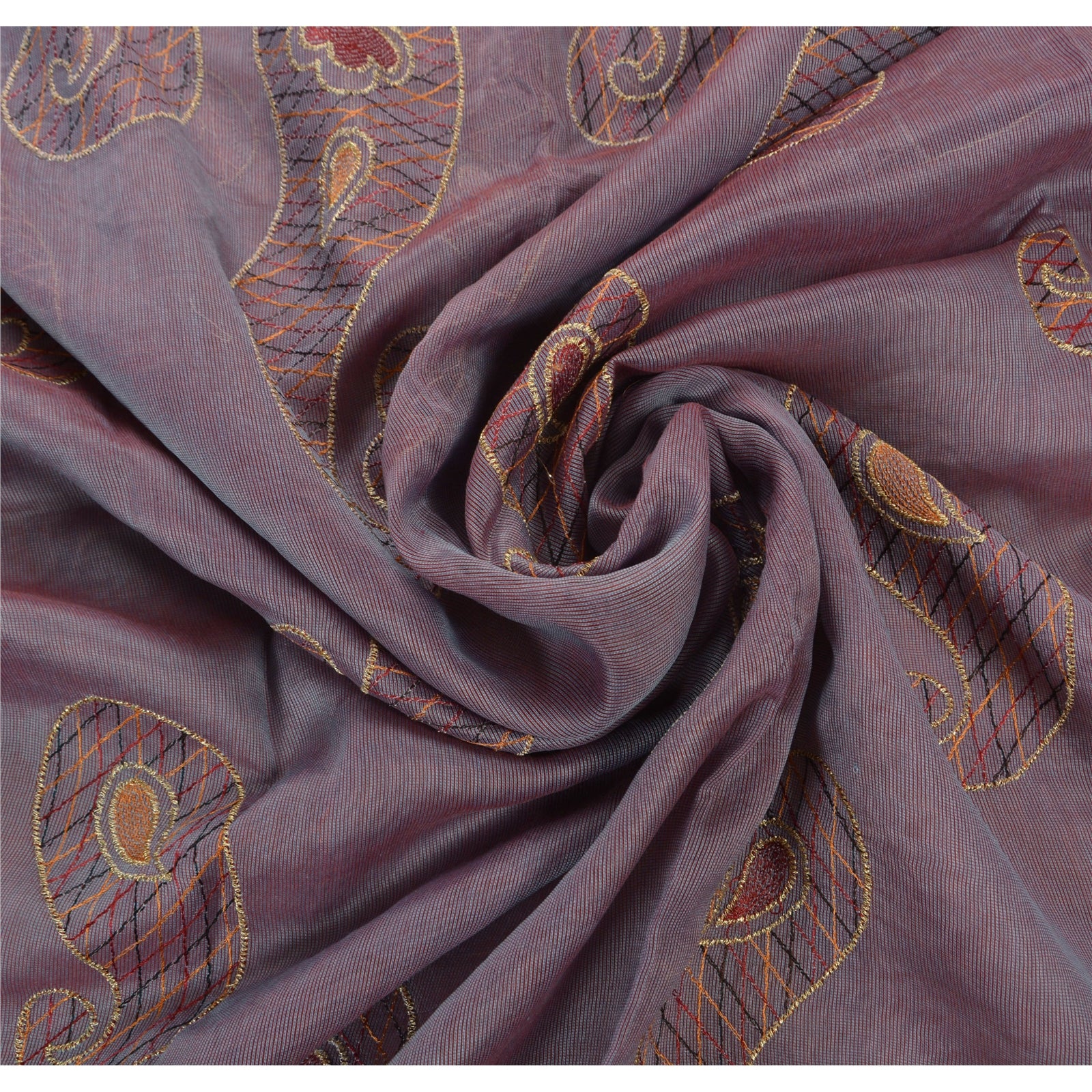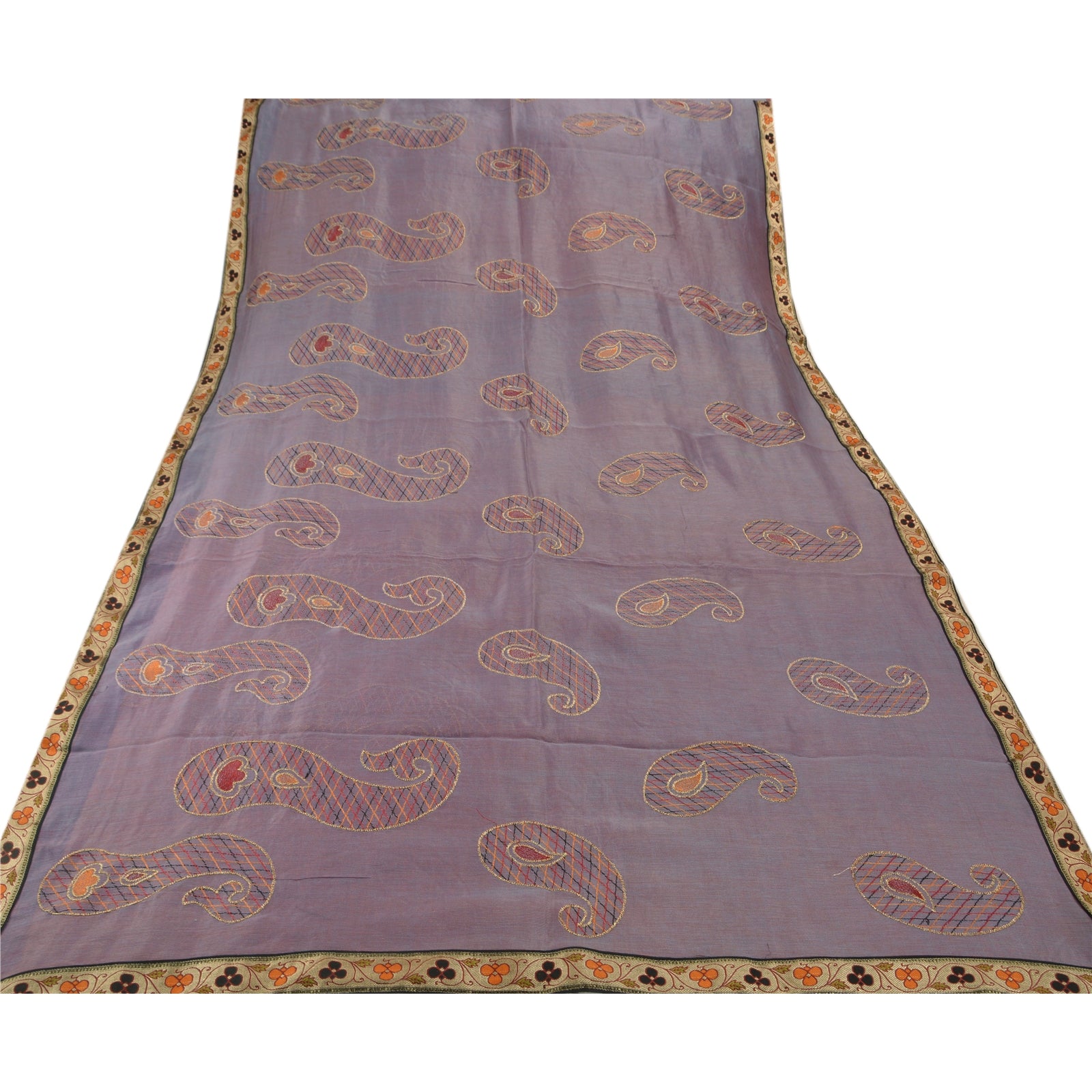 ? Beautiful purple colored embroidered silk blend sari ? All over sari features floral & paisley design embellished with saffron/maroon/gold/black thread work. ? There are woven cream Sustainable Fabric patch work with floral design on both sides of borders. What is special about this saree? Vibrant multi color thread work with paisley design on purple color base Sustainable Fabric is really enhancing the beauty of the saree. This unique vintage saree can be used for various crafting ideas even if you don't want to use it as a sari. Design a dress, use it as a throw, as window dressing, upholstery, sarongs, table linen and much more. Let your creative juices flow and use this decorated Sustainable Fabric in multiple fashion.