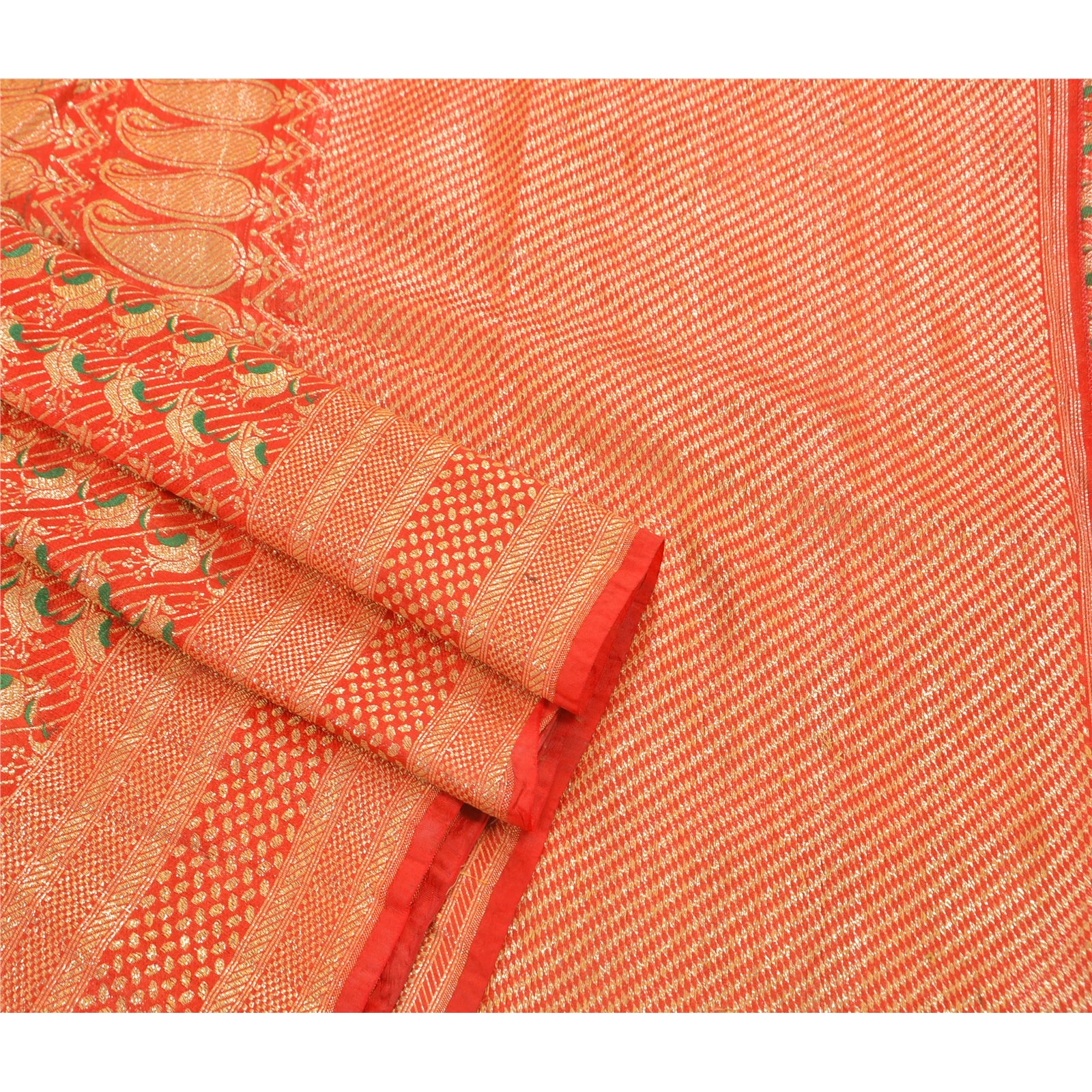 Available with us the beautiful Peach colored Art silk Sustainable Fabric sari This beautiful sari on a Art Silk Sustainable Fabric. The sari has the all-Over woven work with various geometrical designs with embedded green and golden thread work. Border and pallu of this saree is made with similar work showcasing various geometrical, paisley, floral and various distinctive designs Art silk is any synthetic fiber which resembles silk, but typically costs less to produce. Silk is a natural protein fiber, some forms of which can be woven into textiles. The shimmering appearance of silk is due to the triangular prism-like structure of the silk fiber, which allows silk cloth to refract incoming light at different angles, thus producing different colors. This beautiful saree with Peach base having woven work is enhancing the beauty of the saree.