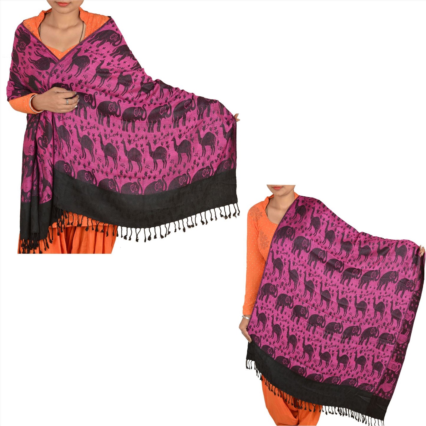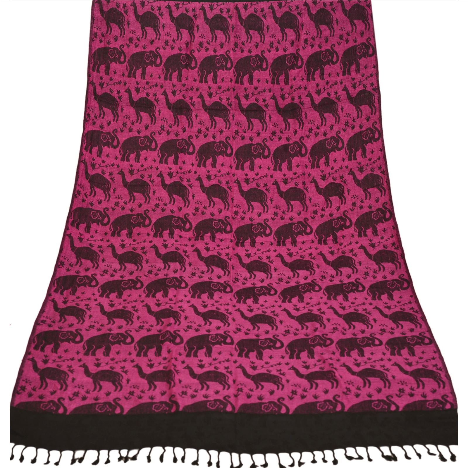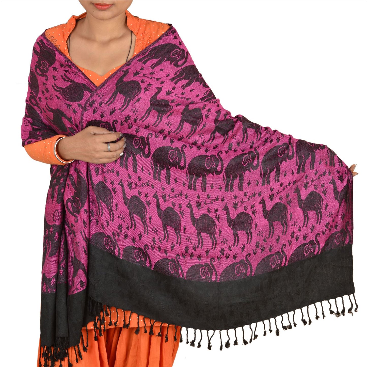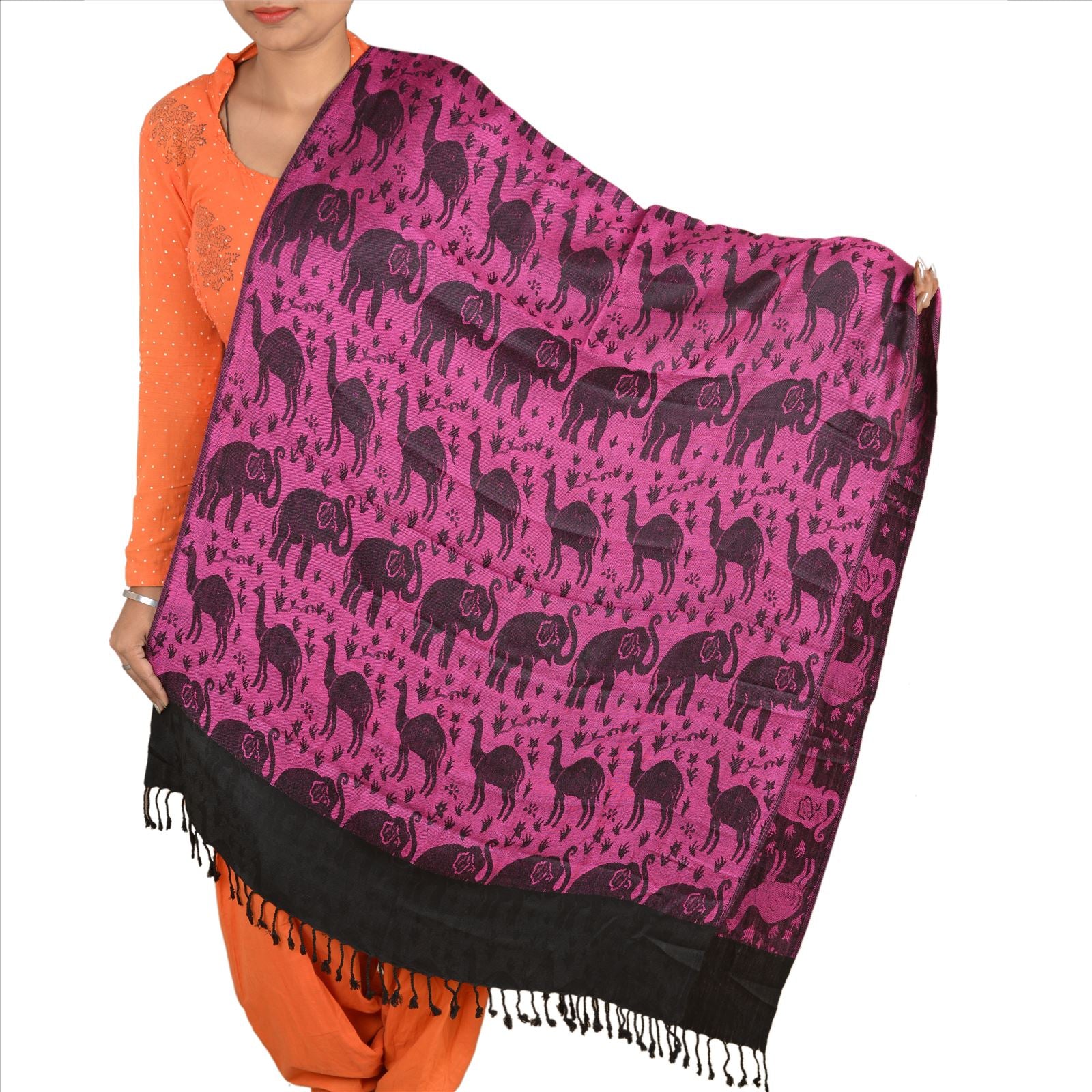 Fabulous woven wool (not pure woolen) shawl/scarf/stole. Cozy and gorgeously soft to touch, this shawl has beautiful woven camel and elephant design all over with in pink color. Shawl has black tassels on both edges. Wear this versatile piece as a scarf, stole or wrap. This cozy, warm and fuzzy stool is soft against skin due to the mellow woolen Sustainable Fabric. A truly gorgeous piece which will also make an admirable gift. International buyers please note: Import duties, taxes, and charges are not included in the item price or postage cost. These charges are the buyer's responsibility. Please check with your country's customs office to determine what these additional costs will be prior to bidding or buying. Buyer will pay custom duty/tax. It is calculated and charged differently by every country. As a seller I do not have any control over it.VAT or sales tax is calculated by the platform at the time of checkout. Customs charge is payable at the time of delivery.
