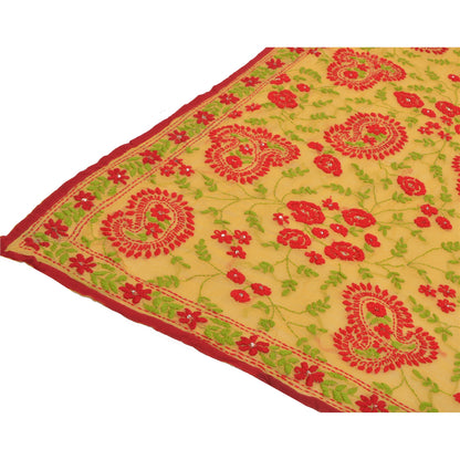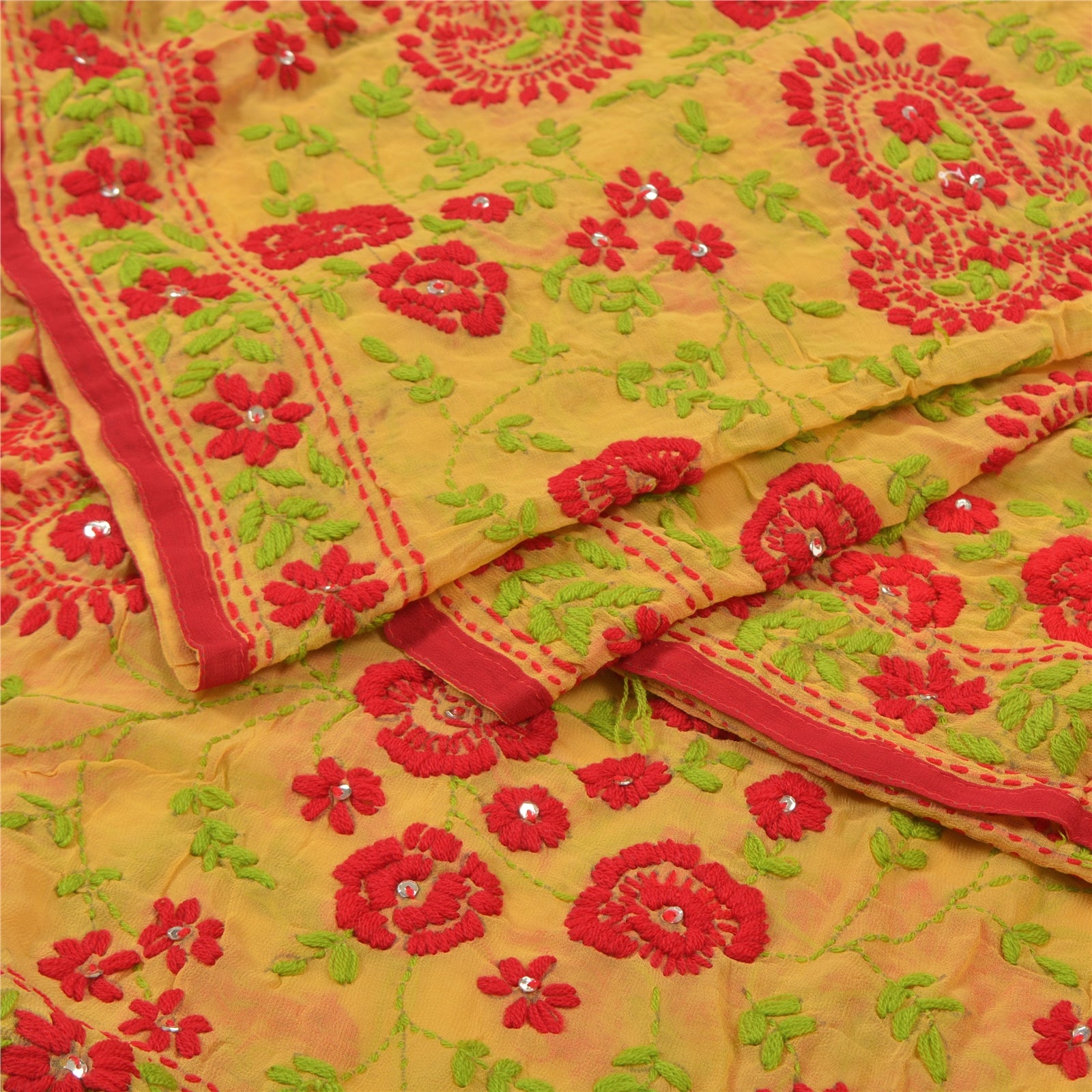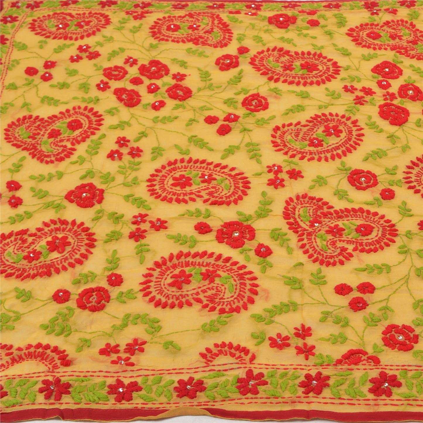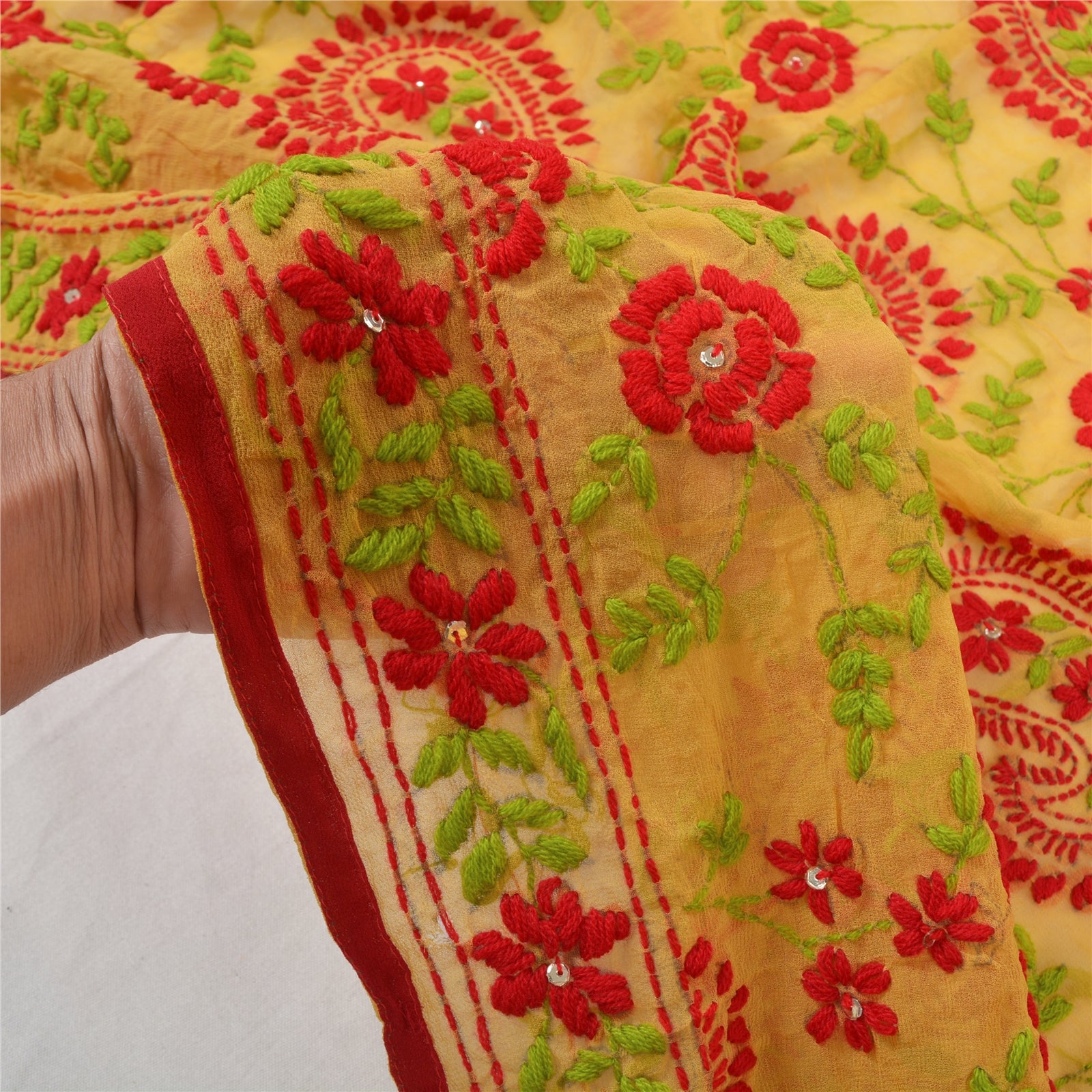 We Are Offering A Hand Embroidered Phulkari Work Georgette Sustainable Fabric Heavy Dupatta On Mustard Base It Has Beautiful Floral & Paisley Designs With Red & Green Wool Thread Work And Silver Sequins Work Adding Lovely Effect. You Can See Red Sustainable Fabric Patch Work On Borders Is Further Enhancing The Beauty Of The Dupatta. You Can Pair This Heavy Dupatta With Any Kind Of Plain Dress To Glam Up The Beauty In You. Phulkari Is A Dreamweaver For Every Punjabi Girl. Phulkari Means �Flower Work�, It Has A History Etched In The Culture Of Punjab. The Main Characteristics Of This Embroidery Are The Use Of Darn Stitch On The Wrong Side Of Cloth With Colored Silken And Wool Thread.