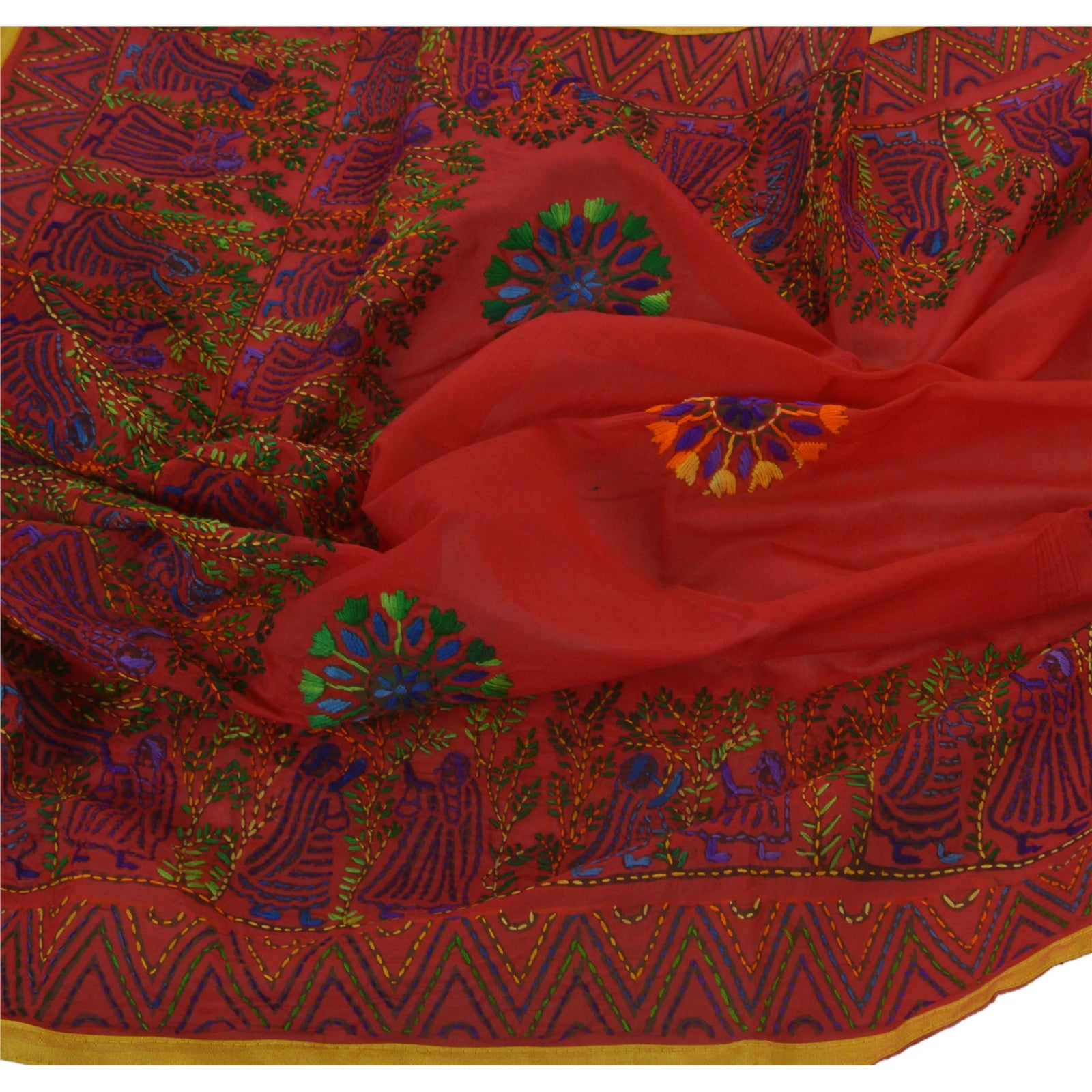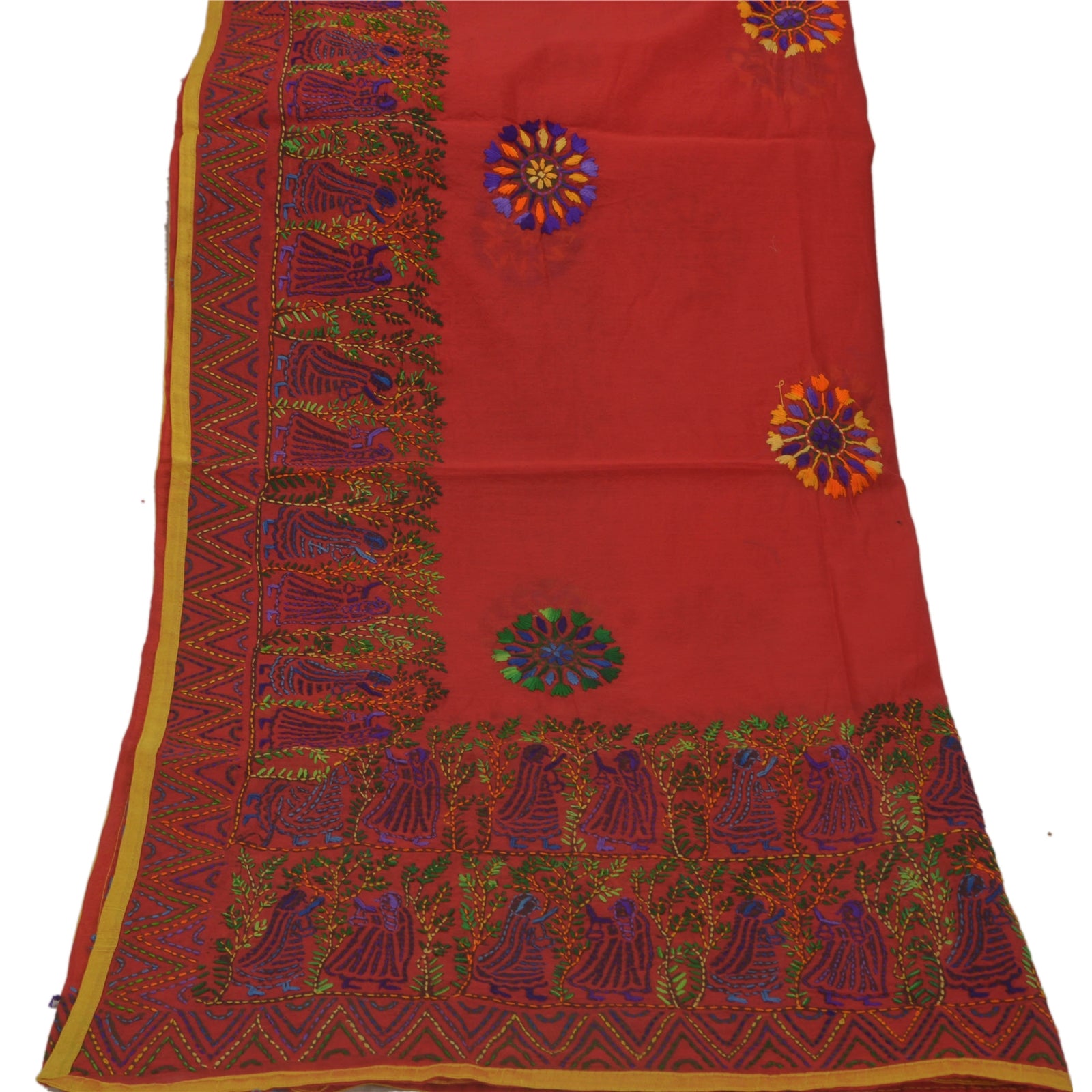 We Are Offering A Multi Coloured Painted Kantha Work Chanderi Silk Sustainable Fabric Heavy Dupatta On dark red Base. Chanderi Is A Traditional Ethnic Sustainable Fabric Characterized By Its Lightweight, Sheer Texture And Fine Luxurious Feel. Chanderi Sustainable Fabric Is Produced By Weaving In Silk And Golden Zari In The Traditional Cotton Yarn That Results In The Creation Of The Shimmering Texture. Traditionally, Chanderi Sustainable Fabric Was Primarily Used In Weaving Sarees And Salwar Kameez Material. Chanderi Sarees Are An Impeccable Choice For Summer Wear As Well As For Ceremonial Dressing Such As A Weddings Or Pujas. Kantha Is A Type Of Embroidery Typical Of Eastern South Asia. Kantha Is A Form Of Embroidery Often Practised By Rural Women. The Traditional Form Of Kantha Embroidery Was Done With Soft Dhotis And Saris, With A Simple Running Stitch Along The Edges. The Entire Cloth Is Covered With Running Stitches, Employing Beautiful Motifs Of Flowers, Animals Birds And Geometrical Shapes, As Well As Themes From Everyday Activities. This Dupatta Is Multi Coloured Painted On A Chanderi Silk Based Sustainable Fabric With Kantha Work On dark red Base. It Has Beautiful Floral And human Painted And Multi Coloured Thread Embroidered On It Giving A Beautiful And Elegant Look. You Can Pair This Heavy Dupatta With Any Kind Of Plain Dress To Glam Up The Beauty In You.