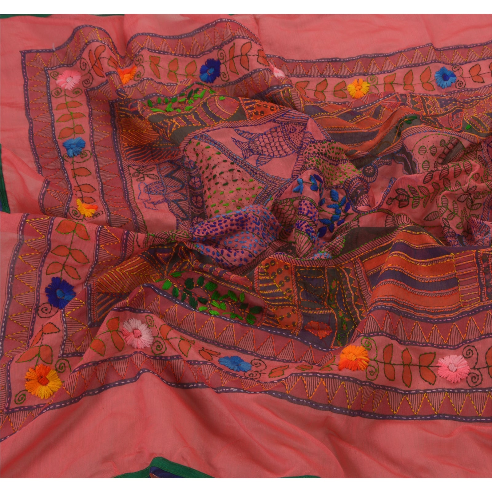 Sanskriti Vintage New Pink Heavy Dupatta Hand Embroidered Kantha Stole Chanderi Silk