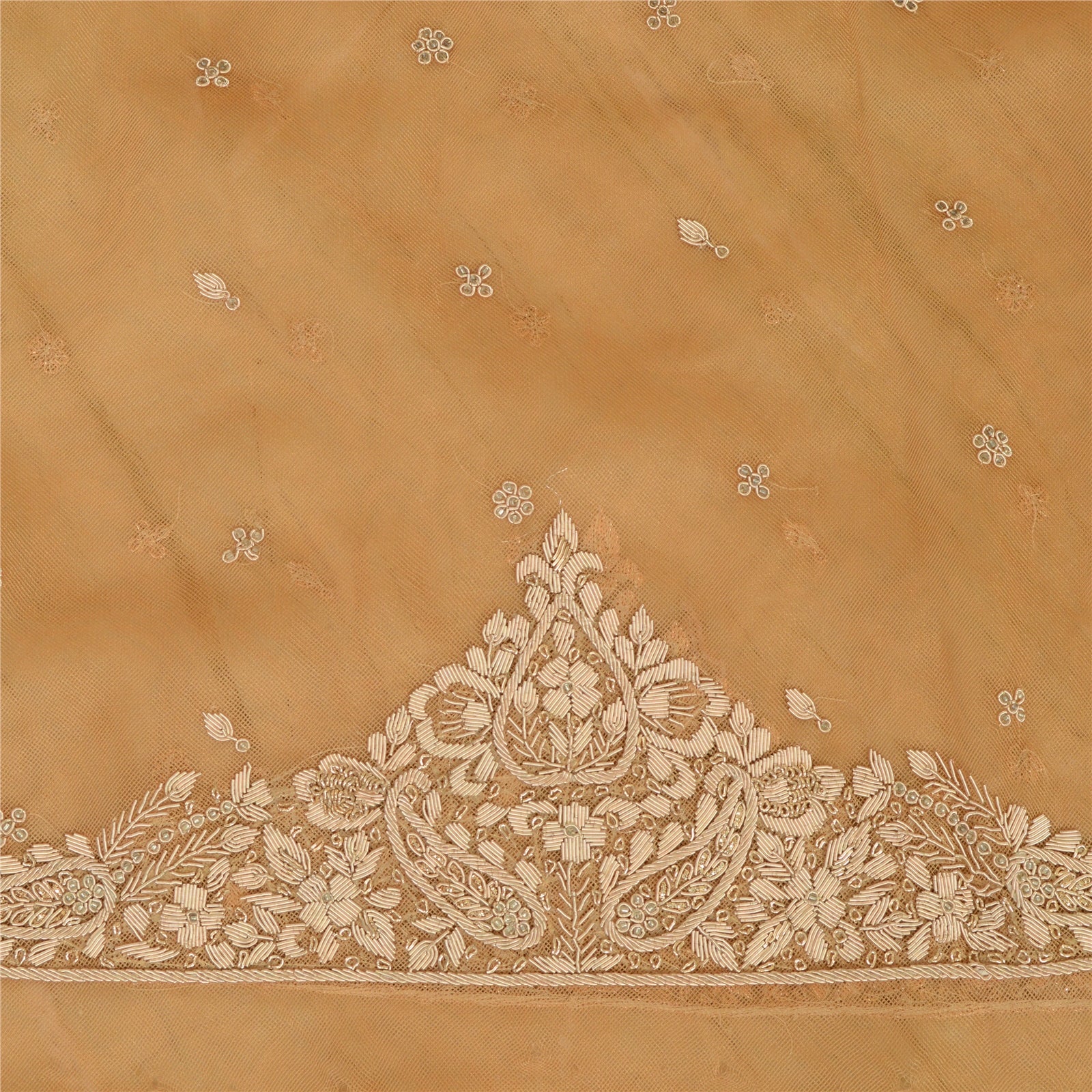 Sanskriti New Saffron Long Skirt Net Mesh Hand Beads Unstitched Zari Lehenga