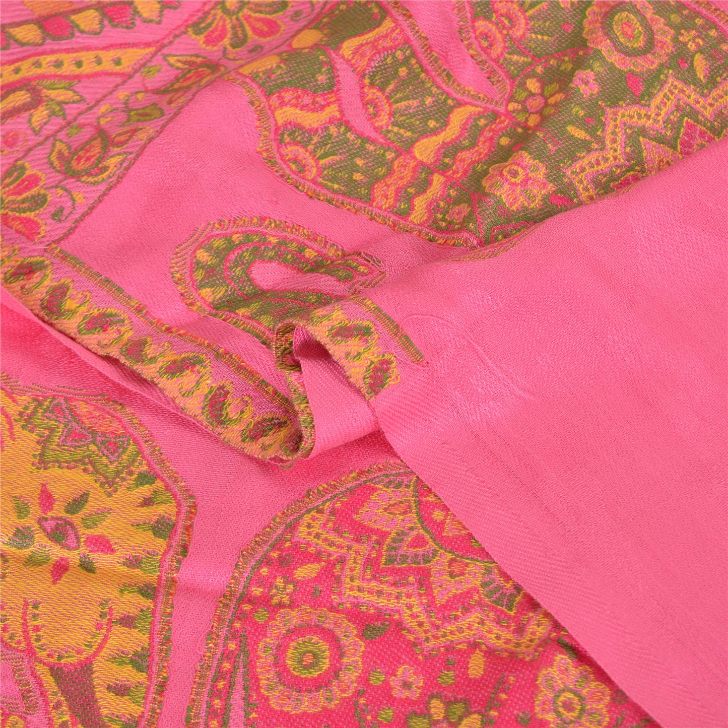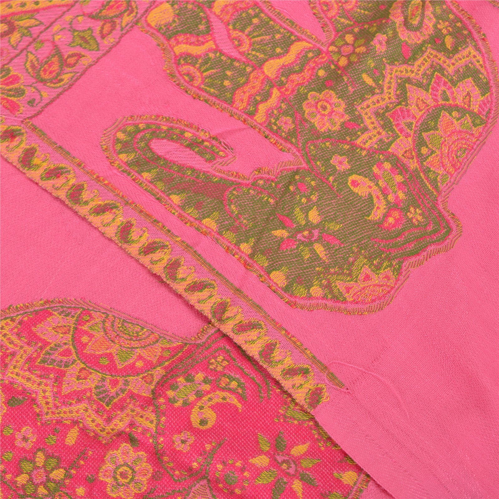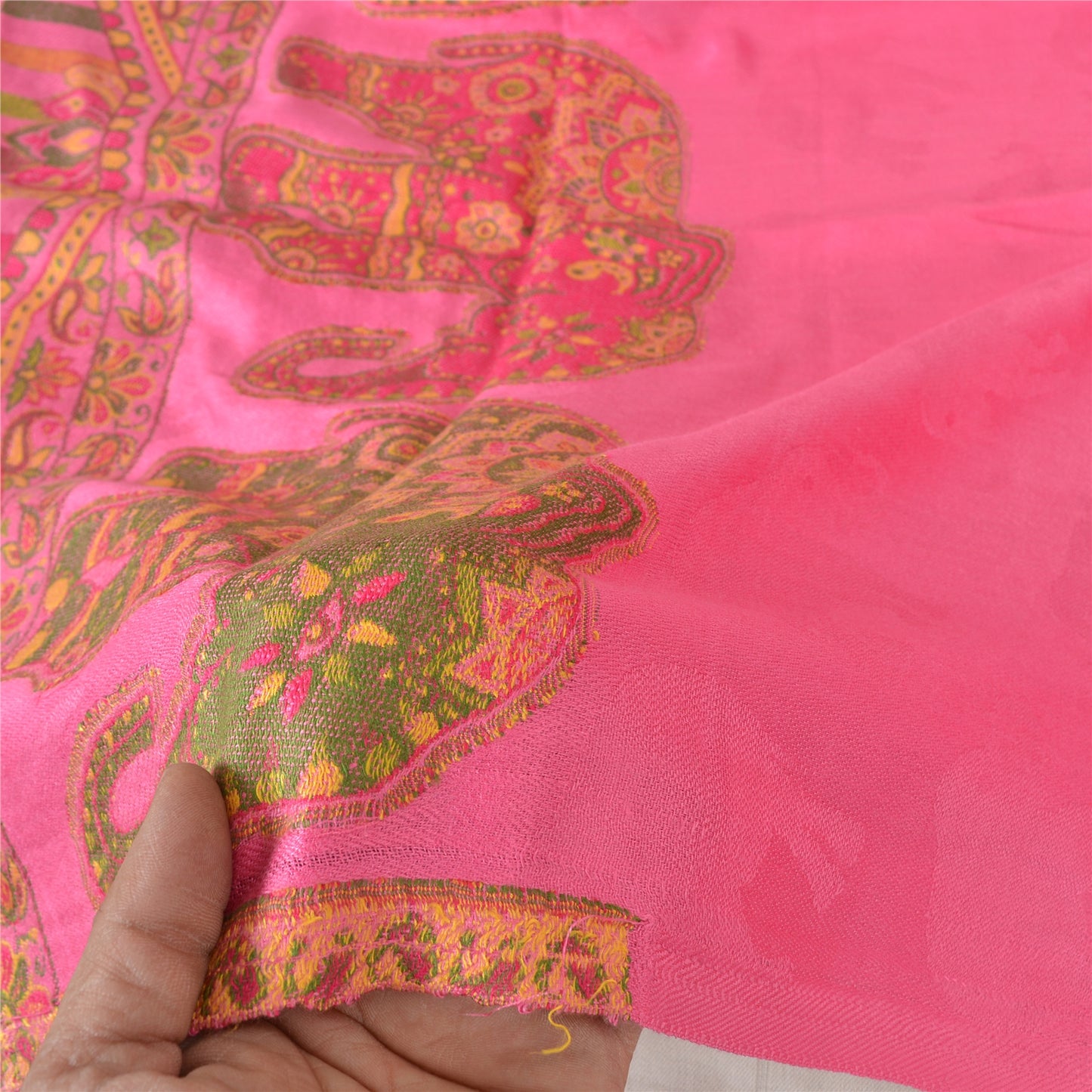 We are offering a Pink colored pure wool shawl with woven work . Woven Sustainable Fabric is any textile formed by weaving. A woven Sustainable Fabric is any Sustainable Fabric made by interlacing two or more threads at right angles to one another. This shawl has a woven plain Pink color poly wool base . The widen ends of the stole has elephant , floral, paisley and various Geometrical Designs in multi color like Red , yellow , orange and Green Thread Work also having pink color fringes giving it the nice look. Cozy and comfortable, you can wear this versatile piece as a scarf, stole or wrap on any dress. It is good for cold weather since it is warm. 'International buyers please note: Import duties, taxes, and charges are not included in the item price or postage cost. These charges are the buyer's responsibility. Please check with your country's customs office to determine what these additional costs will be prior to bidding or buying. Buyer will pay custom duty/tax. It is calculated and charged differently by every country. As a seller I do not have any control over it. VAT or sales tax is calculated by the platform at the time of checkout. Customs charge is payable at the time of delivery.'