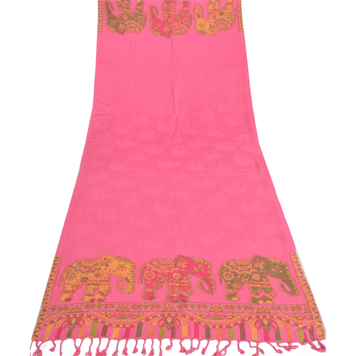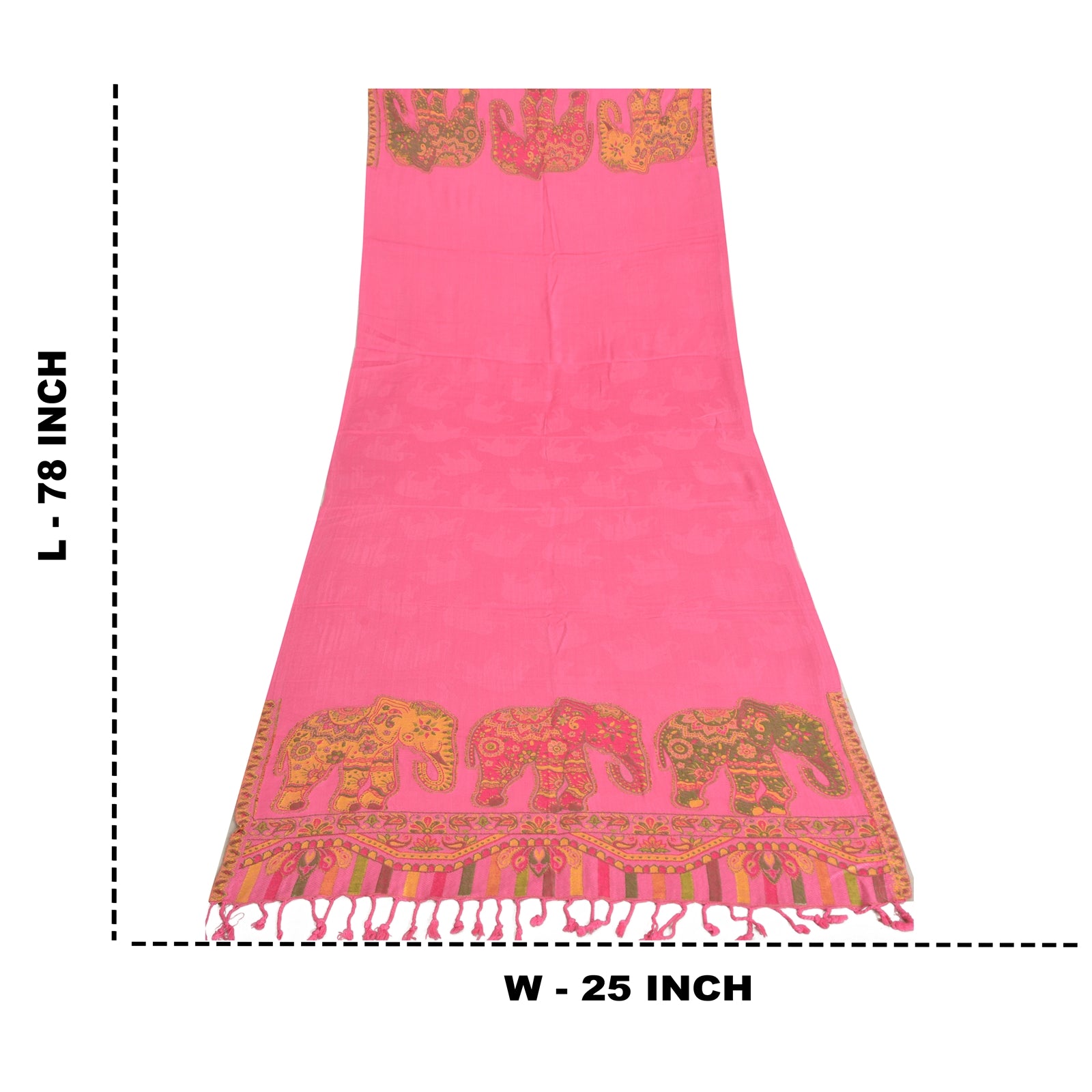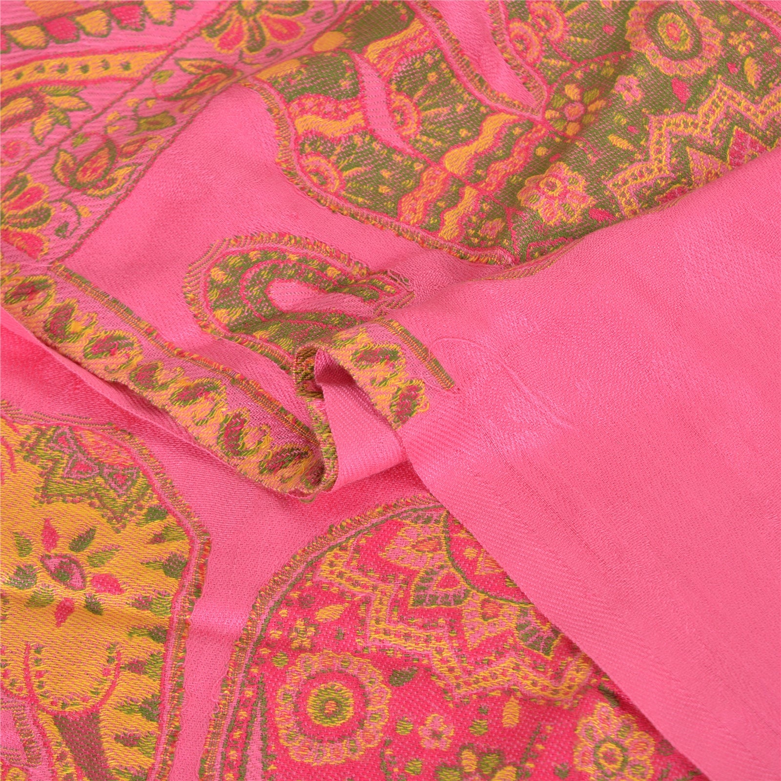 We are offering a Pink colored pure wool shawl with woven work . Woven Sustainable Fabric is any textile formed by weaving. A woven Sustainable Fabric is any Sustainable Fabric made by interlacing two or more threads at right angles to one another. This shawl has a woven plain Pink color poly wool base . The widen ends of the stole has elephant , floral, paisley and various Geometrical Designs in multi color like Red , yellow , orange and Green Thread Work also having pink color fringes giving it the nice look. Cozy and comfortable, you can wear this versatile piece as a scarf, stole or wrap on any dress. It is good for cold weather since it is warm. 'International buyers please note: Import duties, taxes, and charges are not included in the item price or postage cost. These charges are the buyer's responsibility. Please check with your country's customs office to determine what these additional costs will be prior to bidding or buying. Buyer will pay custom duty/tax. It is calculated and charged differently by every country. As a seller I do not have any control over it. VAT or sales tax is calculated by the platform at the time of checkout. Customs charge is payable at the time of delivery.'