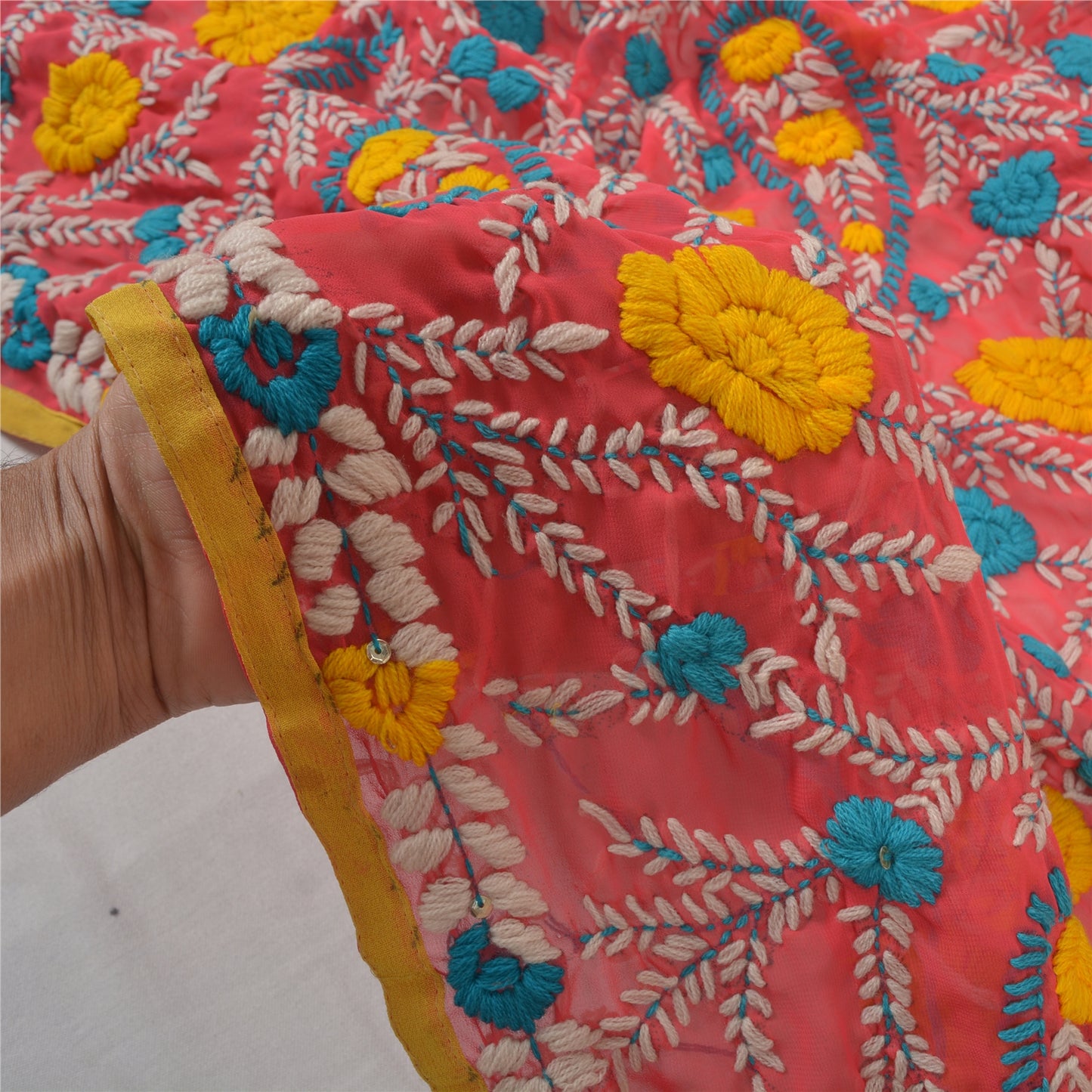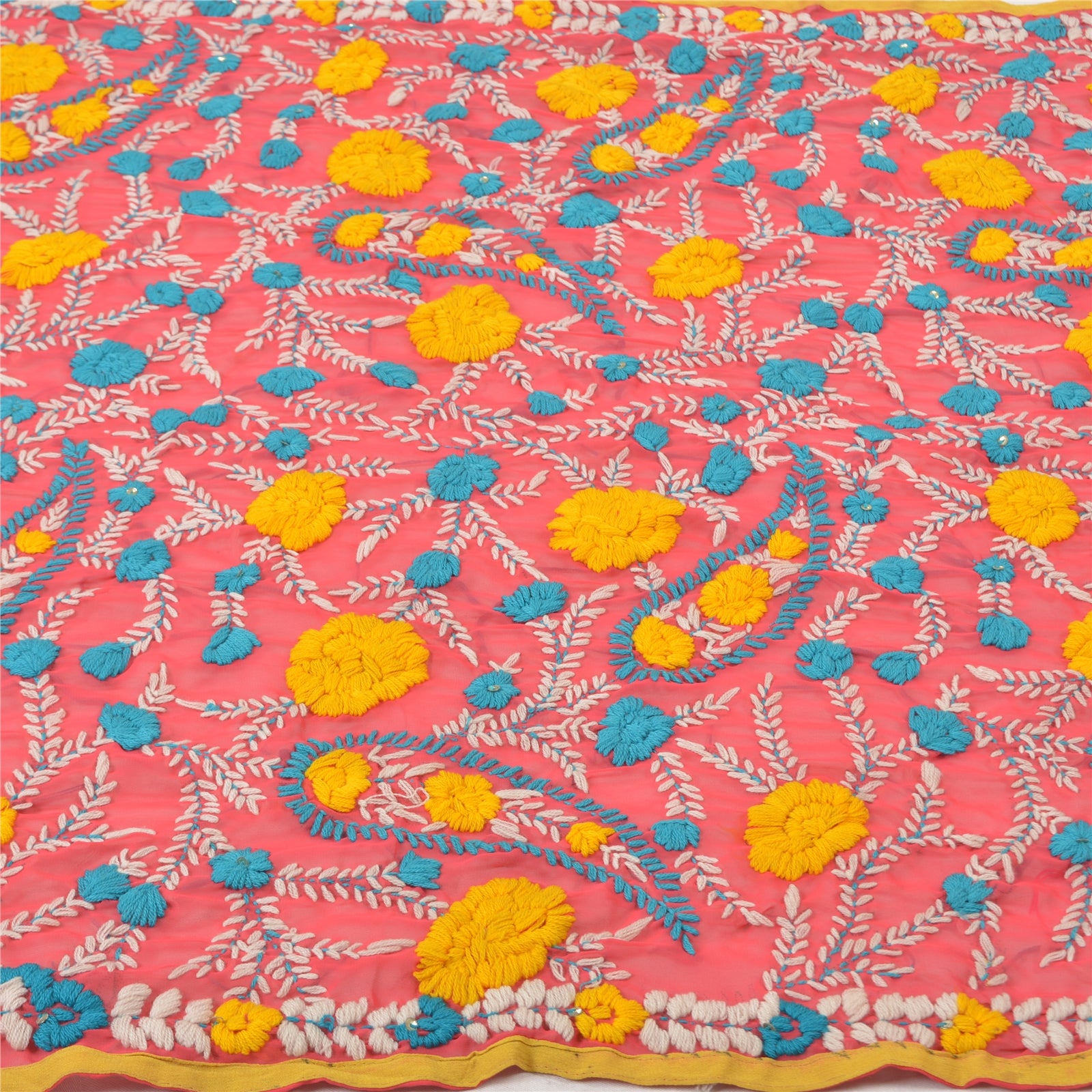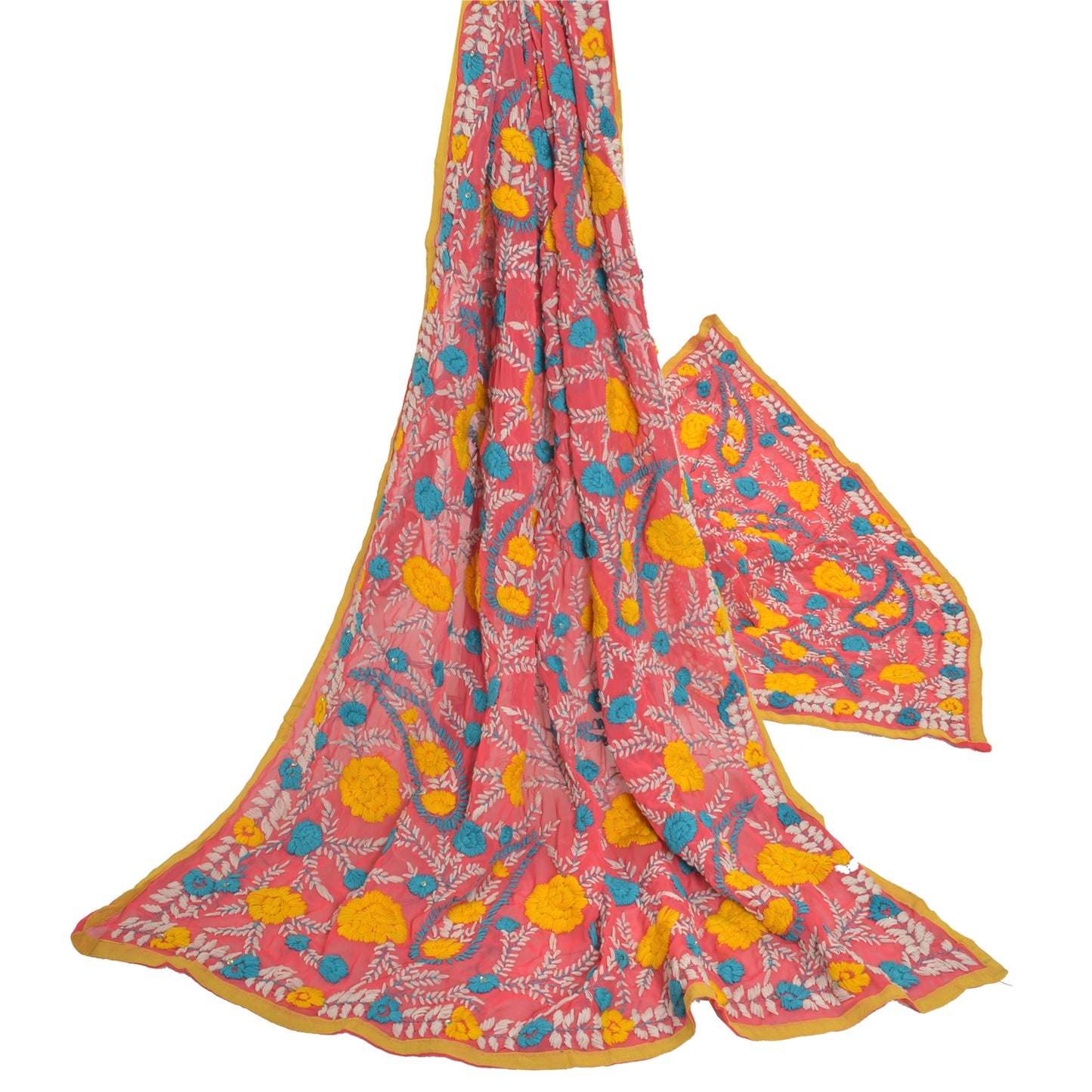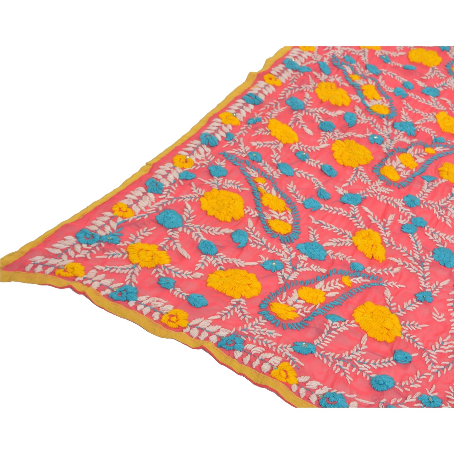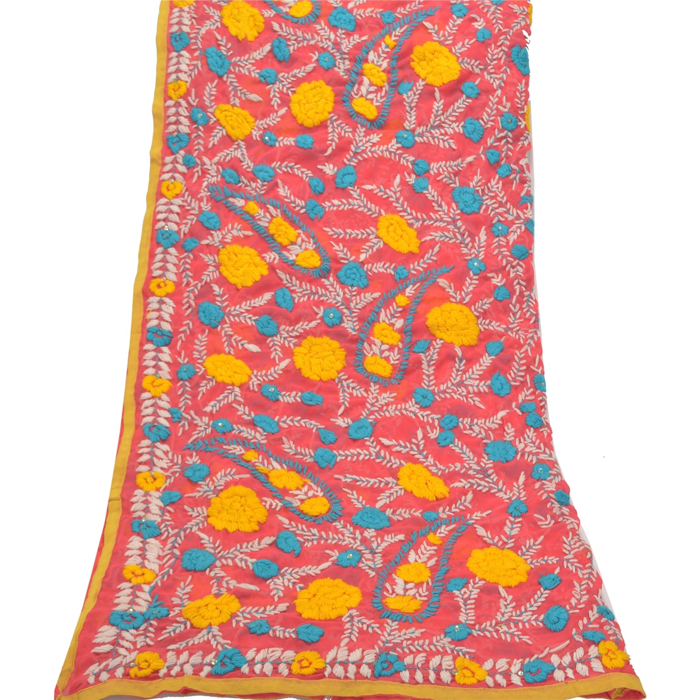 We Are Offering A Hand Embroidered Phulkari Work Georgette Sustainable Fabric Heavy Dupatta On Peach Base It Has Beautiful Floral & Paisley Designs With Multi Color Wool Thread Work And Golden Sequins Work Adding Lovely Effect. You Can See Yellow Sustainable Fabric Patch Work On Borders Is Further Enhancing The Beauty Of The Dupatta. You Can Pair This Heavy Dupatta With Any Kind Of Plain Dress To Glam Up The Beauty In You. Phulkari Is A Dreamweaver For Every Punjabi Girl. Phulkari Means �Flower Work�, It Has A History Etched In The Culture Of Punjab. The Main Characteristics Of This Embroidery Are The Use Of Darn Stitch On The Wrong Side Of Cloth With Colored Silken And Wool Thread.